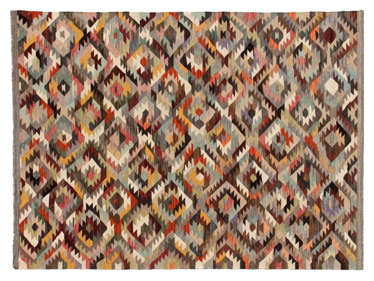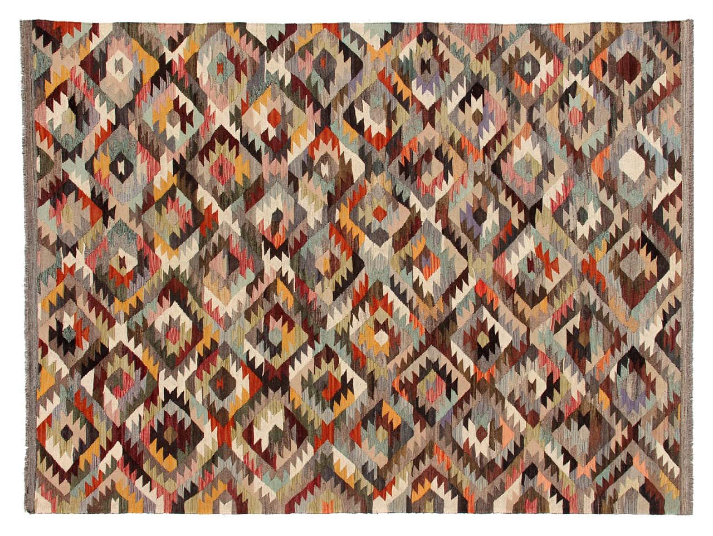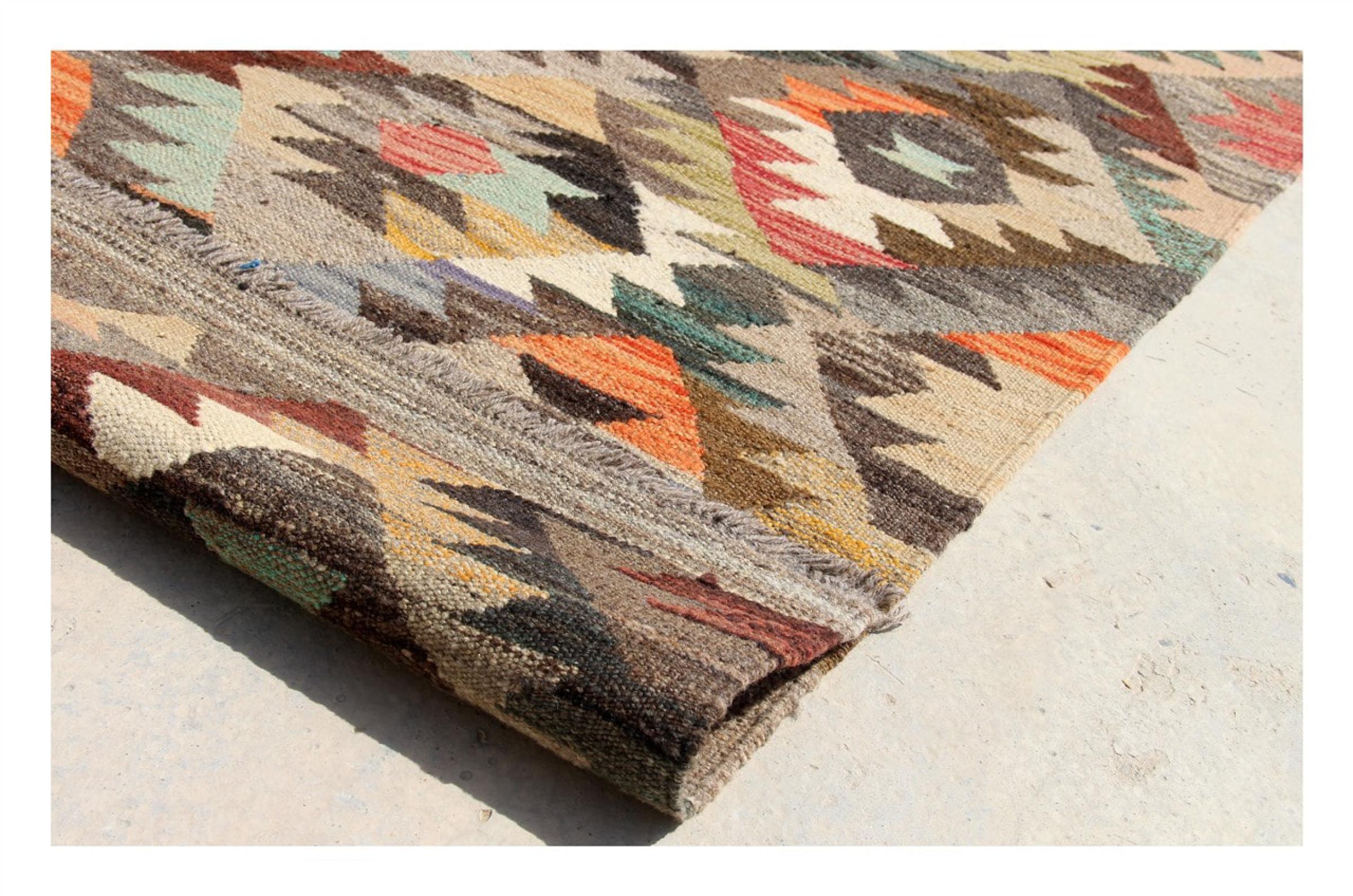 Estas alfombras kilim muestran una diferencia decisiva con las alfombras anudadas a mano - son tejidas a mano. Por lo tanto, no tienen un montón alto de lana y son a menudo más planos y más ásperos que las alfombras de lana anudada. Su fabricación es menos elaborada y por eso suelen ser mucho más baratas. Como ventaja, las alfombras de kilim son también mucho más ligeras y pueden ser colocadas por delante y por detrás. Los kilims tejidos a mano provienen originalmente de la antigua Persia y ahora también se fabrican a menudo en el Afganistán. Tienen patrones bastante simples y directos, que se deben a su técnica de tejido.