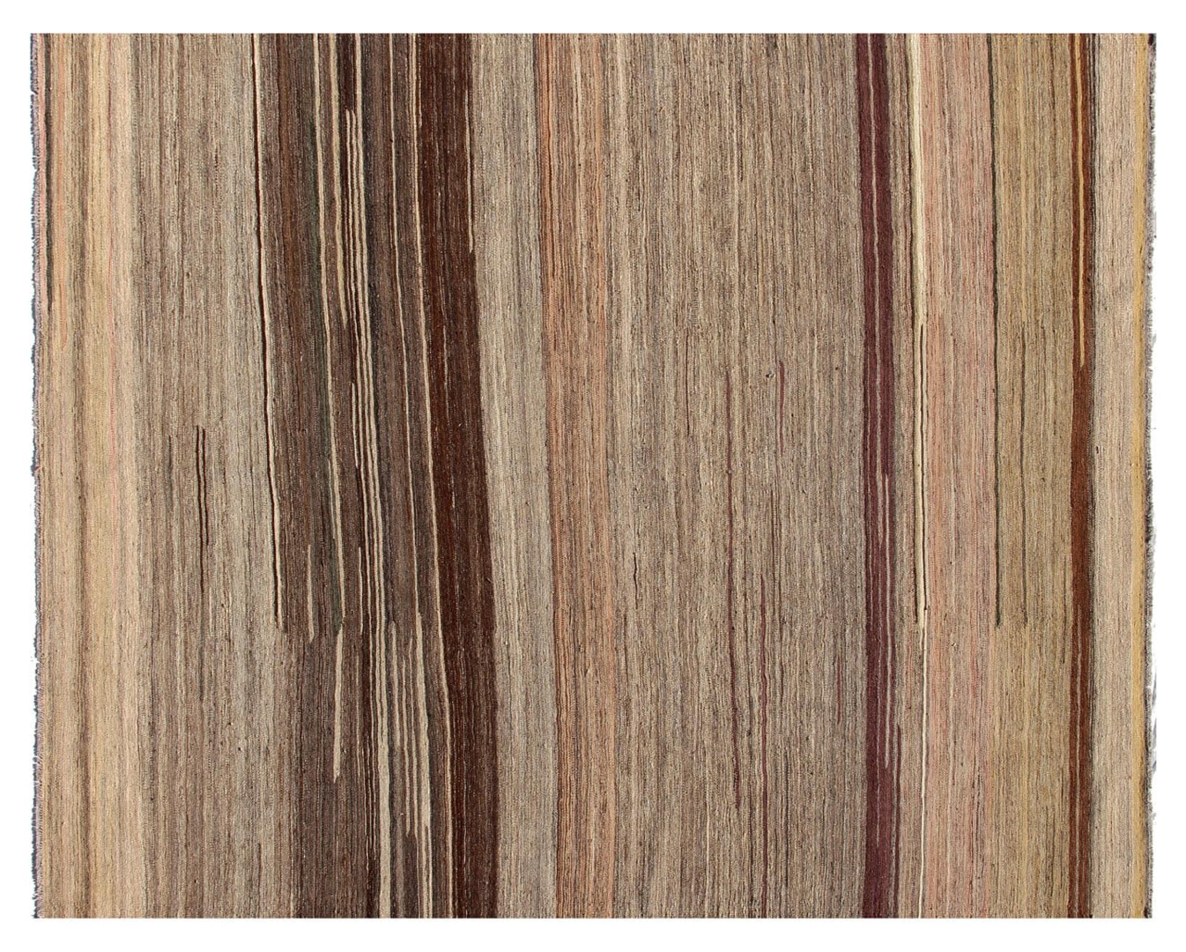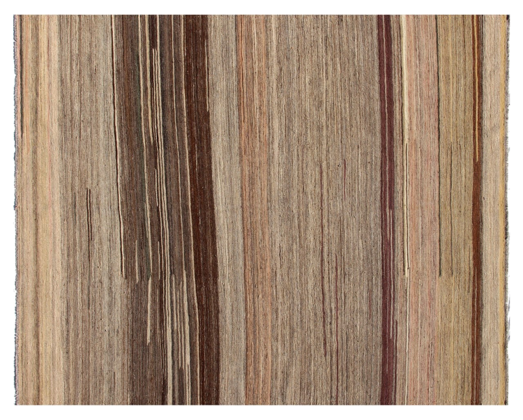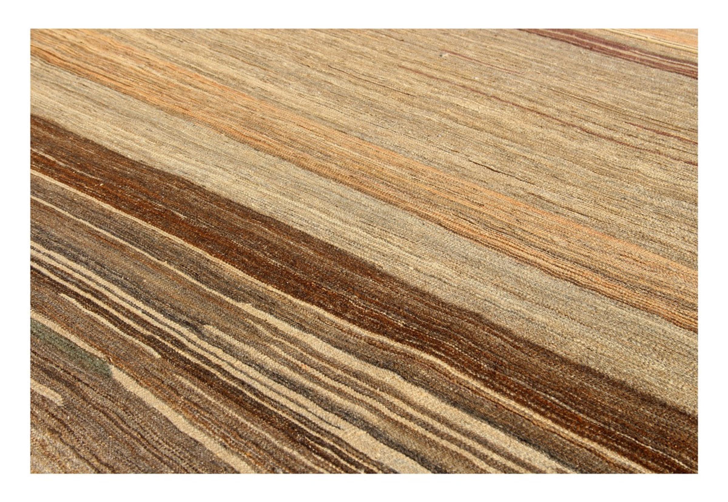 Esta alfombra fue hecha a mano en un telar como un tejido plano. Tejido plano es el término utilizado para describir las alfombras que no tienen pelo. Como el nombre promete, estas alfombras están tejidas y no anudadas. Esto resulta en una alfombra plana con una superficie estructurada. Los tejidos planos no son tan suaves y normalmente más delgados que las alfombras anudadas. Al mismo tiempo, su fabricación es mucho menos compleja y por lo general se pueden disponer por ambos lados (frontal y posterior). Sus patrones suelen ser geométricos, lo cual está determinado por el tejido.