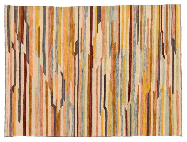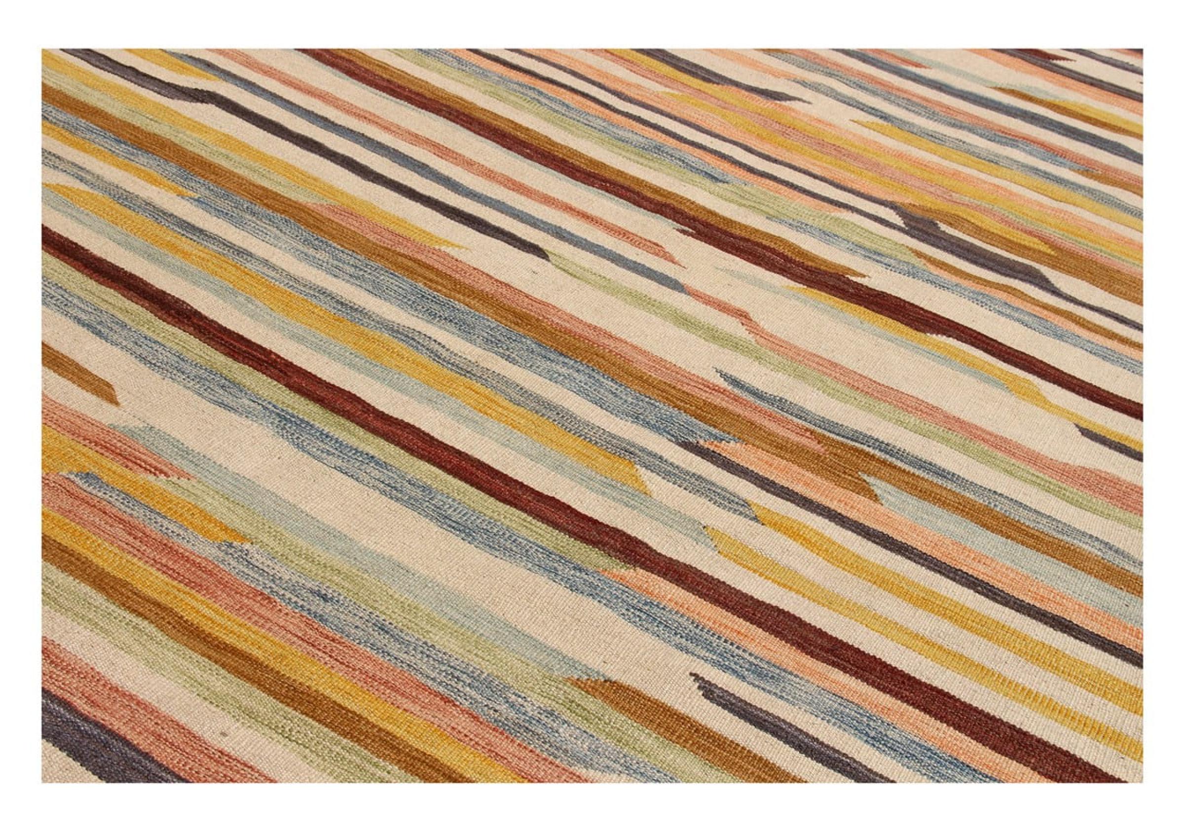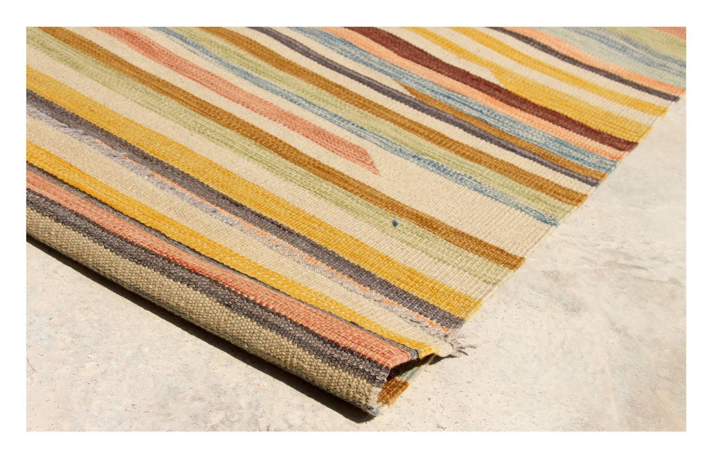 Esta alfombra fue hecha a mano en un telar como un tejido plano. Tejido plano es el término utilizado para describir las alfombras que no tienen pelo. Como el nombre promete, estas alfombras están tejidas y no anudadas. Esto resulta en una alfombra plana con una superficie estructurada. Los tejidos planos no son tan suaves y normalmente más delgados que las alfombras anudadas. Al mismo tiempo, su fabricación es mucho menos compleja y por lo general se pueden disponer por ambos lados (frontal y posterior). Sus patrones suelen ser geométricos, lo cual está determinado por el tejido.