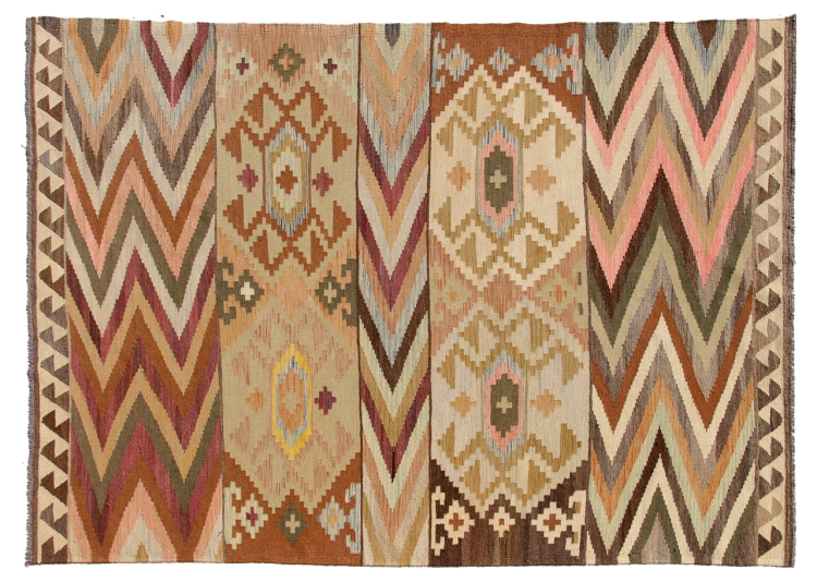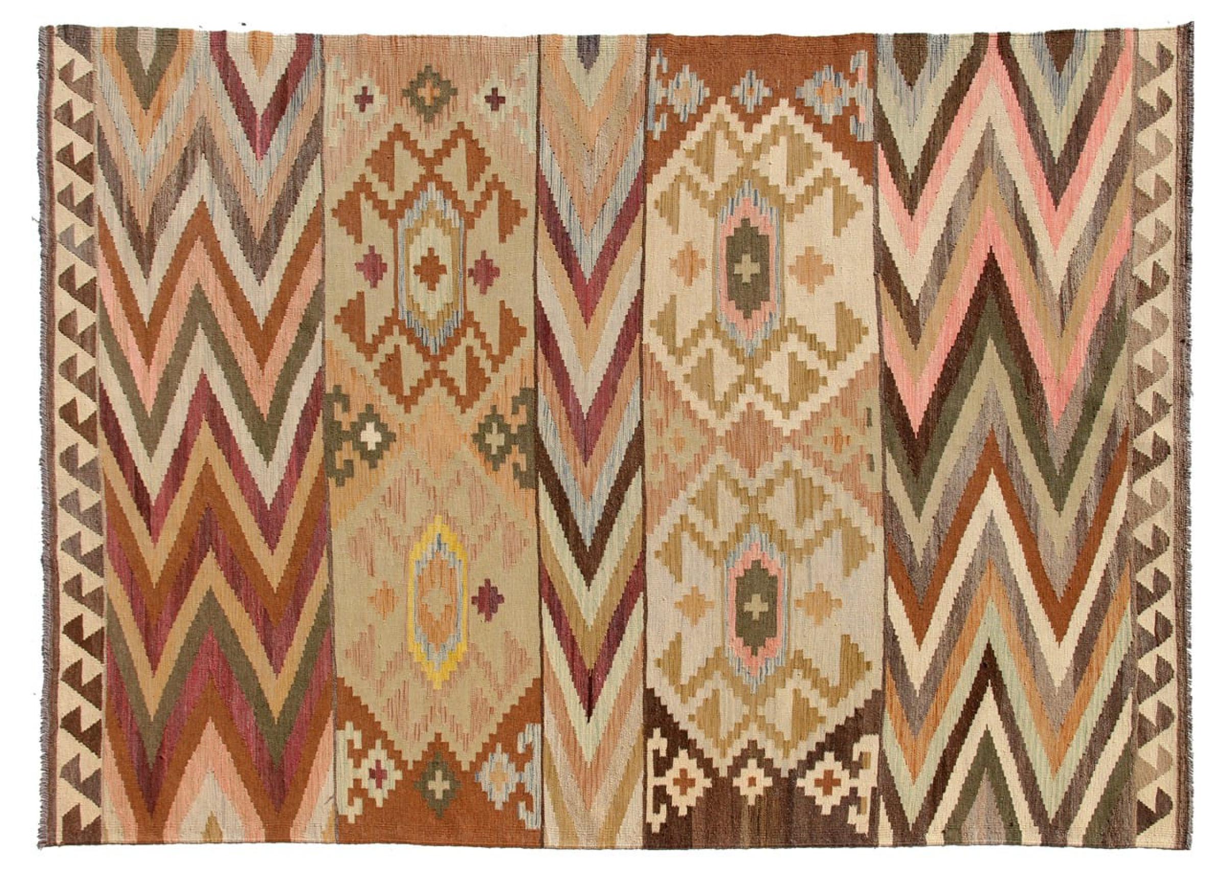 Estas alfombras kilim muestran una diferencia decisiva con las alfombras anudadas a mano - son tejidas a mano. Por lo tanto, no tienen un montón alto de lana y son a menudo más planos y más ásperos que las alfombras de lana anudada. Su fabricación es menos elaborada y por eso suelen ser mucho más baratas. Como ventaja, las alfombras de kilim son también mucho más ligeras y pueden ser colocadas por delante y por detrás. Los kilims tejidos a mano provienen originalmente de la antigua Persia y ahora también se fabrican a menudo en el Afganistán. Tienen patrones bastante simples y directos, que se deben a su técnica de tejido.