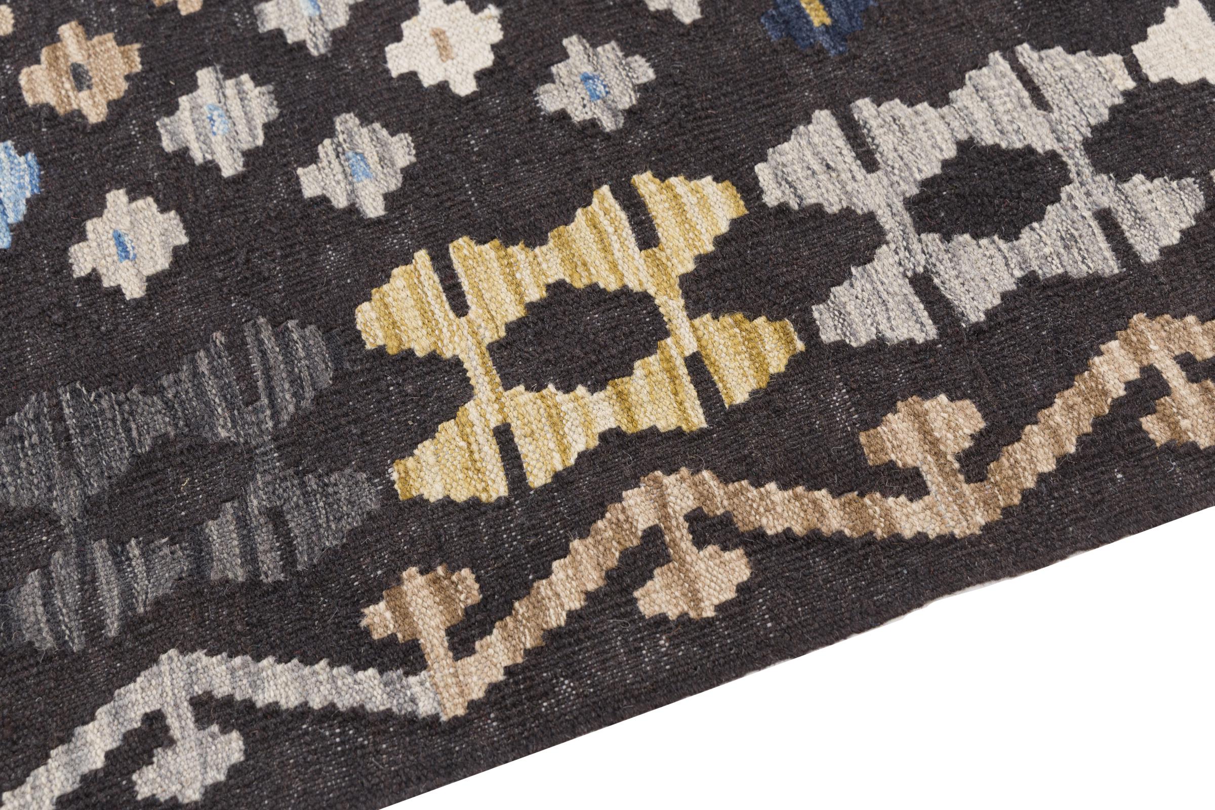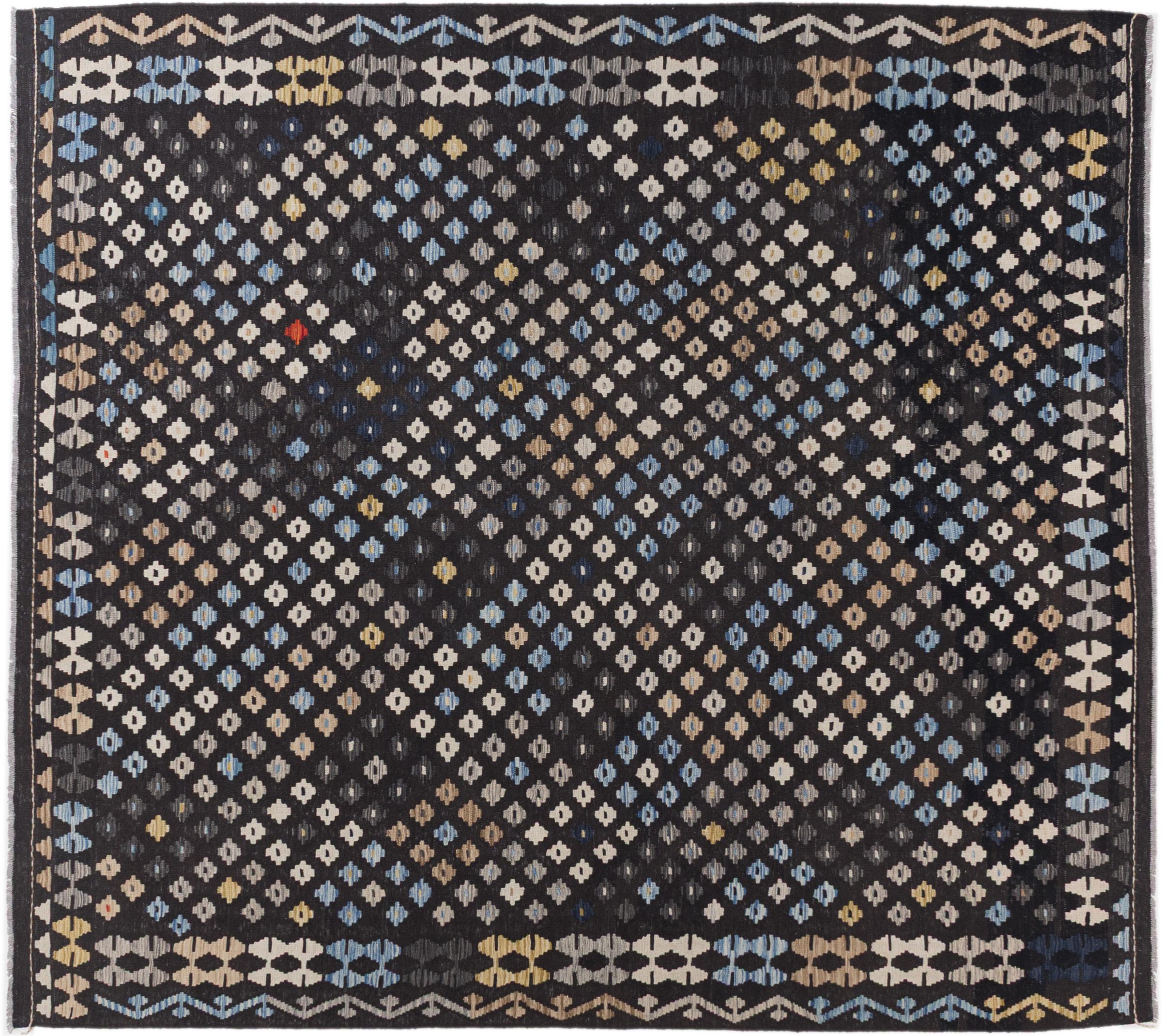 Esta alfombra fue hecha a mano en un telar como un tejido plano. Tejido plano es el término utilizado para describir las alfombras que no tienen pelo. Como el nombre promete, estas alfombras están tejidas y no anudadas. Esto resulta en una alfombra plana con una superficie estructurada. Los tejidos planos no son tan suaves y normalmente más delgados que las alfombras anudadas. Al mismo tiempo, su fabricación es mucho menos compleja y por lo general se pueden disponer por ambos lados (frontal y posterior). Sus patrones suelen ser geométricos, lo cual está determinado por el tejido.