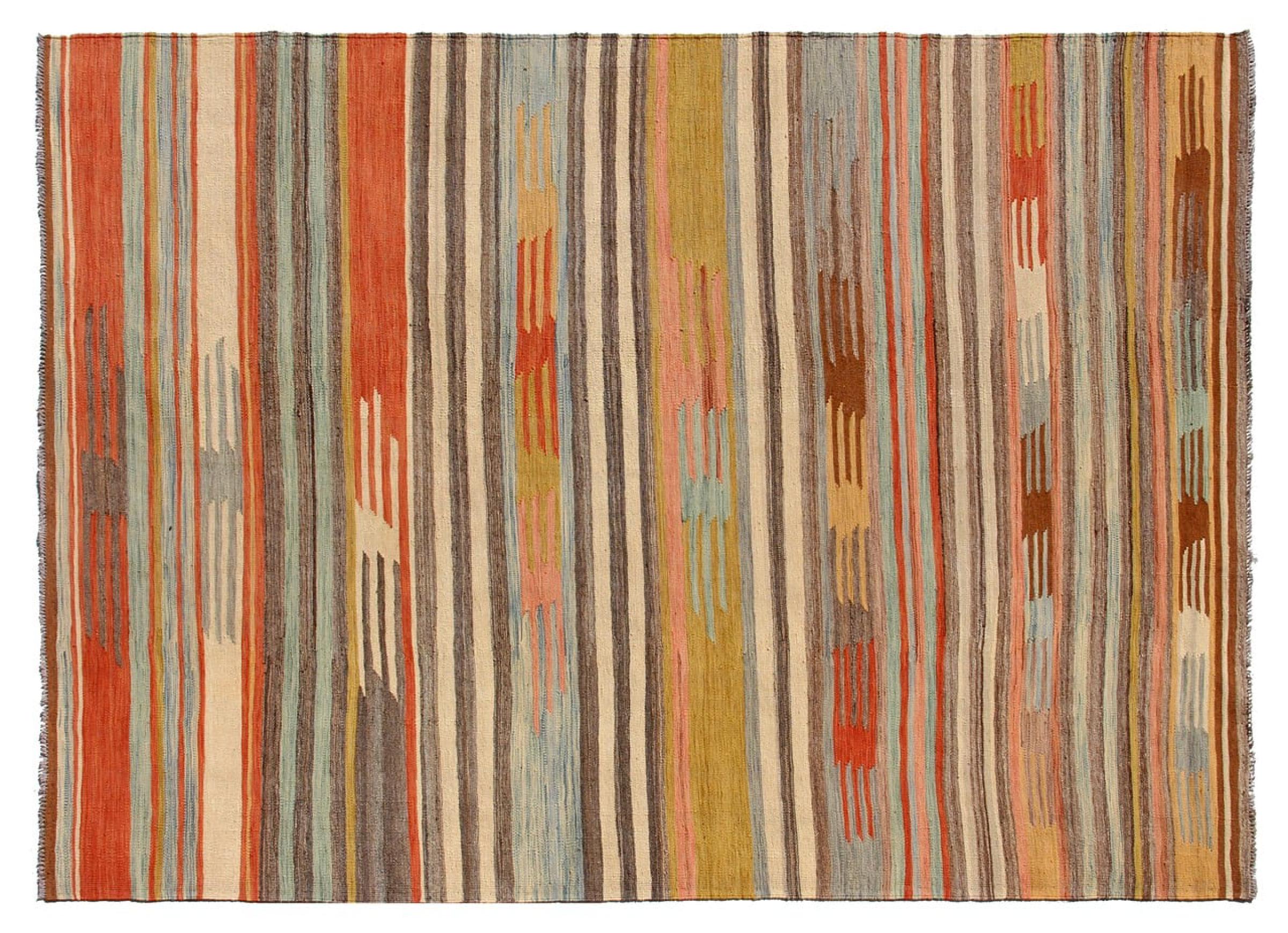 Estas alfombras kilim muestran una diferencia decisiva con las alfombras anudadas a mano - son tejidas a mano. Por lo tanto, no tienen un montón alto de lana y son a menudo más planos y más ásperos que las alfombras de lana anudada. Su fabricación es menos elaborada y por eso suelen ser mucho más baratas. Como ventaja, las alfombras de kilim son también mucho más ligeras y pueden ser colocadas por delante y por detrás. Los kilims tejidos a mano provienen originalmente de la antigua Persia y ahora también se fabrican a menudo en el Afganistán. Tienen patrones bastante simples y directos, que se deben a su técnica de tejido.