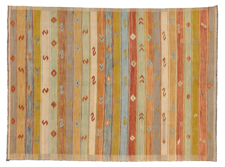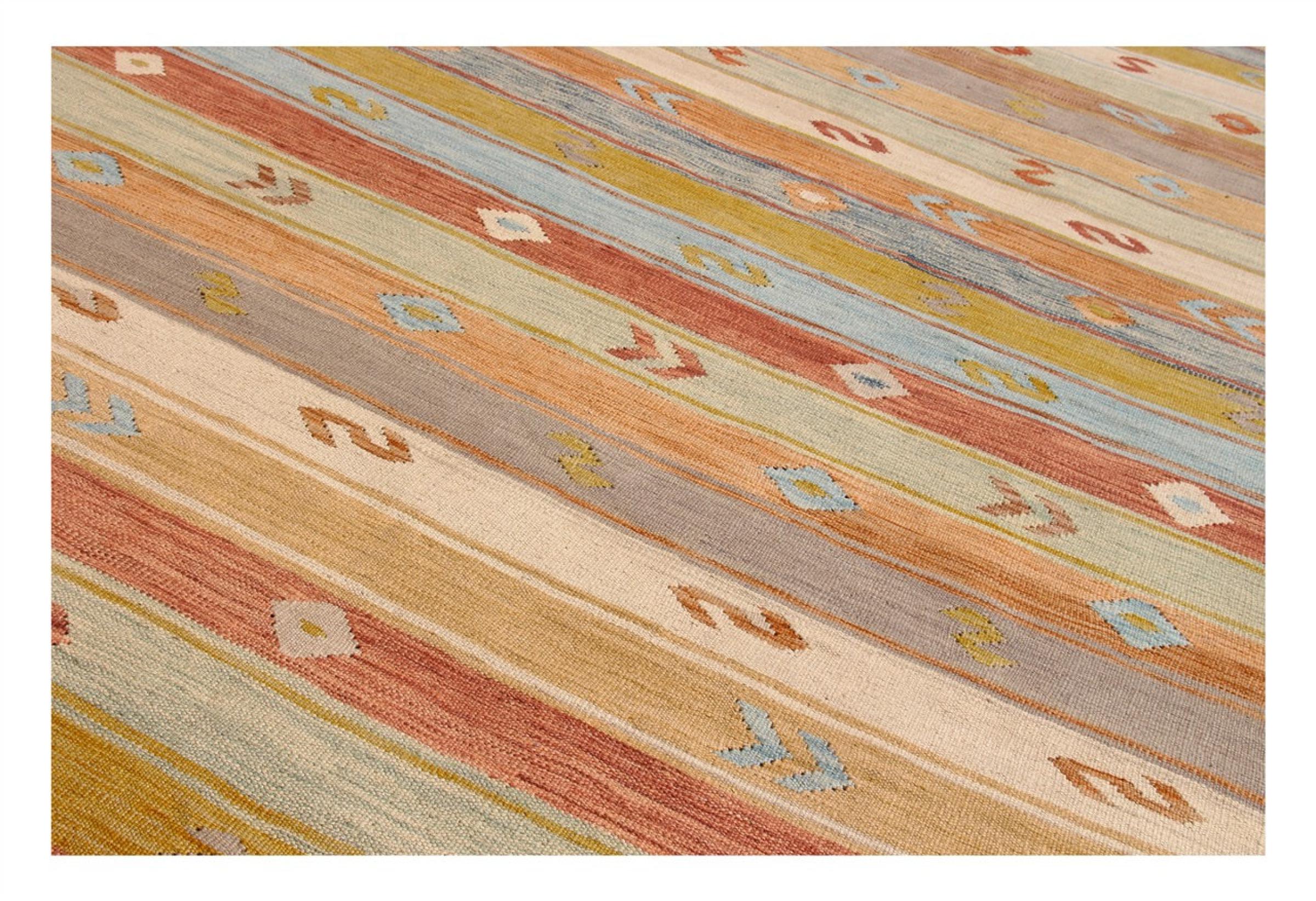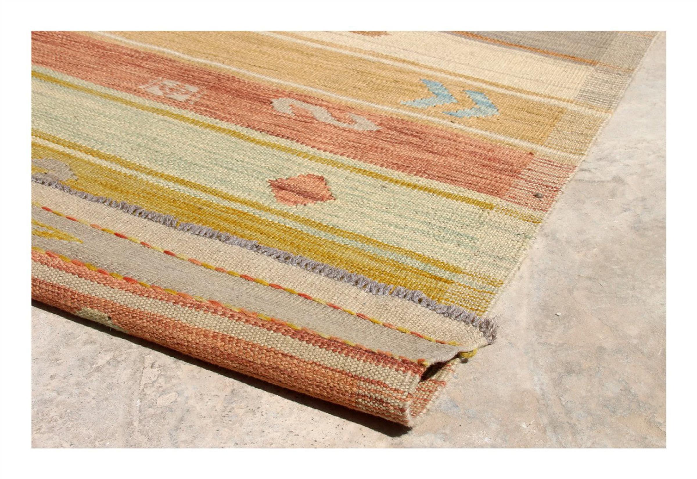 Esta alfombra fue hecha a mano en un telar como un tejido plano. Tejido plano es el término utilizado para describir las alfombras que no tienen pelo. Como el nombre promete, estas alfombras están tejidas y no anudadas. Esto resulta en una alfombra plana con una superficie estructurada. Los tejidos planos no son tan suaves y normalmente más delgados que las alfombras anudadas. Al mismo tiempo, su fabricación es mucho menos compleja y por lo general se pueden disponer por ambos lados (frontal y posterior). Sus patrones suelen ser geométricos, lo cual está determinado por el tejido.