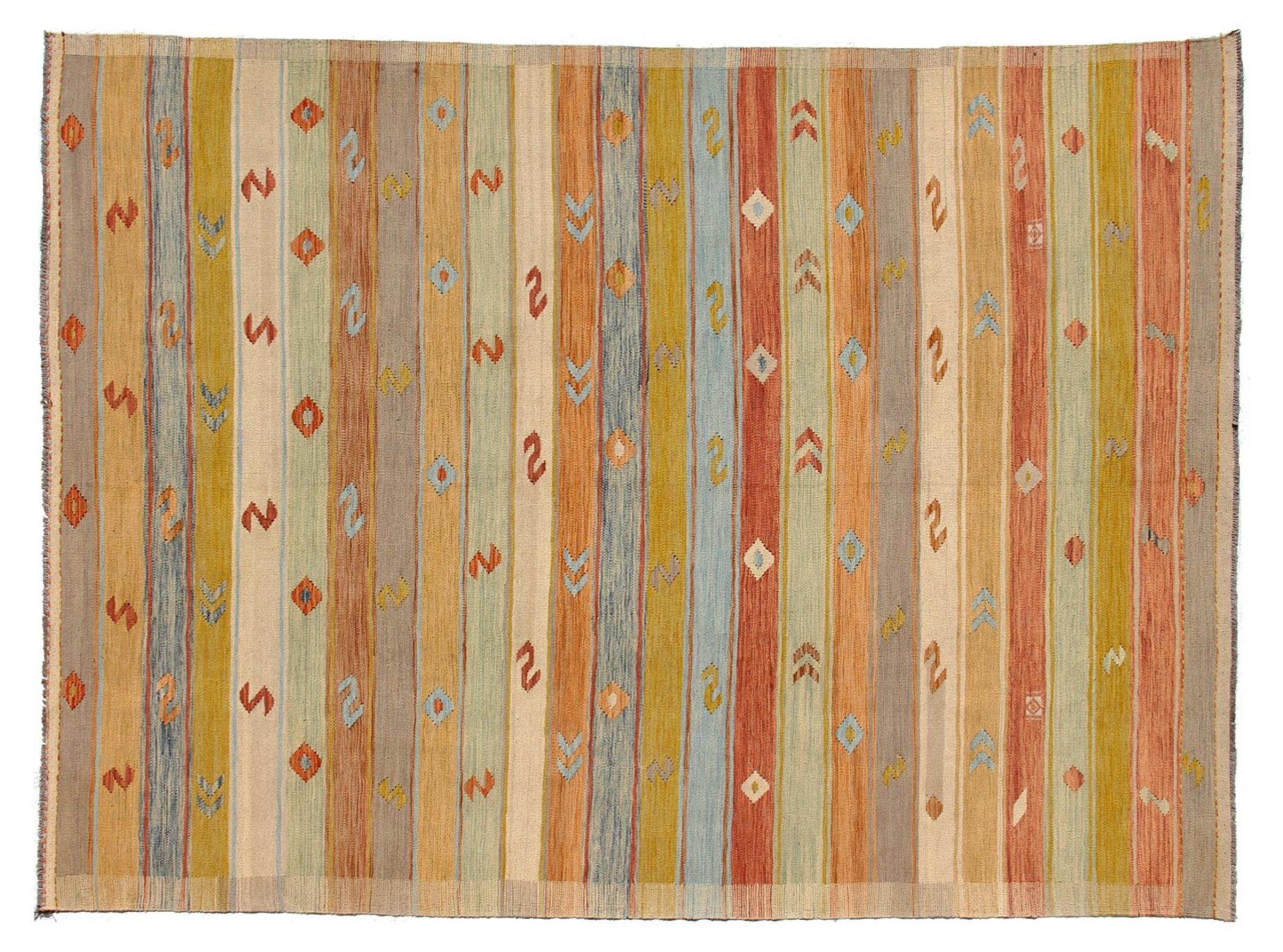 Estas alfombras kilim muestran una diferencia decisiva con las alfombras anudadas a mano - son tejidas a mano. Por lo tanto, no tienen un montón alto de lana y son a menudo más planos y más ásperos que las alfombras de lana anudada. Su fabricación es menos elaborada y por eso suelen ser mucho más baratas. Como ventaja, las alfombras de kilim son también mucho más ligeras y pueden ser colocadas por delante y por detrás. Los kilims tejidos a mano provienen originalmente de la antigua Persia y ahora también se fabrican a menudo en el Afganistán. Tienen patrones bastante simples y directos, que se deben a su técnica de tejido.