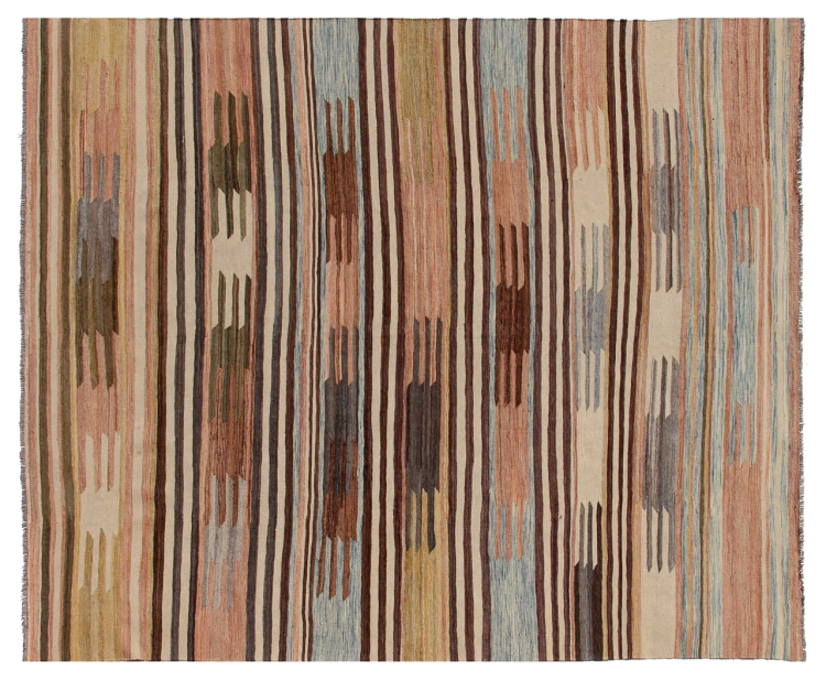 Esta alfombra fue hecha a mano en un telar como un tejido plano. Tejido plano es el término utilizado para describir las alfombras que no tienen pelo. Como el nombre promete, estas alfombras están tejidas y no anudadas. Esto resulta en una alfombra plana con una superficie estructurada. Los tejidos planos no son tan suaves y normalmente más delgados que las alfombras anudadas. Al mismo tiempo, su fabricación es mucho menos compleja y por lo general se pueden disponer por ambos lados (frontal y posterior). Sus patrones suelen ser geométricos, lo cual está determinado por el tejido.