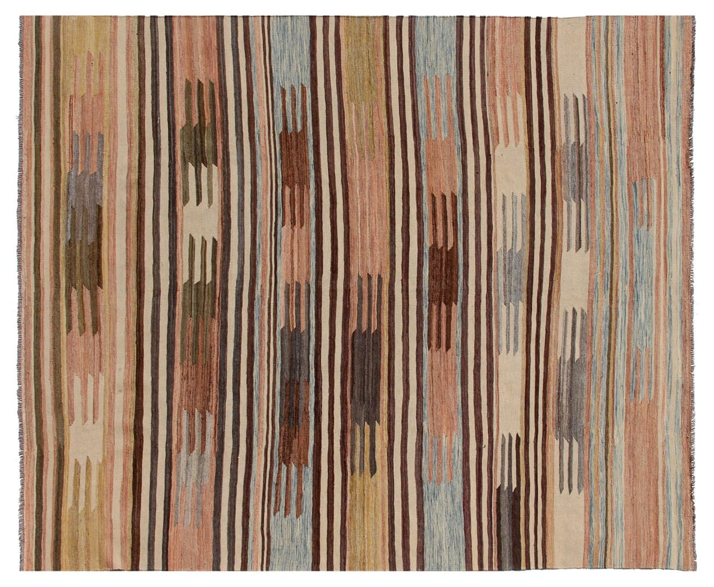 Estas alfombras kilim muestran una diferencia decisiva con las alfombras anudadas a mano - son tejidas a mano. Por lo tanto, no tienen un montón alto de lana y son a menudo más planos y más ásperos que las alfombras de lana anudada. Su fabricación es menos elaborada y por eso suelen ser mucho más baratas. Como ventaja, las alfombras de kilim son también mucho más ligeras y pueden ser colocadas por delante y por detrás. Los kilims tejidos a mano provienen originalmente de la antigua Persia y ahora también se fabrican a menudo en el Afganistán. Tienen patrones bastante simples y directos, que se deben a su técnica de tejido.