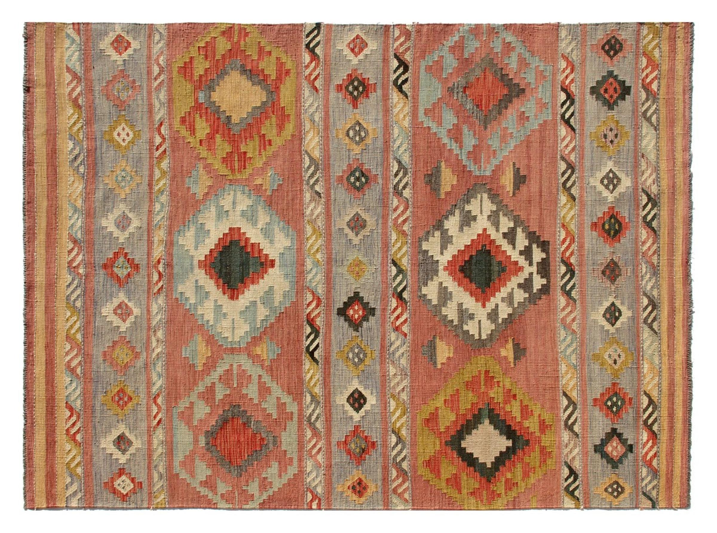 Estas alfombras kilim muestran una diferencia decisiva con las alfombras anudadas a mano - son tejidas a mano. Por lo tanto, no tienen un montón alto de lana y son a menudo más planos y más ásperos que las alfombras de lana anudada. Su fabricación es menos elaborada y por eso suelen ser mucho más baratas. Como ventaja, las alfombras de kilim son también mucho más ligeras y pueden ser colocadas por delante y por detrás. Los kilims tejidos a mano provienen originalmente de la antigua Persia y ahora también se fabrican a menudo en el Afganistán. Tienen patrones bastante simples y directos, que se deben a su técnica de tejido.
