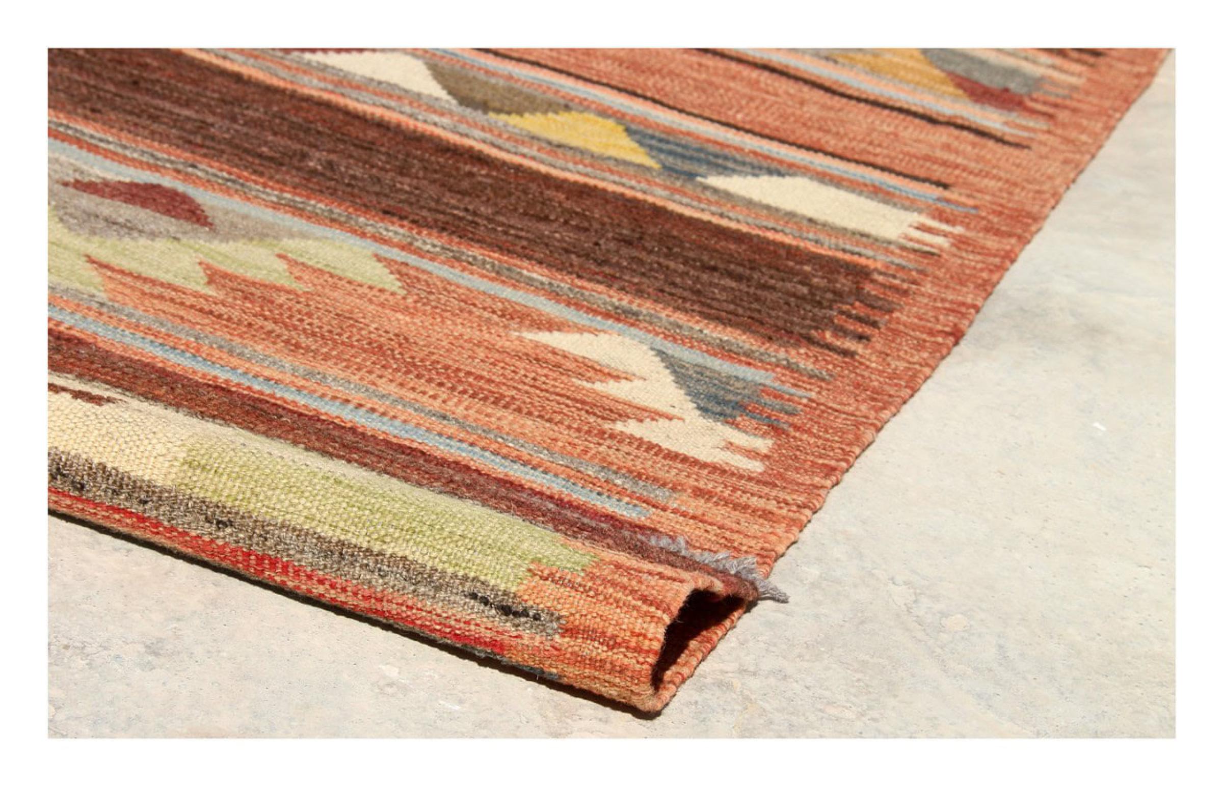 Esta alfombra fue hecha a mano en un telar como un tejido plano. Tejido plano es el término utilizado para describir las alfombras que no tienen pelo. Como el nombre promete, estas alfombras están tejidas y no anudadas. Esto resulta en una alfombra plana con una superficie estructurada. Los tejidos planos no son tan suaves y normalmente más delgados que las alfombras anudadas. Al mismo tiempo, su fabricación es mucho menos compleja y por lo general se pueden disponer por ambos lados (frontal y posterior). Sus patrones suelen ser geométricos, lo cual está determinado por el tejido.