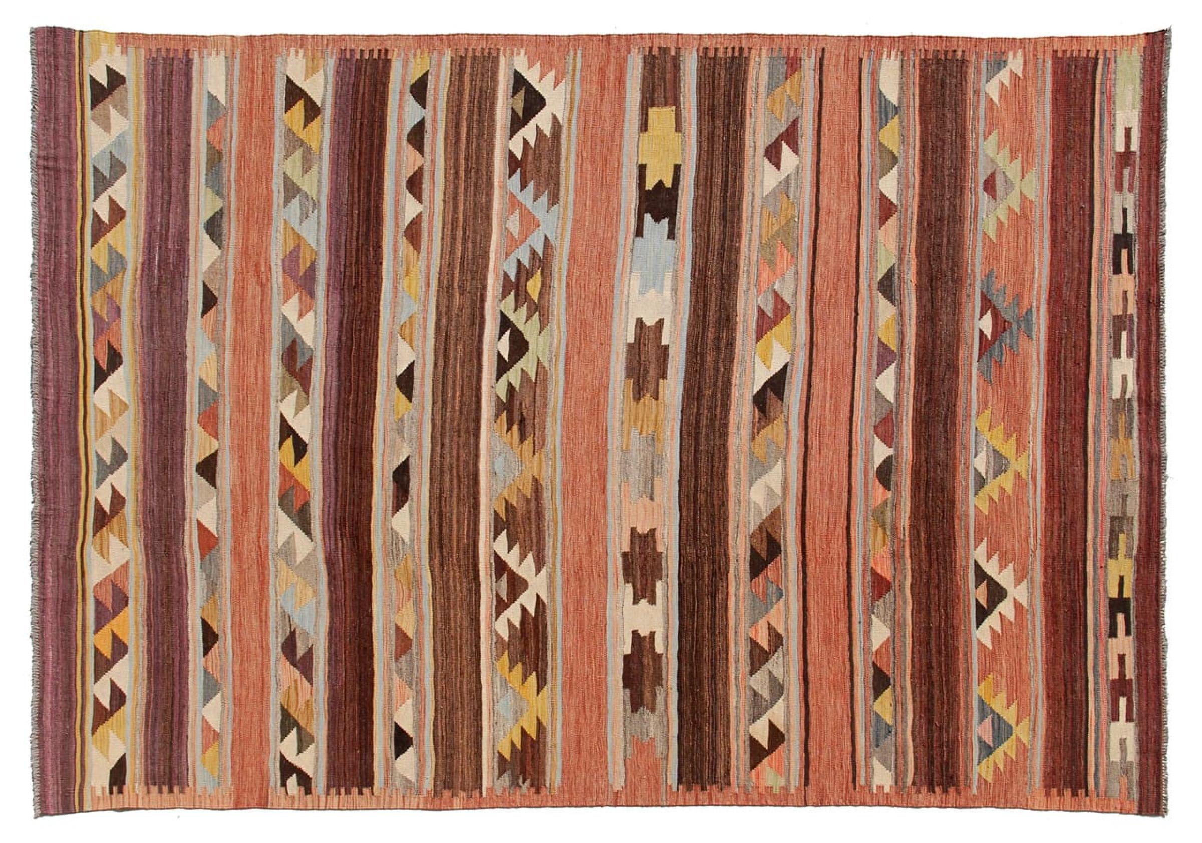 Estas alfombras kilim muestran una diferencia decisiva con las alfombras anudadas a mano - son tejidas a mano. Por lo tanto, no tienen un montón alto de lana y son a menudo más planos y más ásperos que las alfombras de lana anudada. Su fabricación es menos elaborada y por eso suelen ser mucho más baratas. Como ventaja, las alfombras de kilim son también mucho más ligeras y pueden ser colocadas por delante y por detrás. Los kilims tejidos a mano provienen originalmente de la antigua Persia y ahora también se fabrican a menudo en el Afganistán. Tienen patrones bastante simples y directos, que se deben a su técnica de tejido.