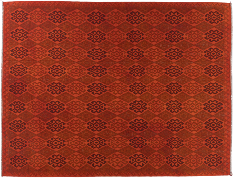 Esta alfombra fue hecha a mano en un telar como un tejido plano. Tejido plano es el término utilizado para describir las alfombras que no tienen pelo. Como el nombre promete, estas alfombras están tejidas y no anudadas. Esto resulta en una alfombra plana con una superficie estructurada. Los tejidos planos no son tan suaves y normalmente más delgados que las alfombras anudadas. Al mismo tiempo, su fabricación es mucho menos compleja y por lo general se pueden disponer por ambos lados (frontal y posterior). Sus patrones suelen ser geométricos, lo cual está determinado por el tejido.