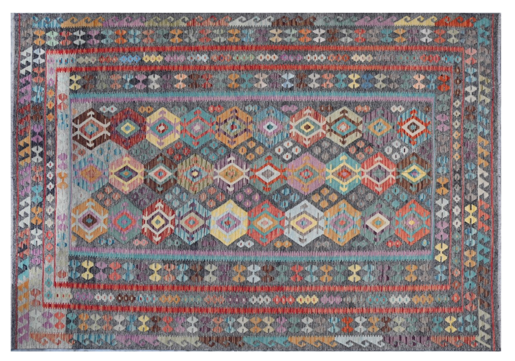 Esta alfombra fue hecha a mano en un telar como un tejido plano. Tejido plano es el término utilizado para describir las alfombras que no tienen pelo. Como el nombre promete, estas alfombras están tejidas y no anudadas. Esto resulta en una alfombra plana con una superficie estructurada. Los tejidos planos no son tan suaves y normalmente más delgados que las alfombras anudadas. Al mismo tiempo, su fabricación es mucho menos compleja y por lo general se pueden disponer por ambos lados (frontal y posterior). Sus patrones suelen ser geométricos, lo cual está determinado por el tejido.