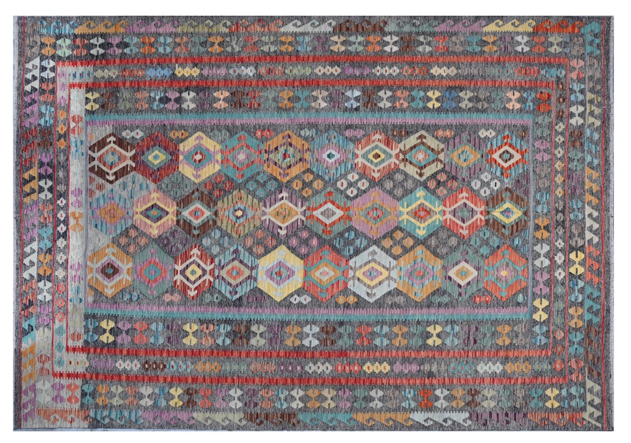 Estas alfombras kilim muestran una diferencia decisiva con las alfombras anudadas a mano - son tejidas a mano. Por lo tanto, no tienen un montón alto de lana y son a menudo más planos y más ásperos que las alfombras de lana anudada. Su fabricación es menos elaborada y por eso suelen ser mucho más baratas. Como ventaja, las alfombras de kilim son también mucho más ligeras y pueden ser colocadas por delante y por detrás. Los kilims tejidos a mano provienen originalmente de la antigua Persia y ahora también se fabrican a menudo en el Afganistán. Tienen patrones bastante simples y directos, que se deben a su técnica de tejido.