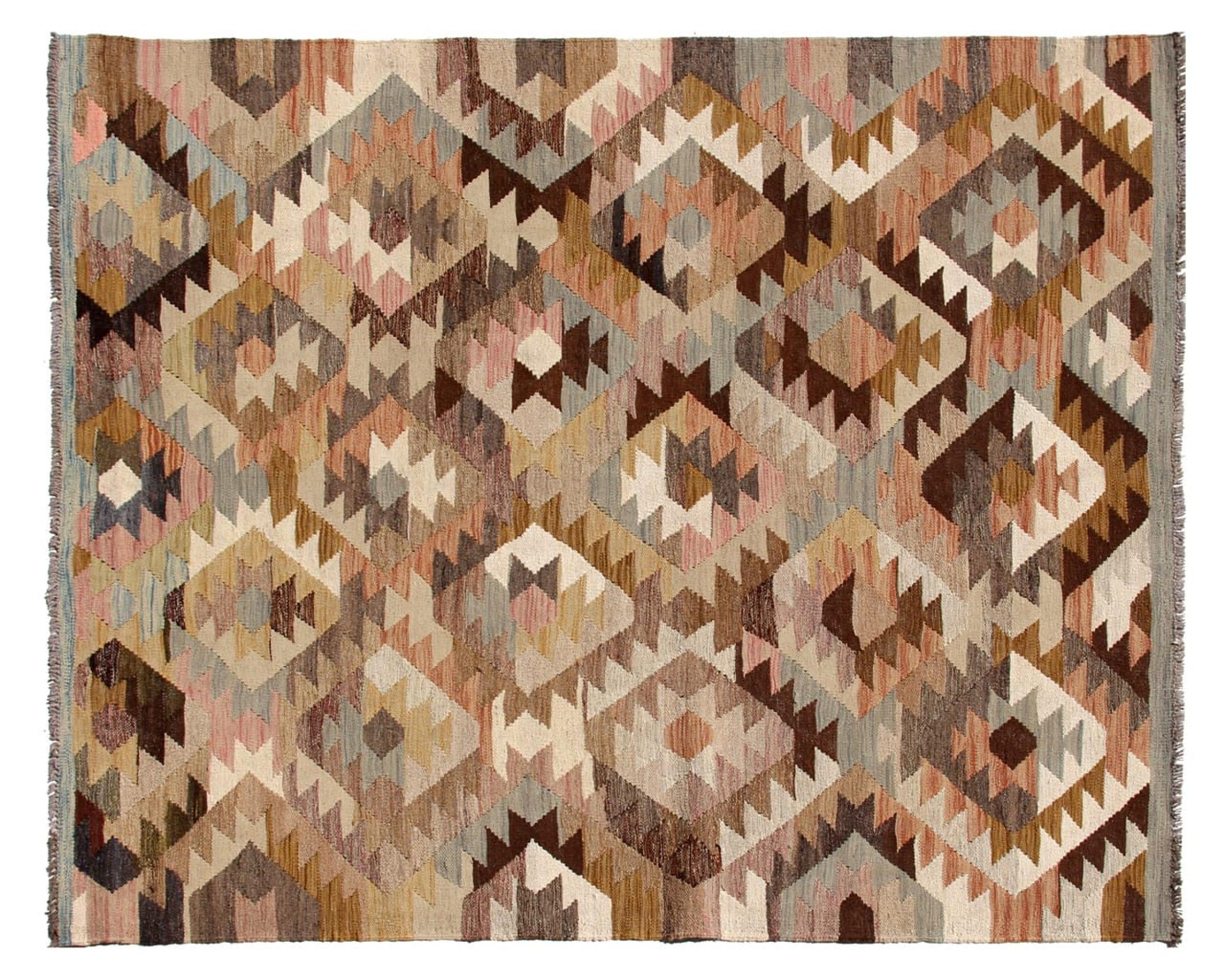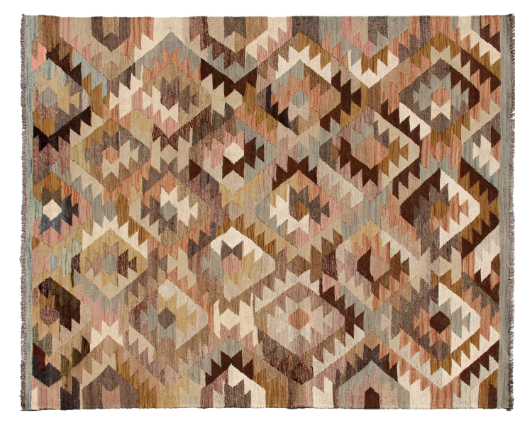 Estas alfombras kilim muestran una diferencia decisiva con las alfombras anudadas a mano - son tejidas a mano. Por lo tanto, no tienen un montón alto de lana y son a menudo más planos y más ásperos que las alfombras de lana anudada. Su fabricación es menos elaborada y por eso suelen ser mucho más baratas. Como ventaja, las alfombras de kilim son también mucho más ligeras y pueden ser colocadas por delante y por detrás. Los kilims tejidos a mano provienen originalmente de la antigua Persia y ahora también se fabrican a menudo en el Afganistán. Tienen patrones bastante simples y directos, que se deben a su técnica de tejido.