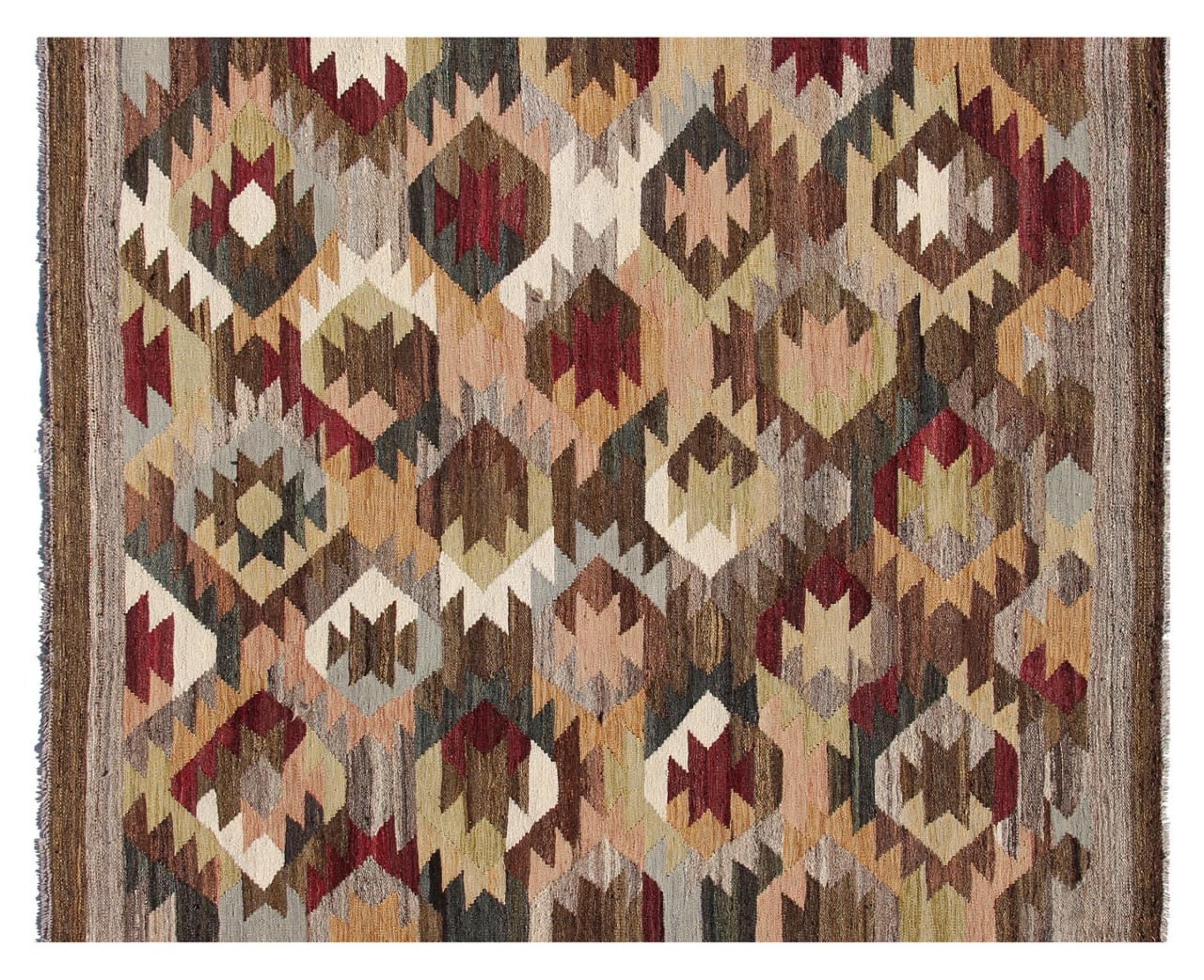 Estas alfombras kilim muestran una diferencia decisiva con las alfombras anudadas a mano - son tejidas a mano. Por lo tanto, no tienen un montón alto de lana y son a menudo más planos y más ásperos que las alfombras de lana anudada. Su fabricación es menos elaborada y por eso suelen ser mucho más baratas. Como ventaja, las alfombras de kilim son también mucho más ligeras y pueden ser colocadas por delante y por detrás. Los kilims tejidos a mano provienen originalmente de la antigua Persia y ahora también se fabrican a menudo en el Afganistán. Tienen patrones bastante simples y directos, que se deben a su técnica de tejido.