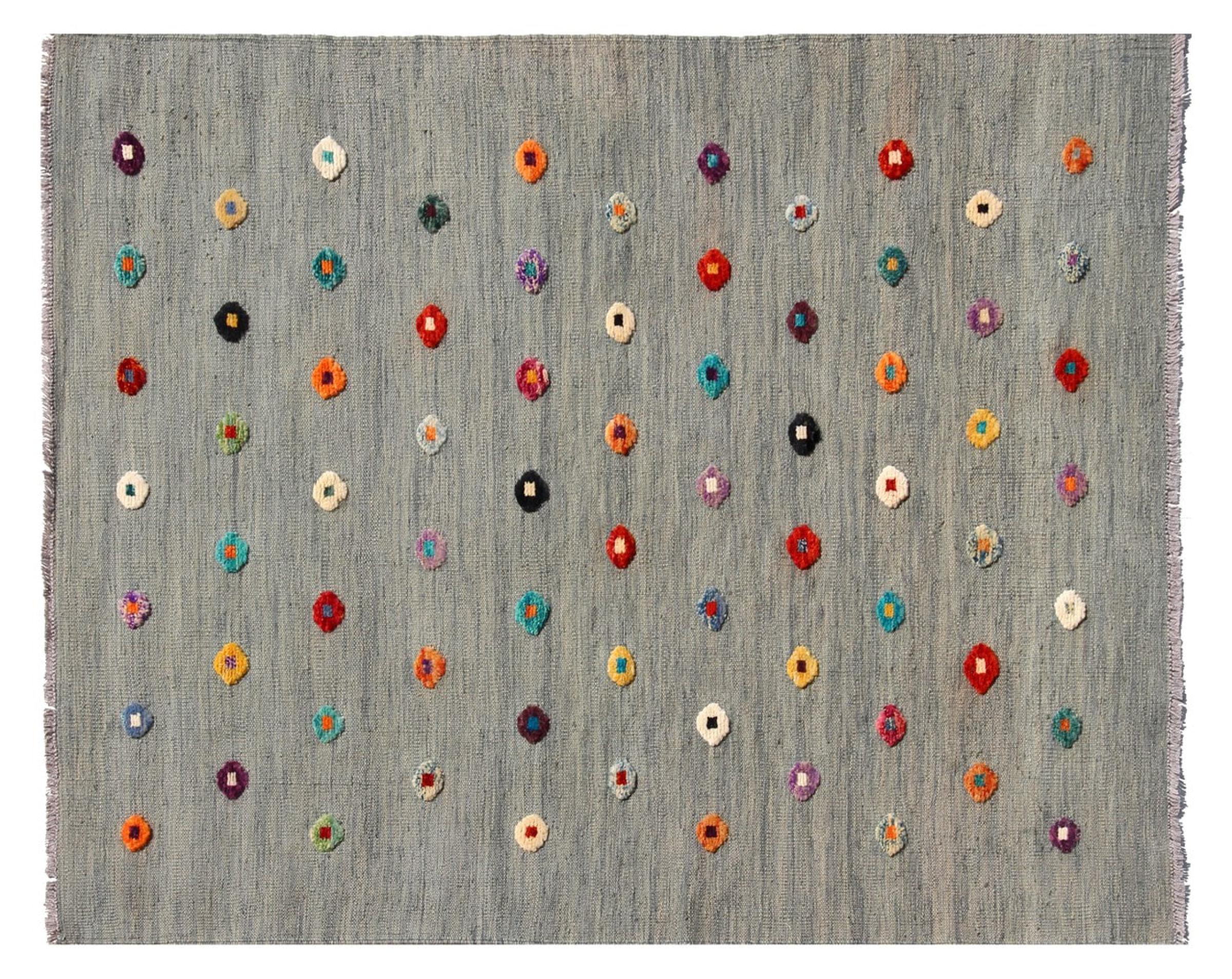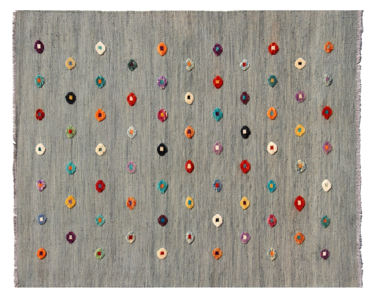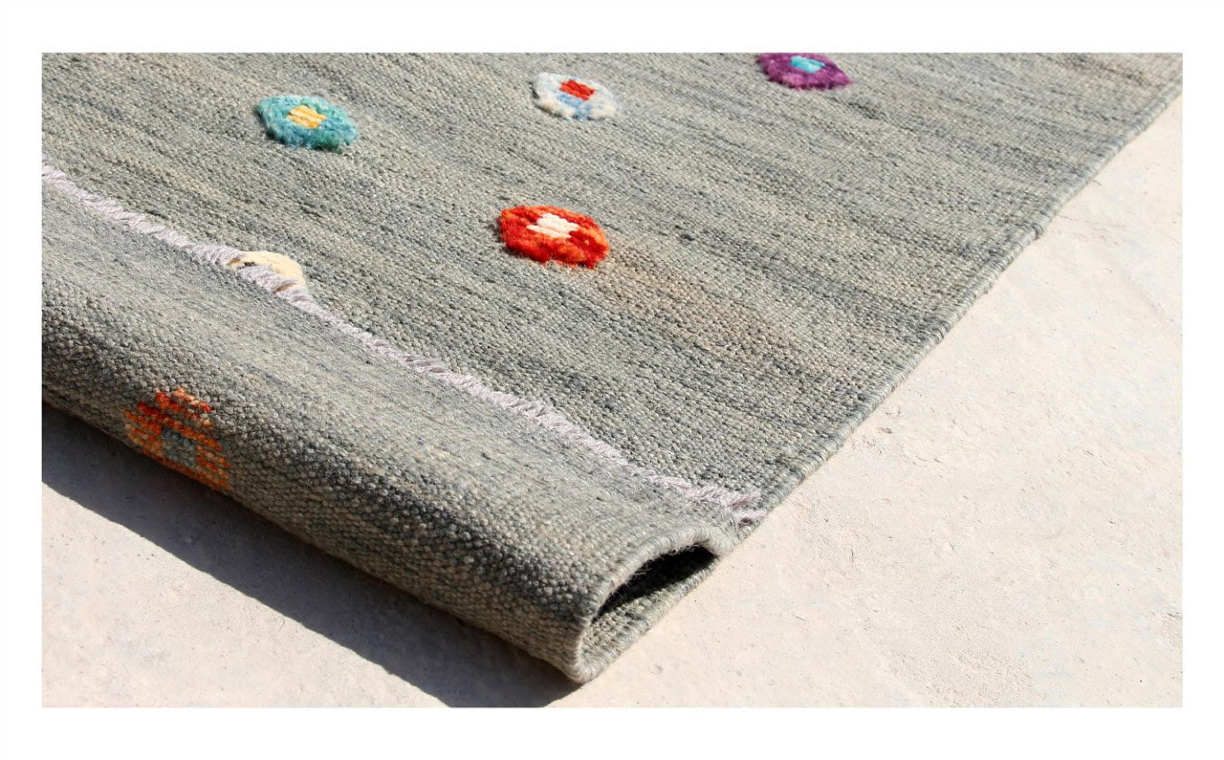 Esta alfombra fue hecha a mano en un telar como un tejido plano. Tejido plano es el término utilizado para describir las alfombras que no tienen pelo. Como el nombre promete, estas alfombras están tejidas y no anudadas. Esto resulta en una alfombra plana con una superficie estructurada. Los tejidos planos no son tan suaves y normalmente más delgados que las alfombras anudadas. Al mismo tiempo, su fabricación es mucho menos compleja y por lo general se pueden disponer por ambos lados (frontal y posterior). Sus patrones suelen ser geométricos, lo cual está determinado por el tejido.