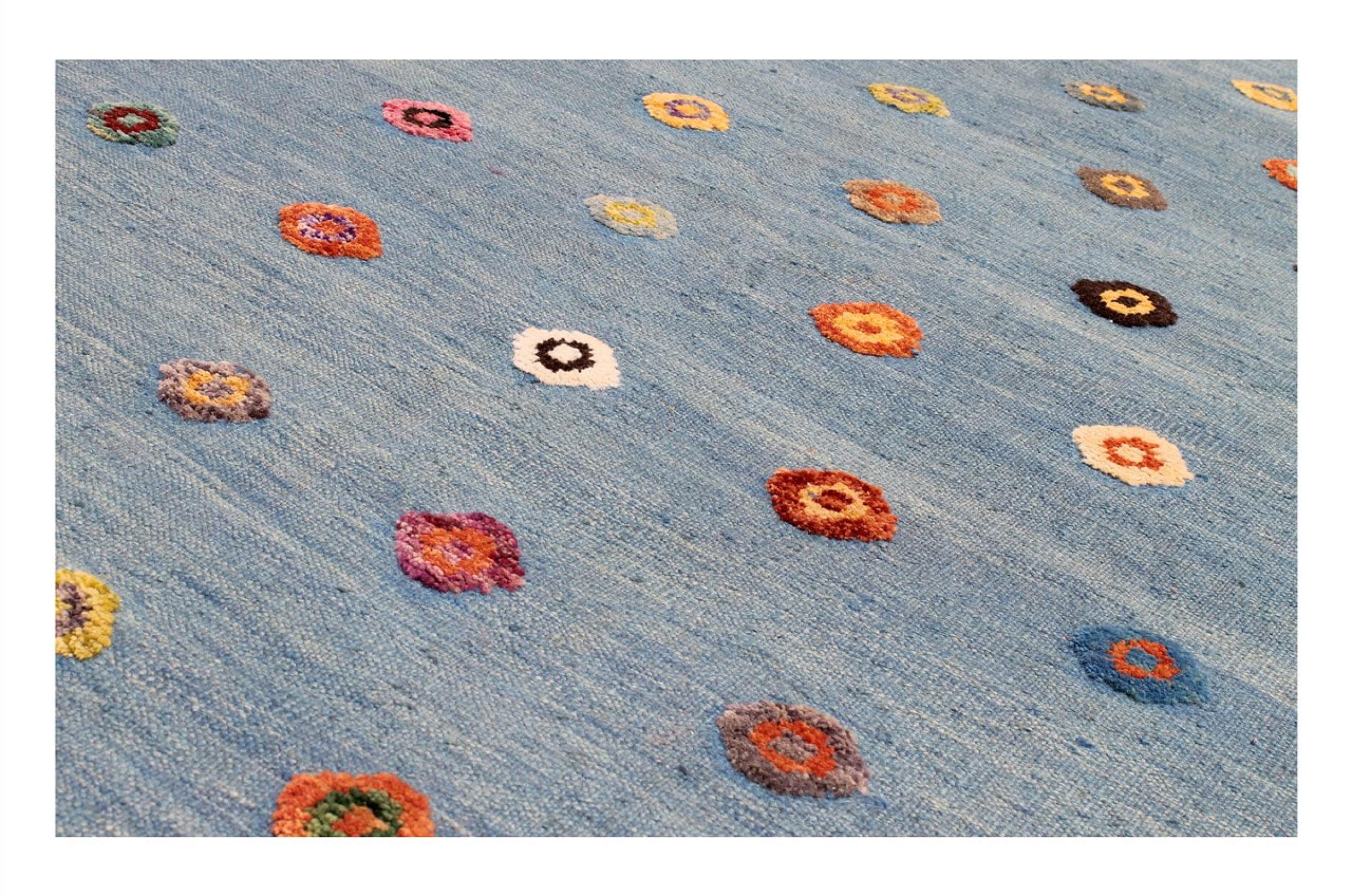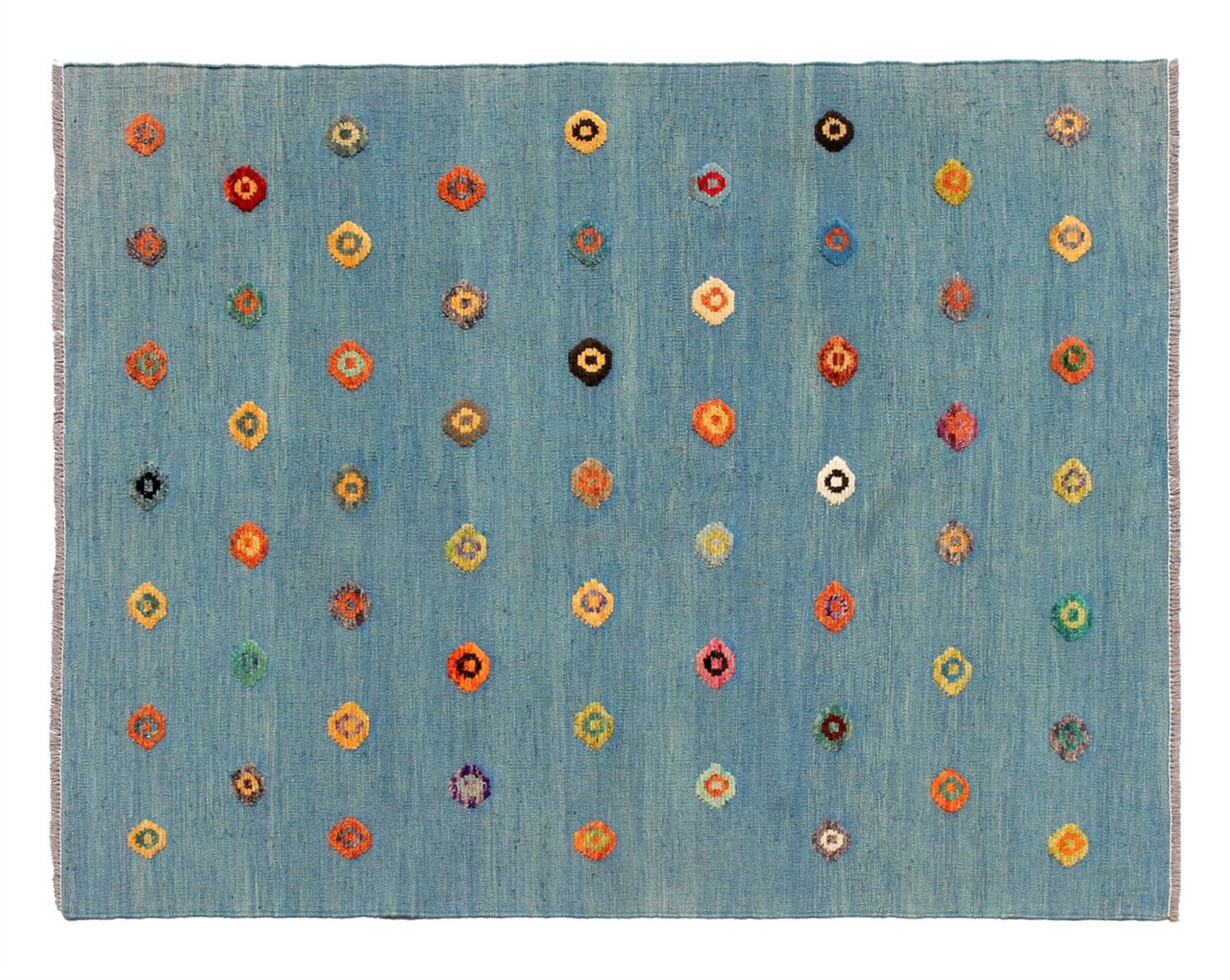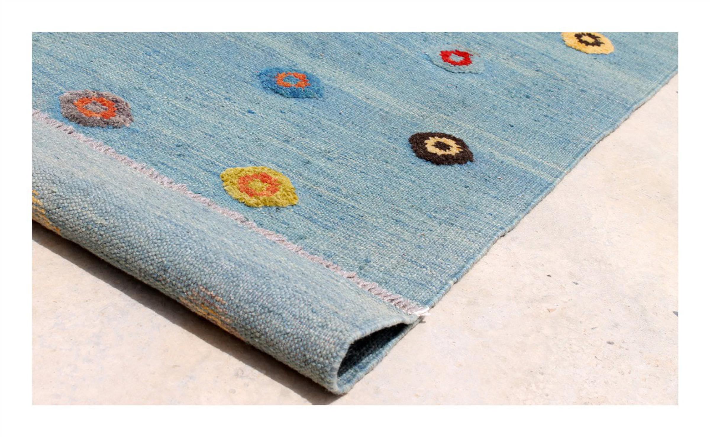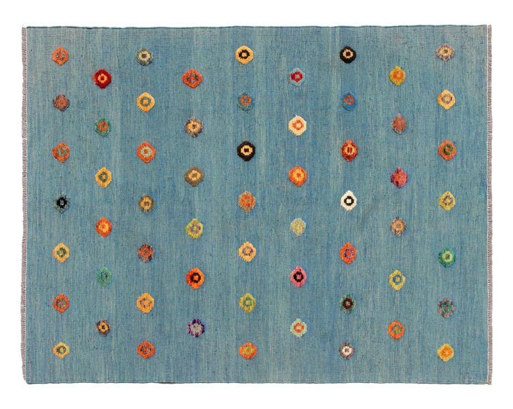 Esta alfombra fue hecha a mano en un telar como un tejido plano. Tejido plano es el término utilizado para describir las alfombras que no tienen pelo. Como el nombre promete, estas alfombras están tejidas y no anudadas. Esto resulta en una alfombra plana con una superficie estructurada. Los tejidos planos no son tan suaves y normalmente más delgados que las alfombras anudadas. Al mismo tiempo, su fabricación es mucho menos compleja y por lo general se pueden disponer por ambos lados (frontal y posterior). Sus patrones suelen ser geométricos, lo cual está determinado por el tejido.
