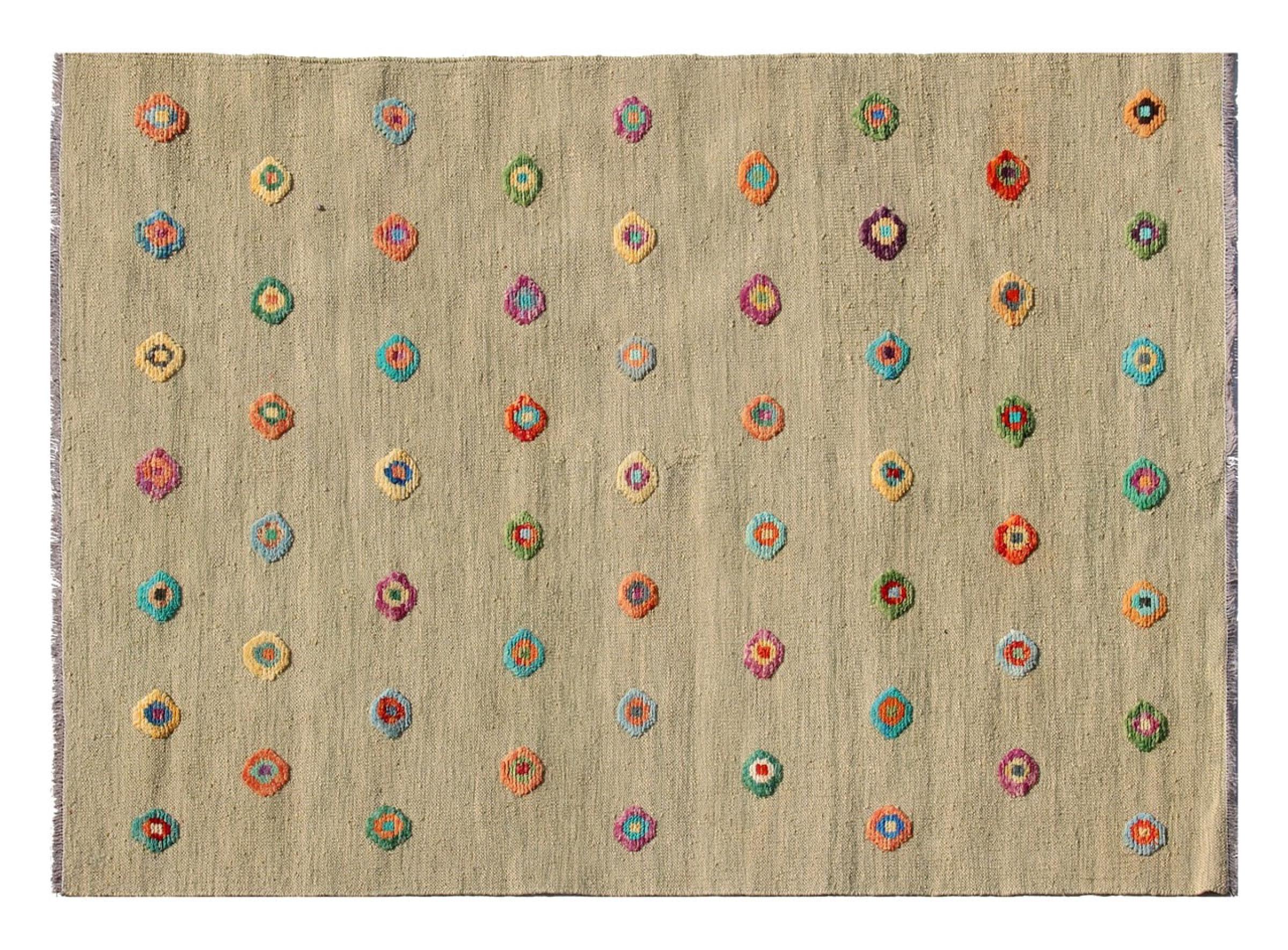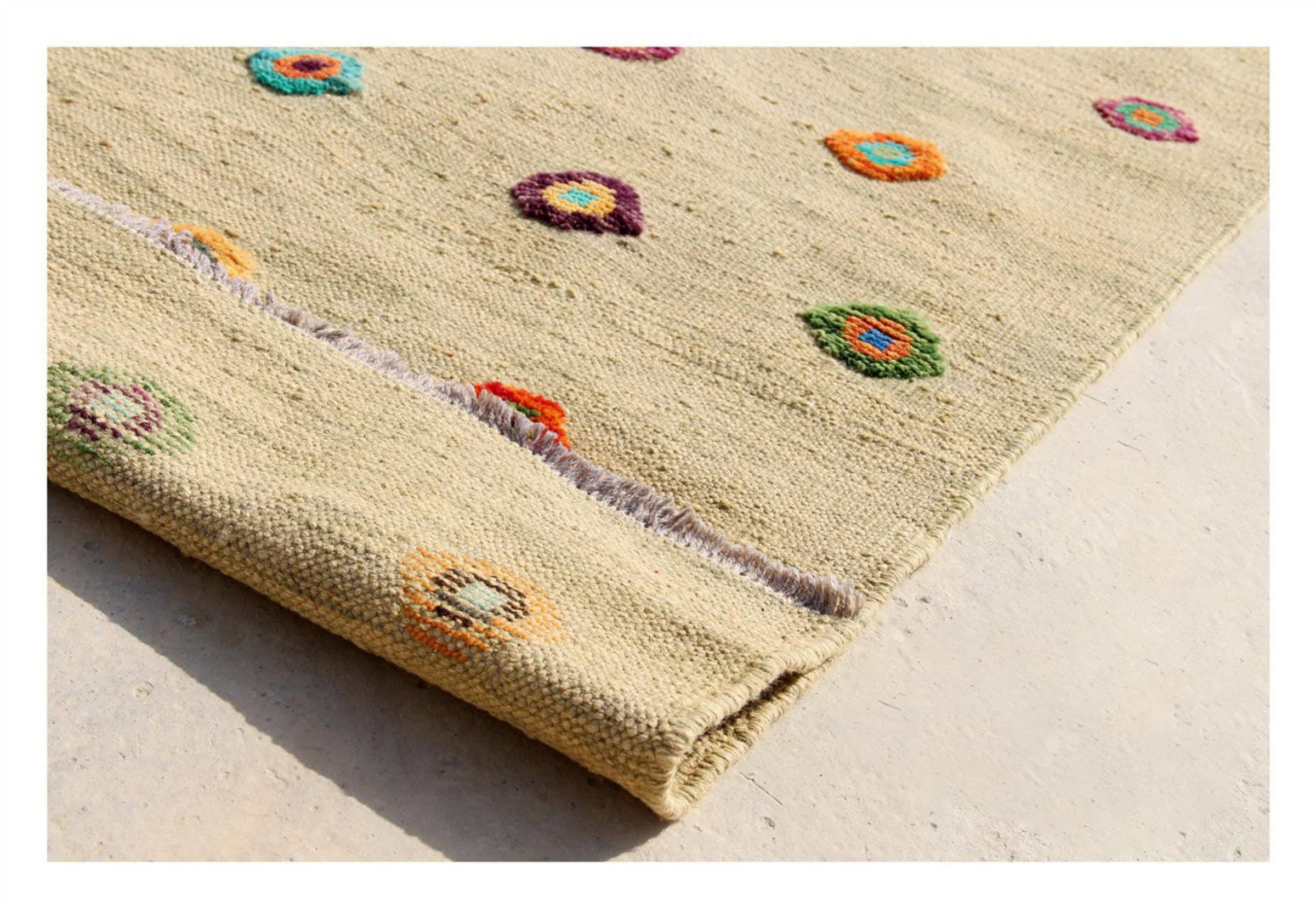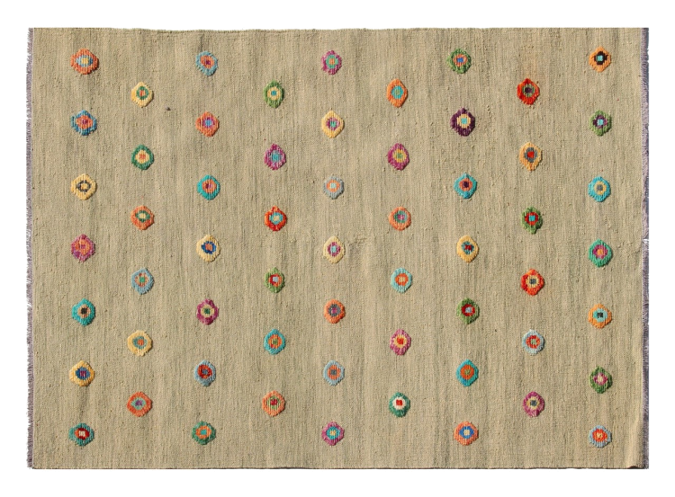 Esta alfombra fue hecha a mano en un telar como un tejido plano. Tejido plano es el término utilizado para describir las alfombras que no tienen pelo. Como el nombre promete, estas alfombras están tejidas y no anudadas. Esto resulta en una alfombra plana con una superficie estructurada. Los tejidos planos no son tan suaves y normalmente más delgados que las alfombras anudadas. Al mismo tiempo, su fabricación es mucho menos compleja y por lo general se pueden disponer por ambos lados (frontal y posterior). Sus patrones suelen ser geométricos, lo cual está determinado por el tejido.