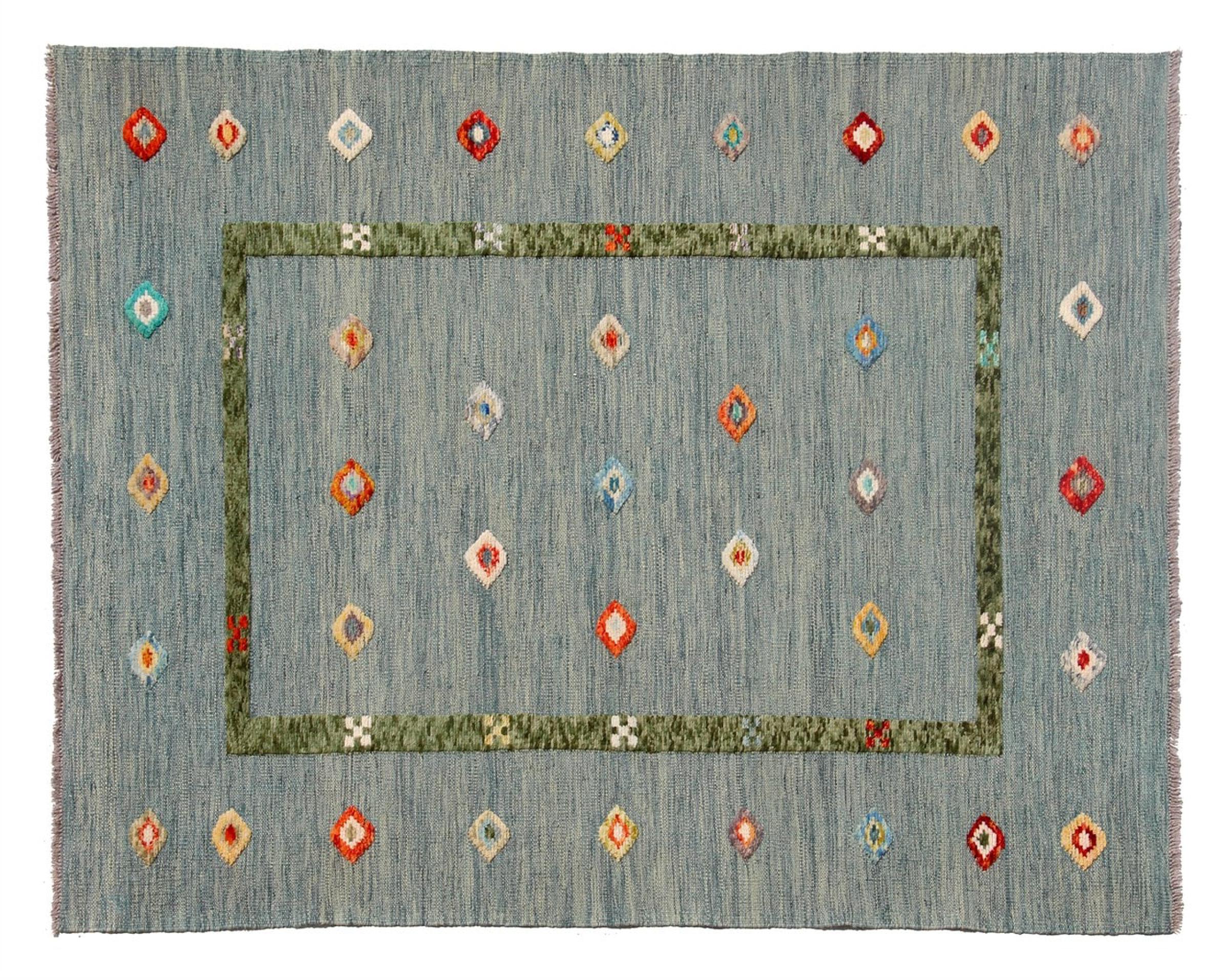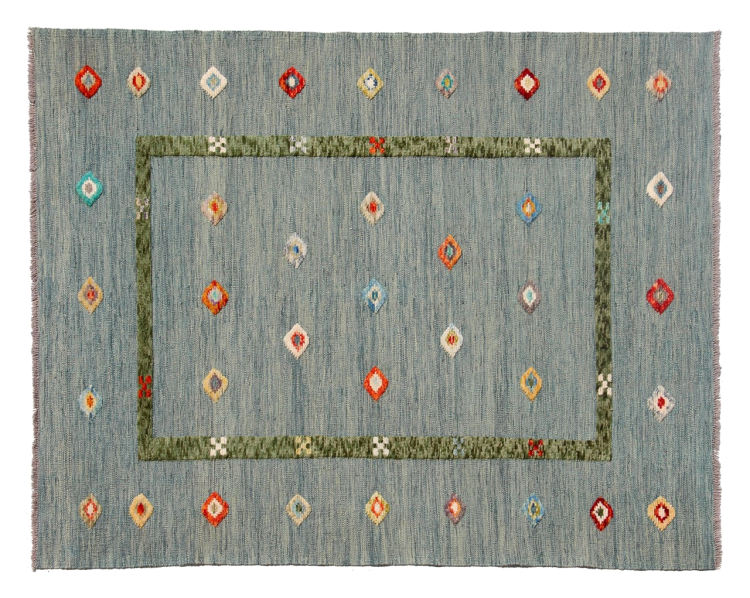 Esta alfombra fue hecha a mano en un telar como un tejido plano. Tejido plano es el término utilizado para describir las alfombras que no tienen pelo. Como el nombre promete, estas alfombras están tejidas y no anudadas. Esto resulta en una alfombra plana con una superficie estructurada. Los tejidos planos no son tan suaves y normalmente más delgados que las alfombras anudadas. Al mismo tiempo, su fabricación es mucho menos compleja y por lo general se pueden disponer por ambos lados (frontal y posterior). Sus patrones suelen ser geométricos, lo cual está determinado por el tejido.