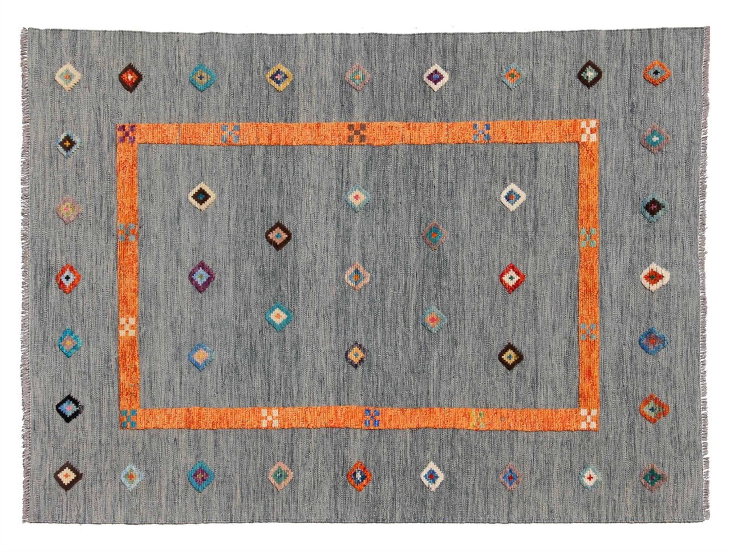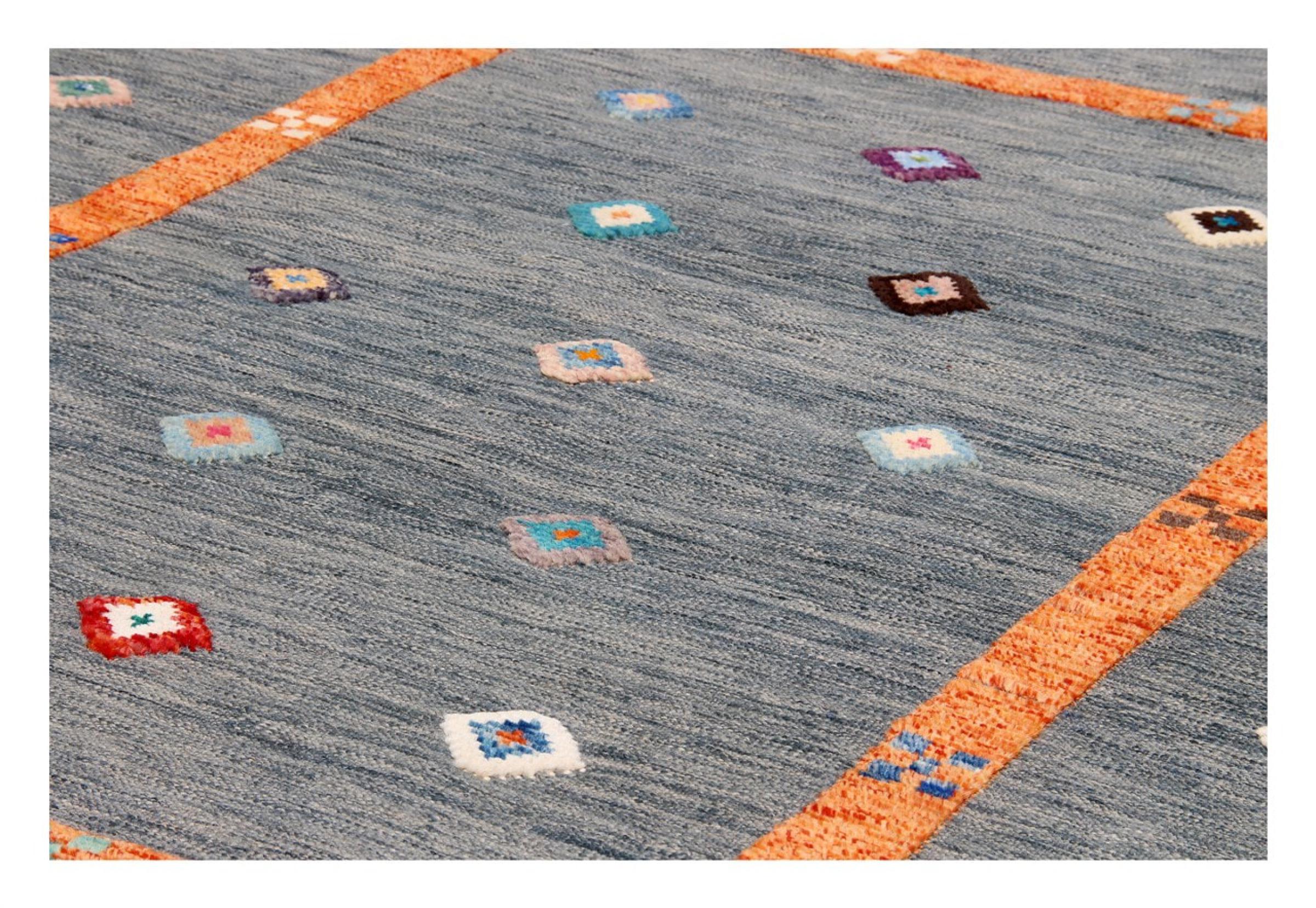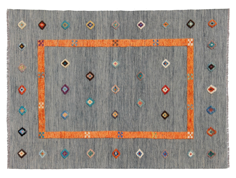 Esta alfombra fue hecha a mano en un telar como un tejido plano. Tejido plano es el término utilizado para describir las alfombras que no tienen pelo. Como el nombre promete, estas alfombras están tejidas y no anudadas. Esto resulta en una alfombra plana con una superficie estructurada. Los tejidos planos no son tan suaves y normalmente más delgados que las alfombras anudadas. Al mismo tiempo, su fabricación es mucho menos compleja y por lo general se pueden disponer por ambos lados (frontal y posterior). Sus patrones suelen ser geométricos, lo cual está determinado por el tejido.