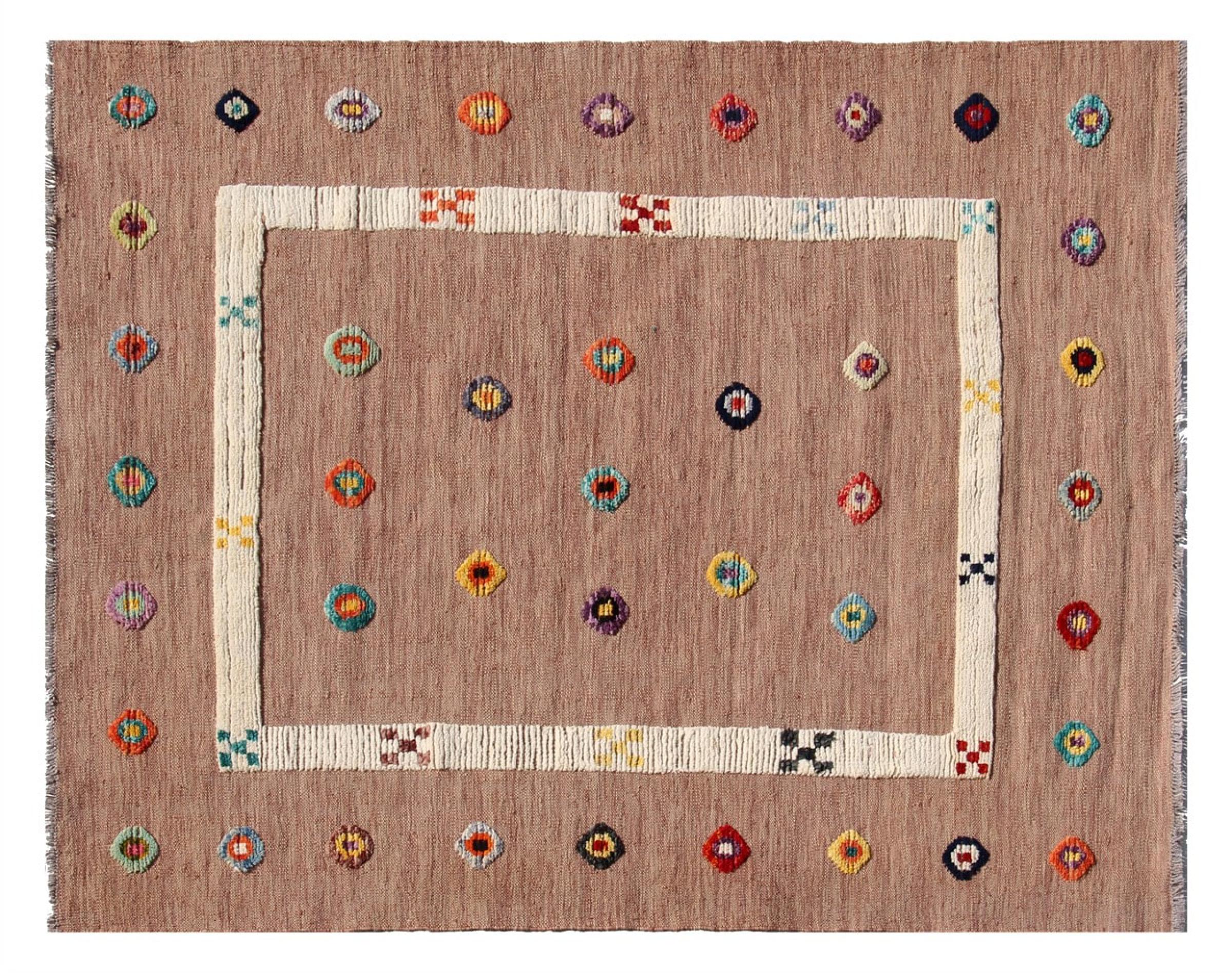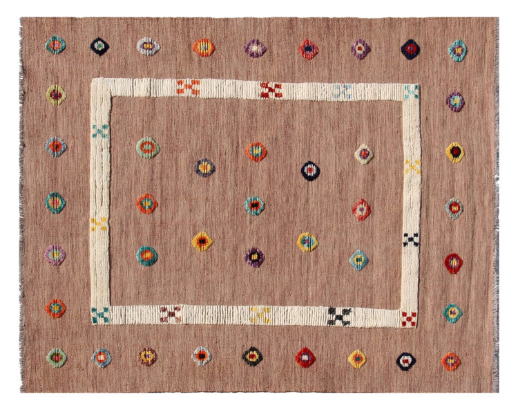 Esta alfombra fue hecha a mano en un telar como un tejido plano. Tejido plano es el término utilizado para describir las alfombras que no tienen pelo. Como el nombre promete, estas alfombras están tejidas y no anudadas. Esto resulta en una alfombra plana con una superficie estructurada. Los tejidos planos no son tan suaves y normalmente más delgados que las alfombras anudadas. Al mismo tiempo, su fabricación es mucho menos compleja y por lo general se pueden disponer por ambos lados (frontal y posterior). Sus patrones suelen ser geométricos, lo cual está determinado por el tejido.