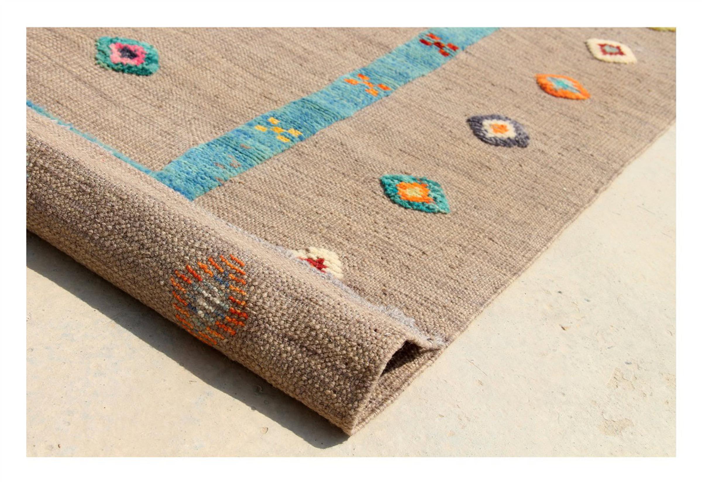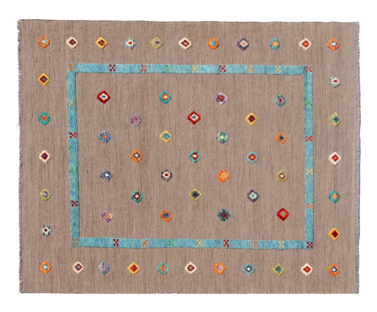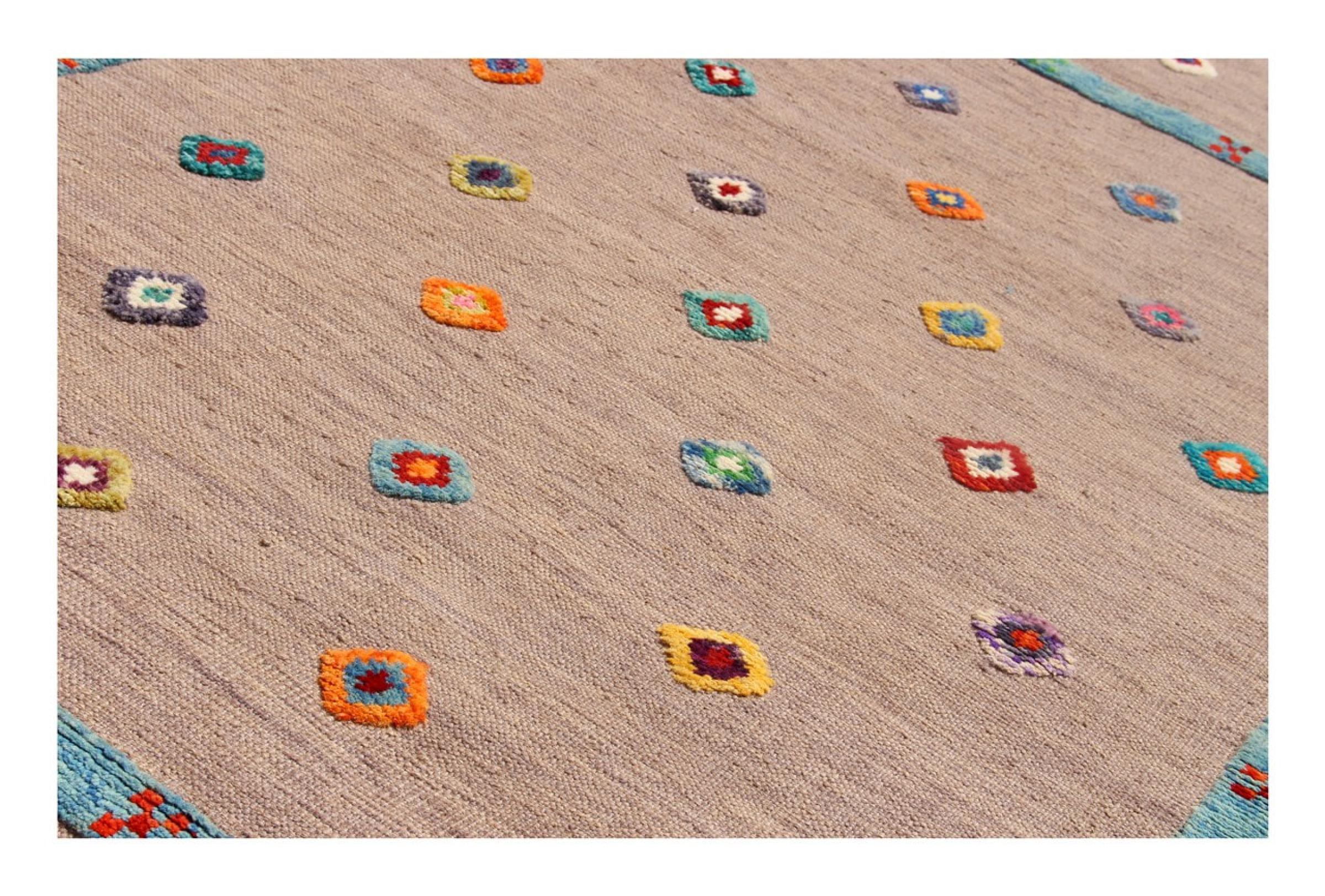 Esta alfombra fue hecha a mano en un telar como un tejido plano. Tejido plano es el término utilizado para describir las alfombras que no tienen pelo. Como el nombre promete, estas alfombras están tejidas y no anudadas. Esto resulta en una alfombra plana con una superficie estructurada. Los tejidos planos no son tan suaves y normalmente más delgados que las alfombras anudadas. Al mismo tiempo, su fabricación es mucho menos compleja y por lo general se pueden disponer por ambos lados (frontal y posterior). Sus patrones suelen ser geométricos, lo cual está determinado por el tejido.