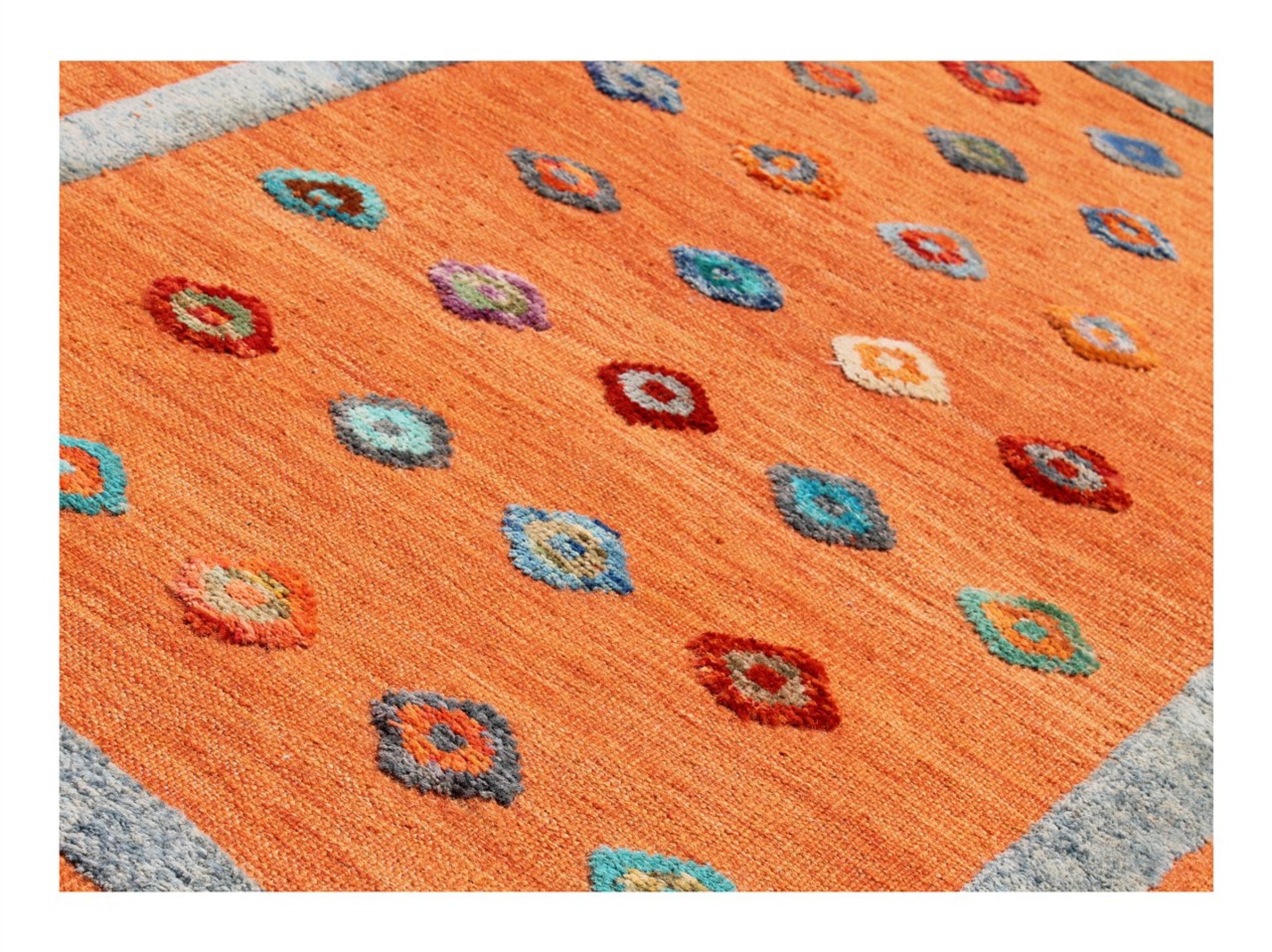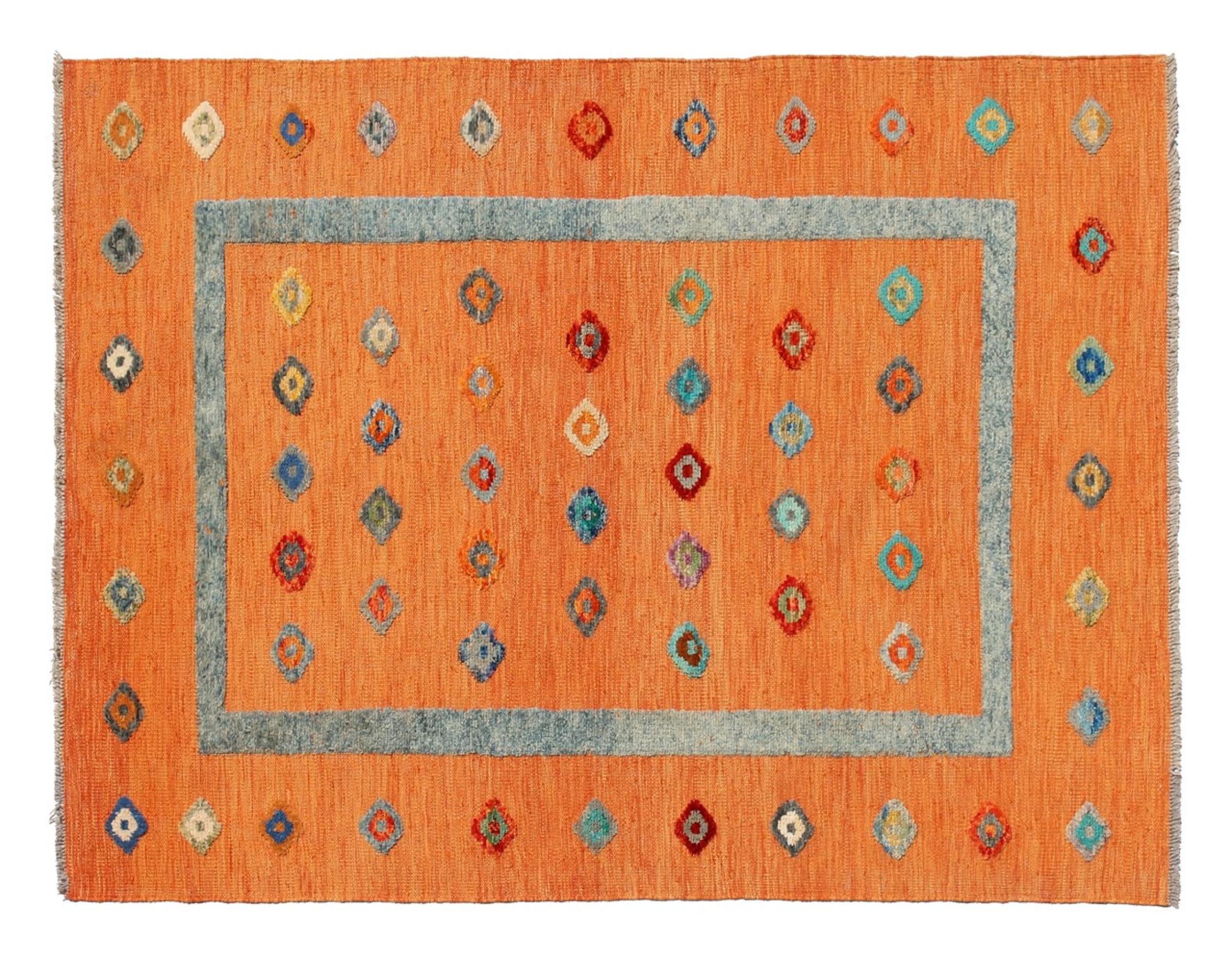 Esta alfombra fue hecha a mano en un telar como un tejido plano. Tejido plano es el término utilizado para describir las alfombras que no tienen pelo. Como el nombre promete, estas alfombras están tejidas y no anudadas. Esto resulta en una alfombra plana con una superficie estructurada. Los tejidos planos no son tan suaves y normalmente más delgados que las alfombras anudadas. Al mismo tiempo, su fabricación es mucho menos compleja y por lo general se pueden disponer por ambos lados (frontal y posterior). Sus patrones suelen ser geométricos, lo cual está determinado por el tejido.