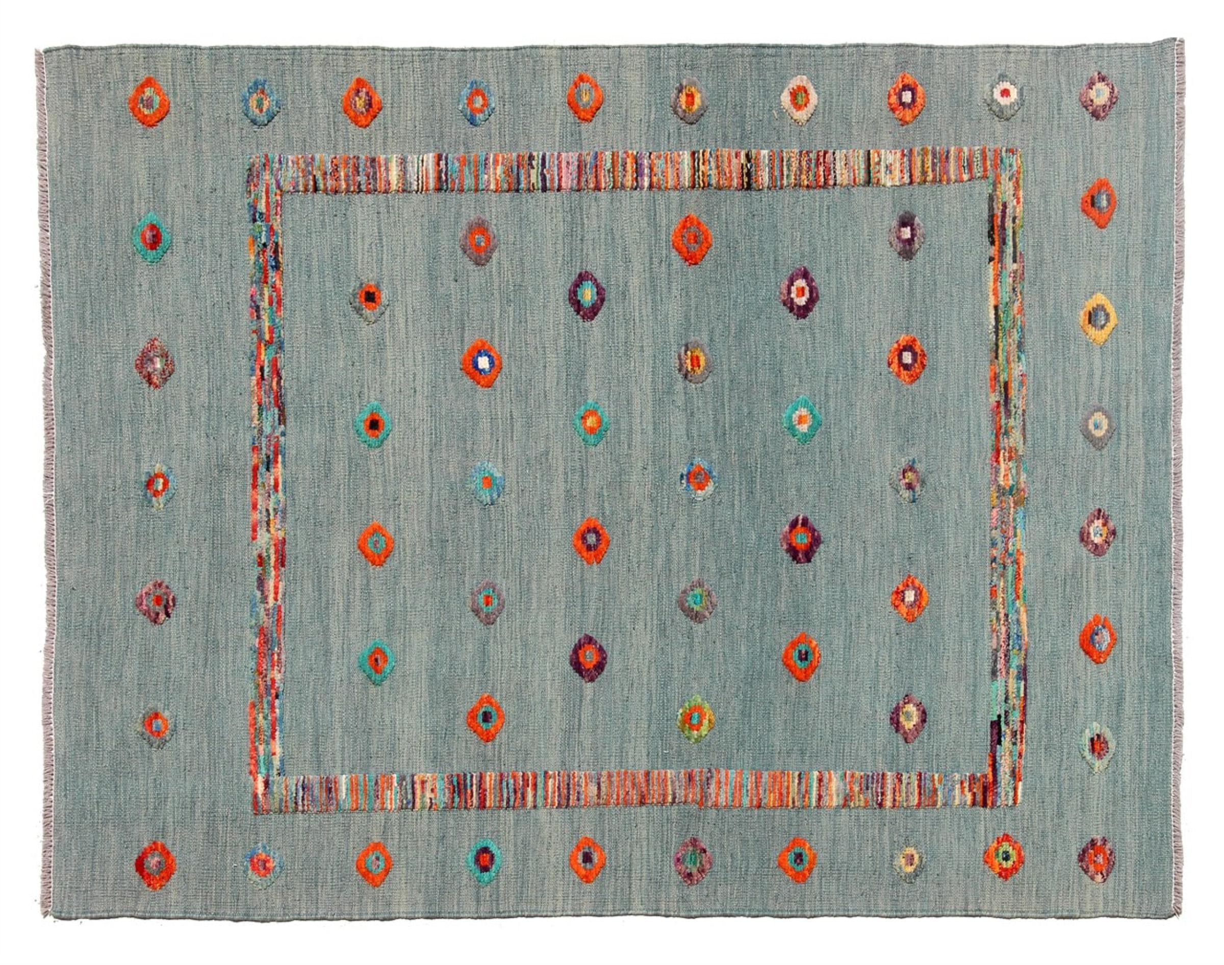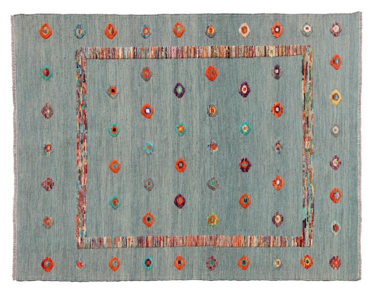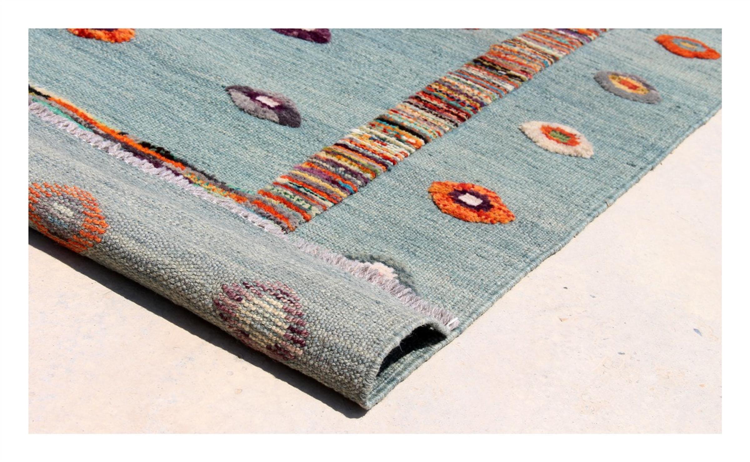 Esta alfombra fue hecha a mano en un telar como un tejido plano. Tejido plano es el término utilizado para describir las alfombras que no tienen pelo. Como el nombre promete, estas alfombras están tejidas y no anudadas. Esto resulta en una alfombra plana con una superficie estructurada. Los tejidos planos no son tan suaves y normalmente más delgados que las alfombras anudadas. Al mismo tiempo, su fabricación es mucho menos compleja y por lo general se pueden disponer por ambos lados (frontal y posterior). Sus patrones suelen ser geométricos, lo cual está determinado por el tejido.