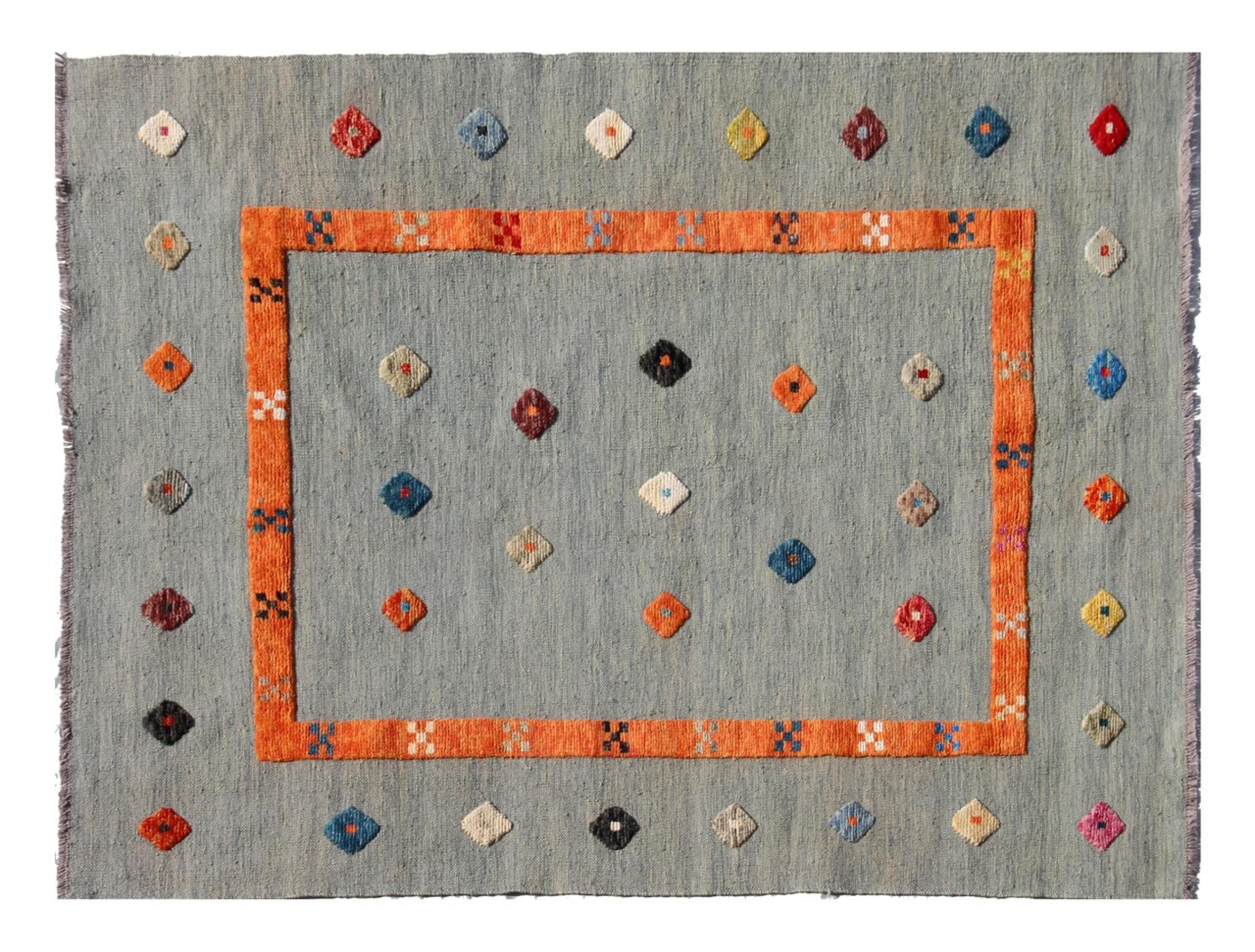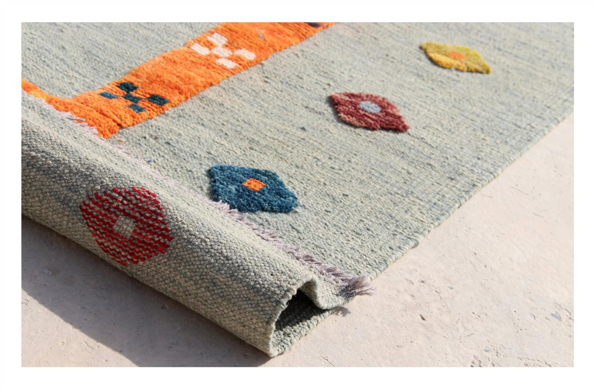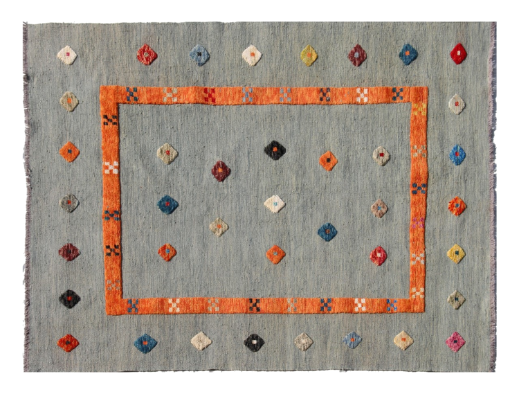Esta alfombra fue hecha a mano en un telar como un tejido plano. Tejido plano es el término utilizado para describir las alfombras que no tienen pelo. Como el nombre promete, estas alfombras están tejidas y no anudadas. Esto resulta en una alfombra plana con una superficie estructurada. Los tejidos planos no son tan suaves y normalmente más delgados que las alfombras anudadas. Al mismo tiempo, su fabricación es mucho menos compleja y por lo general se pueden disponer por ambos lados (frontal y posterior). Sus patrones suelen ser geométricos, lo cual está determinado por el tejido.