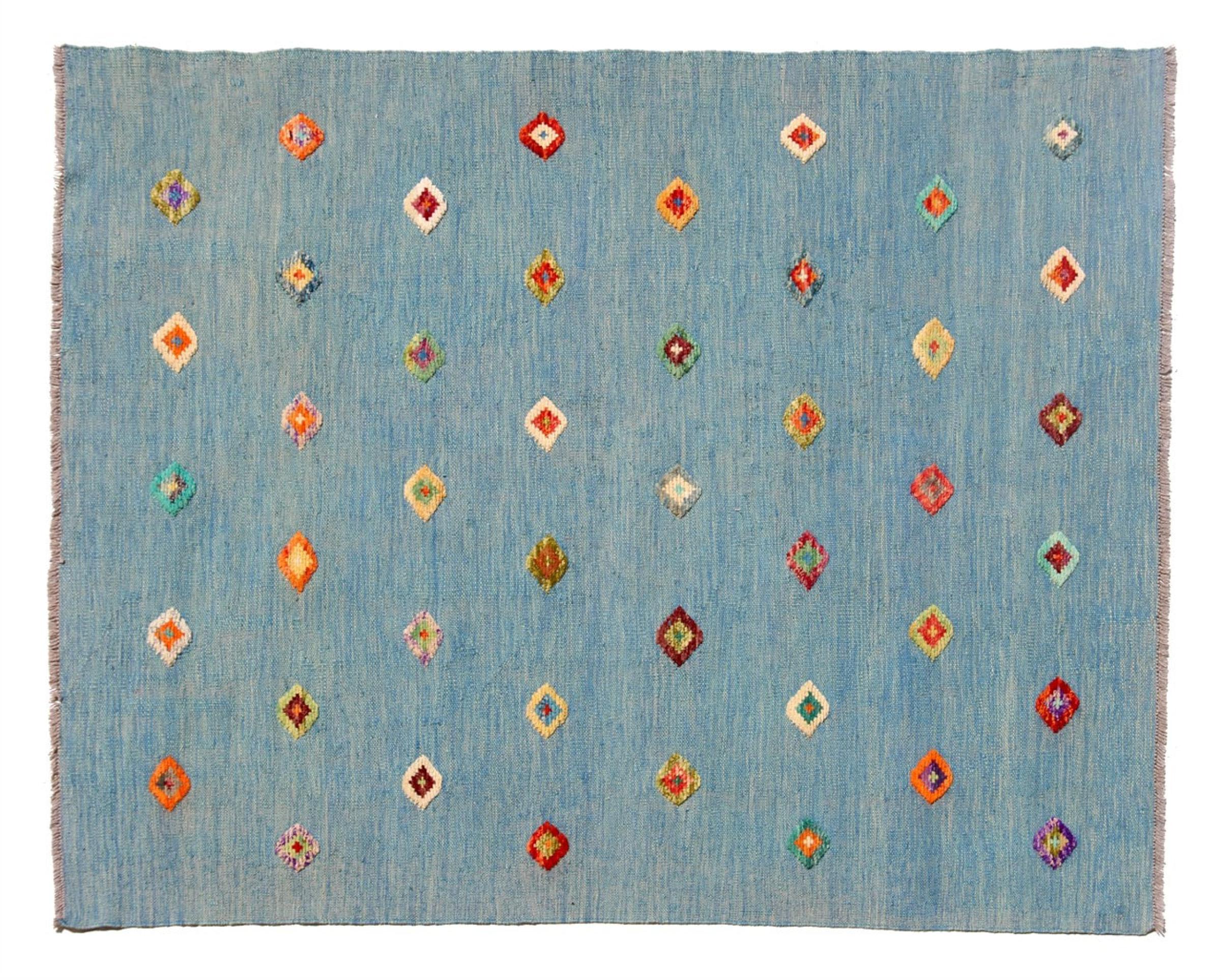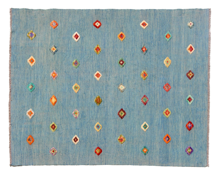 Esta alfombra fue hecha a mano en un telar como un tejido plano. Tejido plano es el término utilizado para describir las alfombras que no tienen pelo. Como el nombre promete, estas alfombras están tejidas y no anudadas. Esto resulta en una alfombra plana con una superficie estructurada. Los tejidos planos no son tan suaves y normalmente más delgados que las alfombras anudadas. Al mismo tiempo, su fabricación es mucho menos compleja y por lo general se pueden disponer por ambos lados (frontal y posterior). Sus patrones suelen ser geométricos, lo cual está determinado por el tejido.