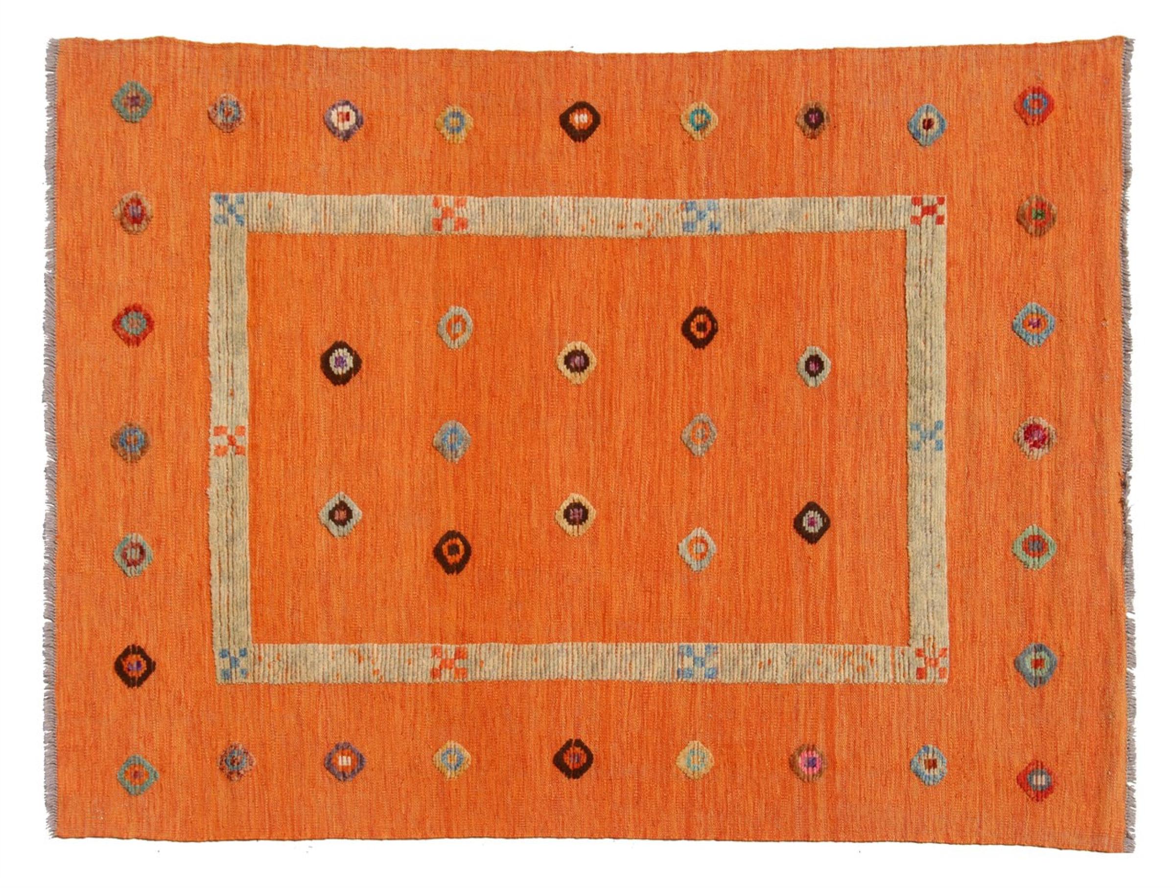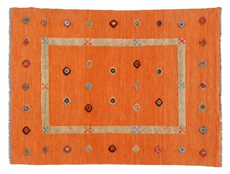 Esta alfombra fue hecha a mano en un telar como un tejido plano. Tejido plano es el término utilizado para describir las alfombras que no tienen pelo. Como el nombre promete, estas alfombras están tejidas y no anudadas. Esto resulta en una alfombra plana con una superficie estructurada. Los tejidos planos no son tan suaves y normalmente más delgados que las alfombras anudadas. Al mismo tiempo, su fabricación es mucho menos compleja y por lo general se pueden disponer por ambos lados (frontal y posterior). Sus patrones suelen ser geométricos, lo cual está determinado por el tejido.