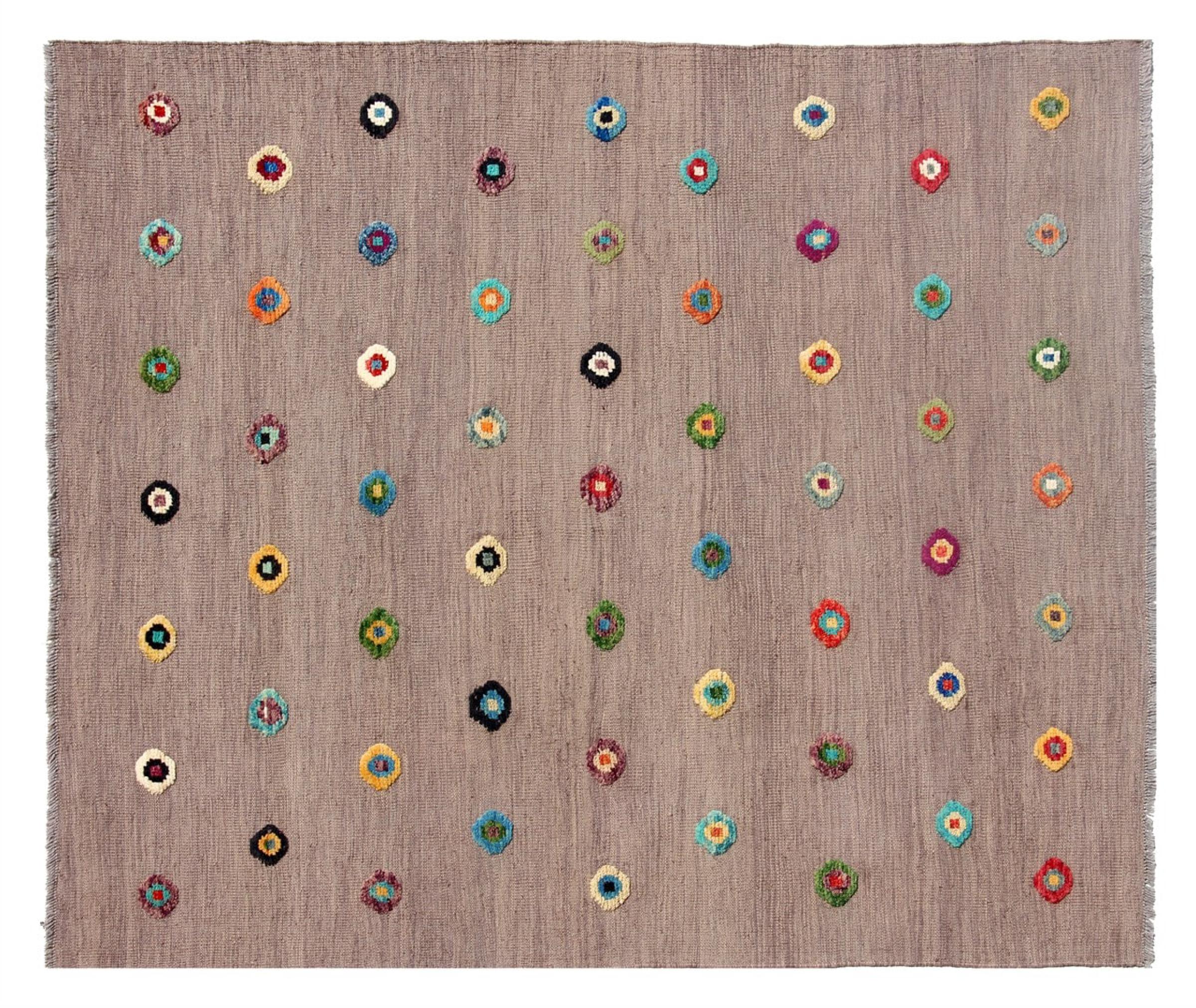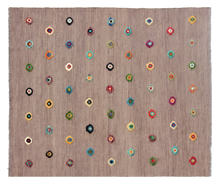 Esta alfombra fue hecha a mano en un telar como un tejido plano. Tejido plano es el término utilizado para describir las alfombras que no tienen pelo. Como el nombre promete, estas alfombras están tejidas y no anudadas. Esto resulta en una alfombra plana con una superficie estructurada. Los tejidos planos no son tan suaves y normalmente más delgados que las alfombras anudadas. Al mismo tiempo, su fabricación es mucho menos compleja y por lo general se pueden disponer por ambos lados (frontal y posterior). Sus patrones suelen ser geométricos, lo cual está determinado por el tejido.