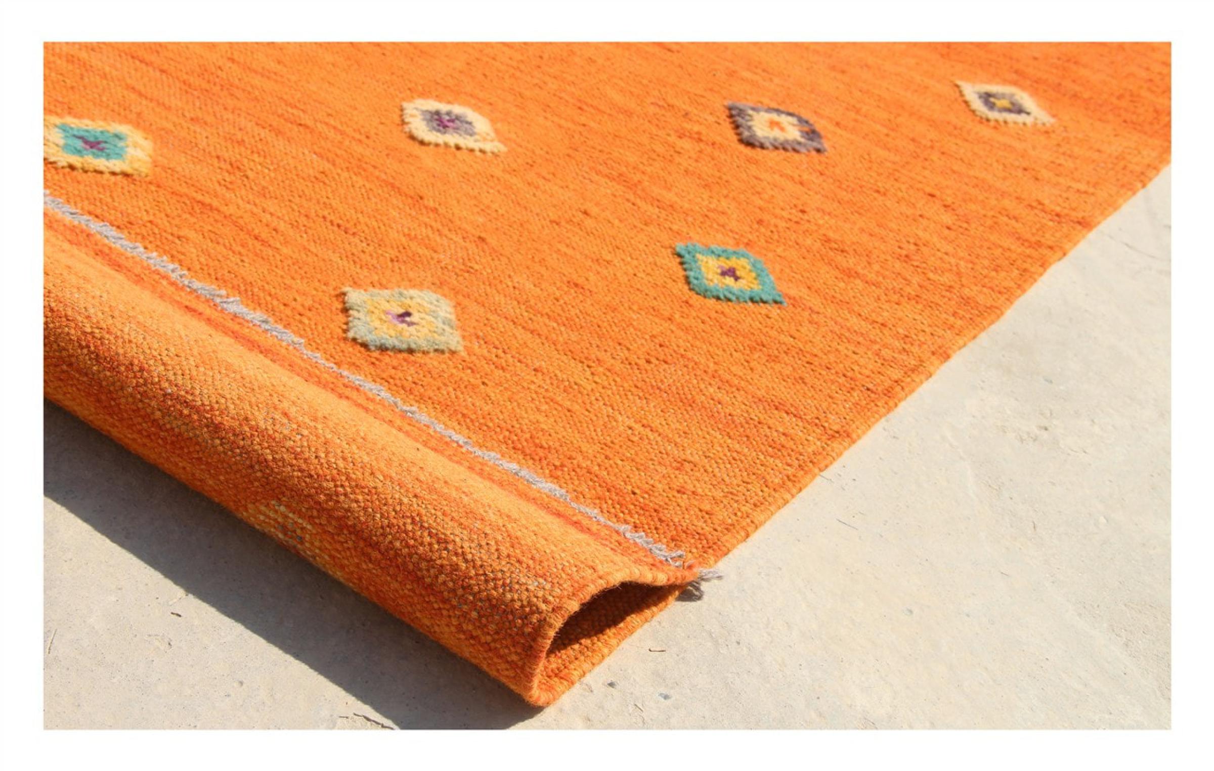 Estas alfombras kilim muestran una diferencia decisiva con las alfombras anudadas a mano - son tejidas a mano. Por lo tanto, no tienen un montón alto de lana y son a menudo más planos y más ásperos que las alfombras de lana anudada. Su fabricación es menos elaborada y por eso suelen ser mucho más baratas. Como ventaja, las alfombras de kilim son también mucho más ligeras y pueden ser colocadas por delante y por detrás. Los kilims tejidos a mano provienen originalmente de la antigua Persia y ahora también se fabrican a menudo en el Afganistán. Tienen patrones bastante simples y directos, que se deben a su técnica de tejido.