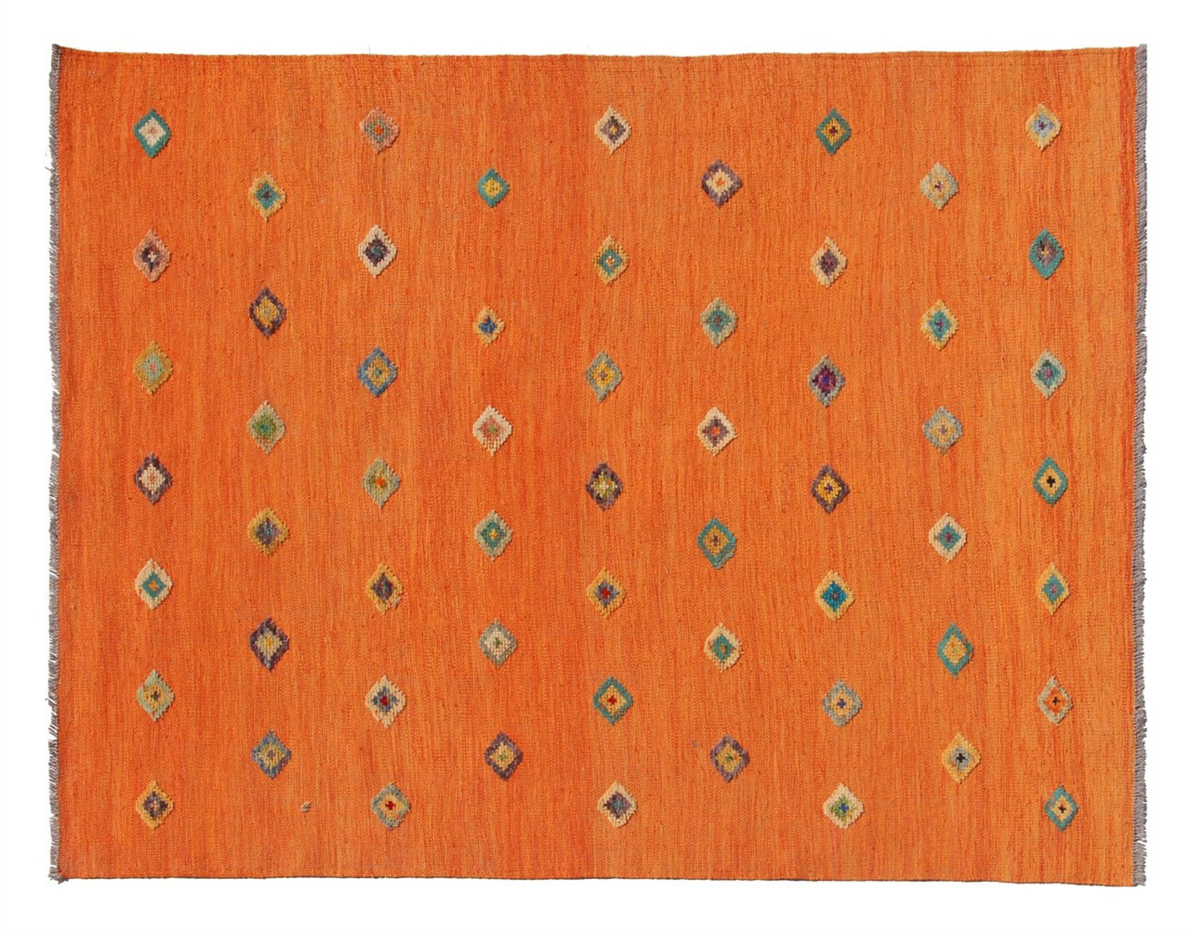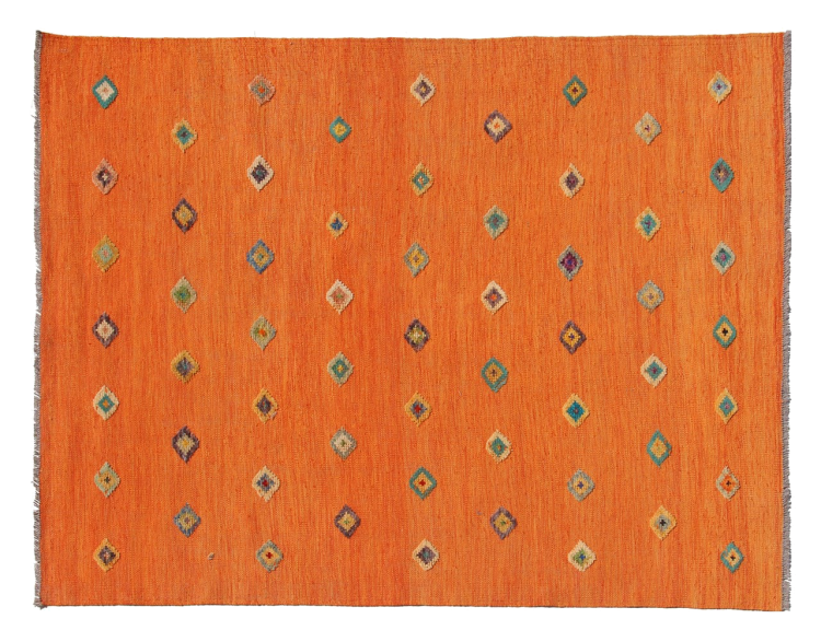 Esta alfombra fue hecha a mano en un telar como un tejido plano. Tejido plano es el término utilizado para describir las alfombras que no tienen pelo. Como el nombre promete, estas alfombras están tejidas y no anudadas. Esto resulta en una alfombra plana con una superficie estructurada. Los tejidos planos no son tan suaves y normalmente más delgados que las alfombras anudadas. Al mismo tiempo, su fabricación es mucho menos compleja y por lo general se pueden disponer por ambos lados (frontal y posterior). Sus patrones suelen ser geométricos, lo cual está determinado por el tejido.