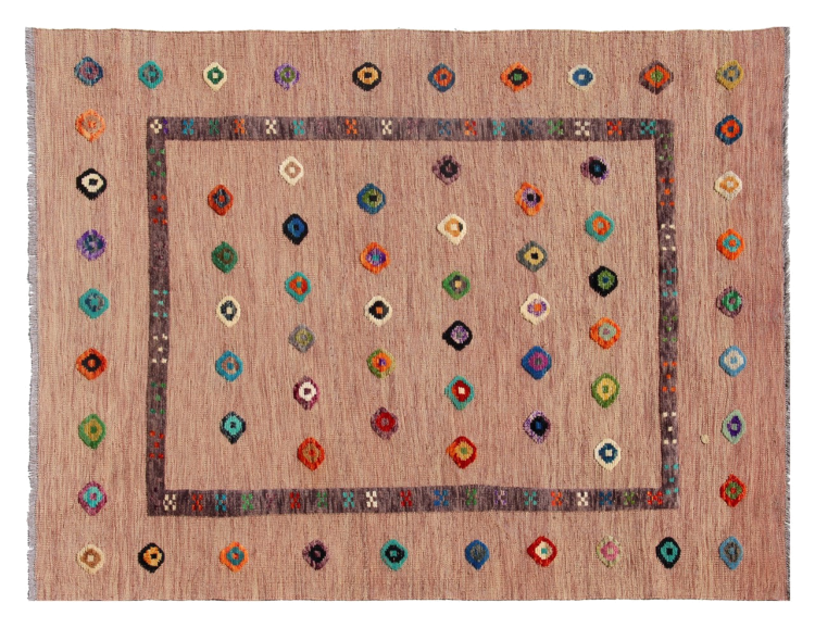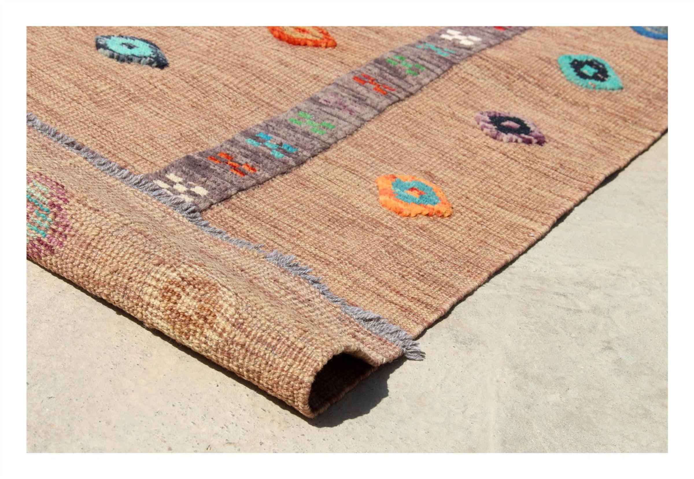 Esta alfombra fue hecha a mano en un telar como un tejido plano. Tejido plano es el término utilizado para describir las alfombras que no tienen pelo. Como el nombre promete, estas alfombras están tejidas y no anudadas. Esto resulta en una alfombra plana con una superficie estructurada. Los tejidos planos no son tan suaves y normalmente más delgados que las alfombras anudadas. Al mismo tiempo, su fabricación es mucho menos compleja y por lo general se pueden disponer por ambos lados (frontal y posterior). Sus patrones suelen ser geométricos, lo cual está determinado por el tejido.