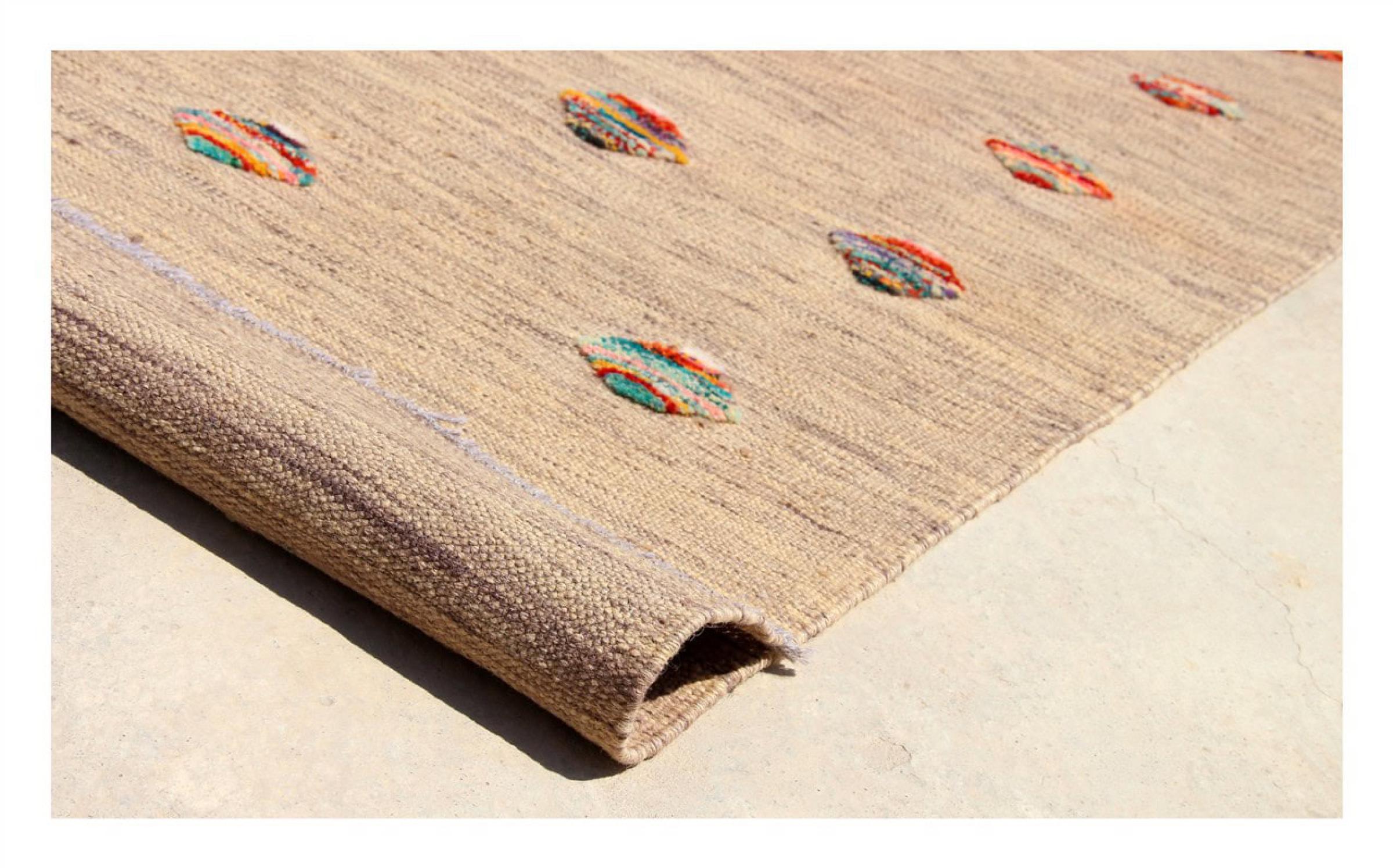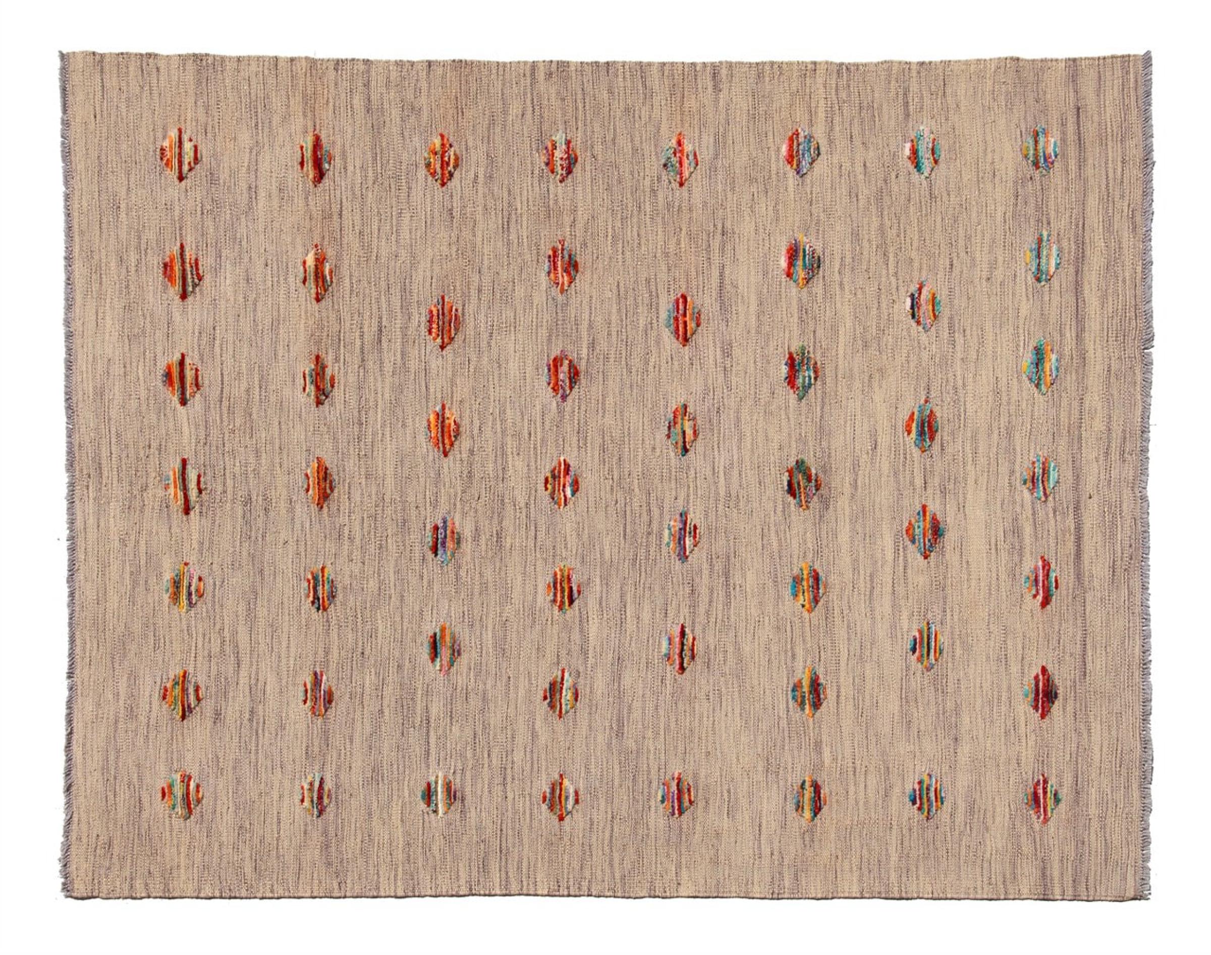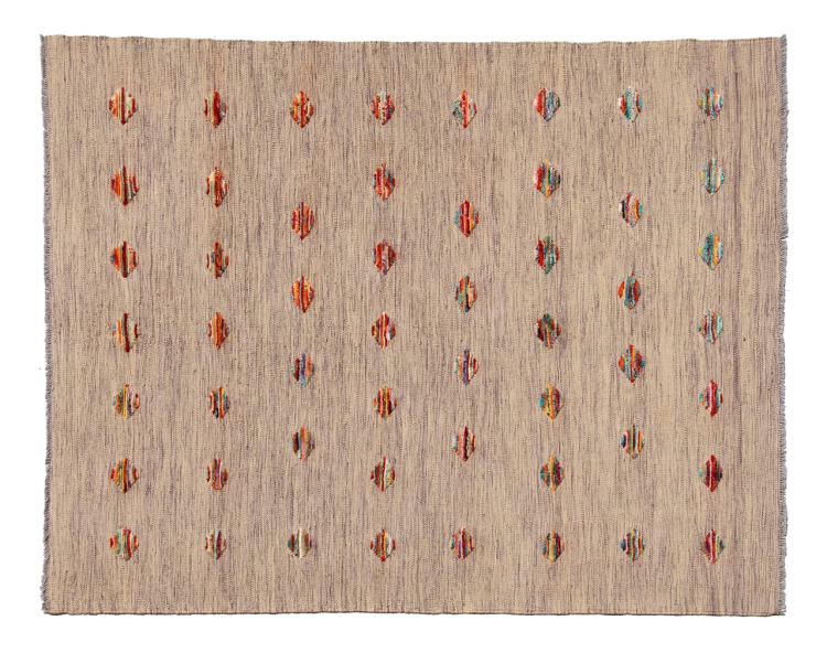 Esta alfombra fue hecha a mano en un telar como un tejido plano. Tejido plano es el término utilizado para describir las alfombras que no tienen pelo. Como el nombre promete, estas alfombras están tejidas y no anudadas. Esto resulta en una alfombra plana con una superficie estructurada. Los tejidos planos no son tan suaves y normalmente más delgados que las alfombras anudadas. Al mismo tiempo, su fabricación es mucho menos compleja y por lo general se pueden disponer por ambos lados (frontal y posterior). Sus patrones suelen ser geométricos, lo cual está determinado por el tejido.