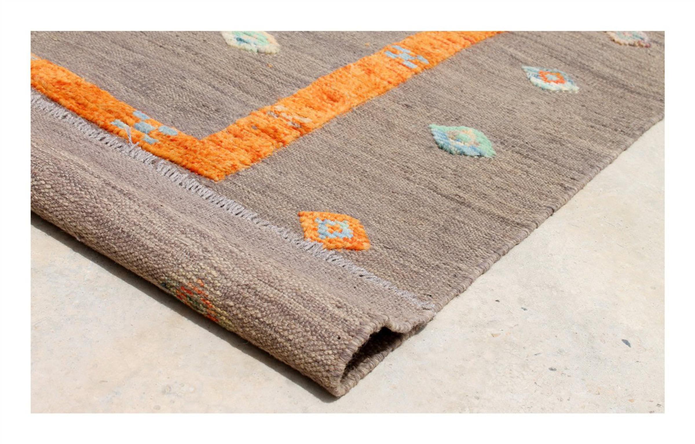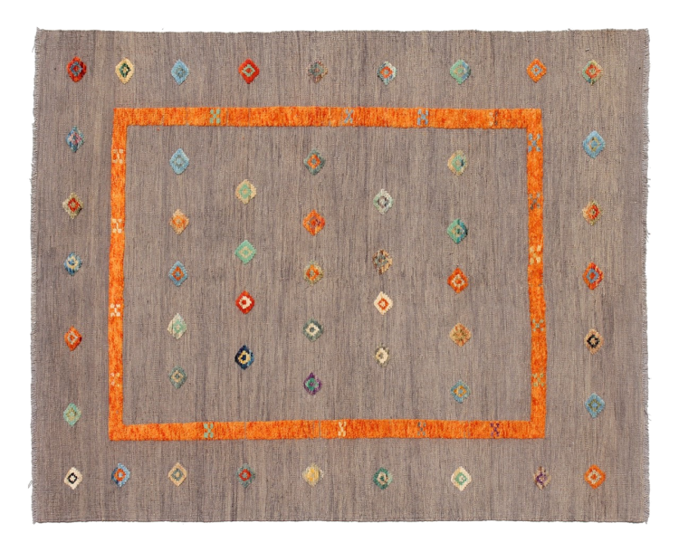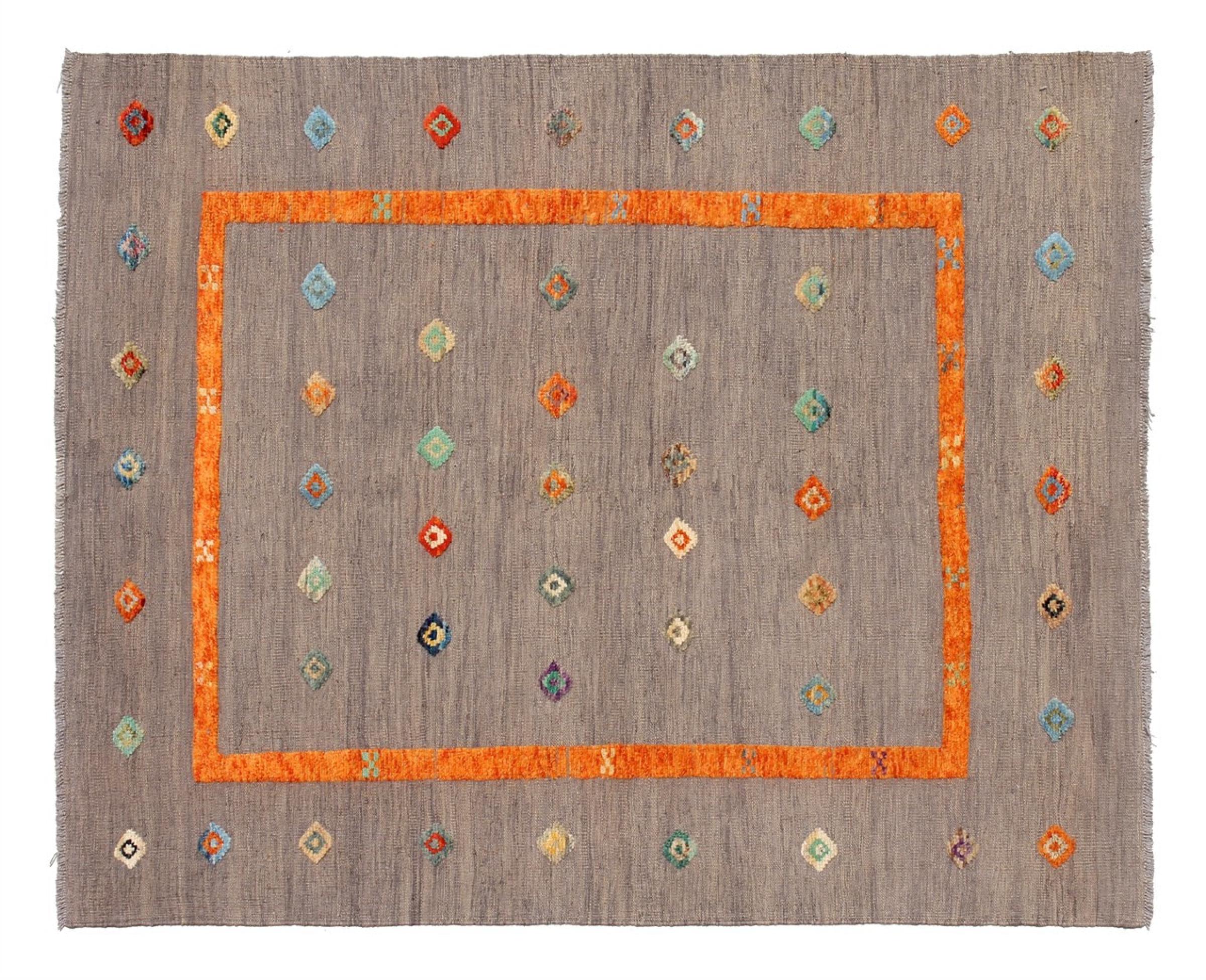 Esta alfombra fue hecha a mano en un telar como un tejido plano. Tejido plano es el término utilizado para describir las alfombras que no tienen pelo. Como el nombre promete, estas alfombras están tejidas y no anudadas. Esto resulta en una alfombra plana con una superficie estructurada. Los tejidos planos no son tan suaves y normalmente más delgados que las alfombras anudadas. Al mismo tiempo, su fabricación es mucho menos compleja y por lo general se pueden disponer por ambos lados (frontal y posterior). Sus patrones suelen ser geométricos, lo cual está determinado por el tejido.