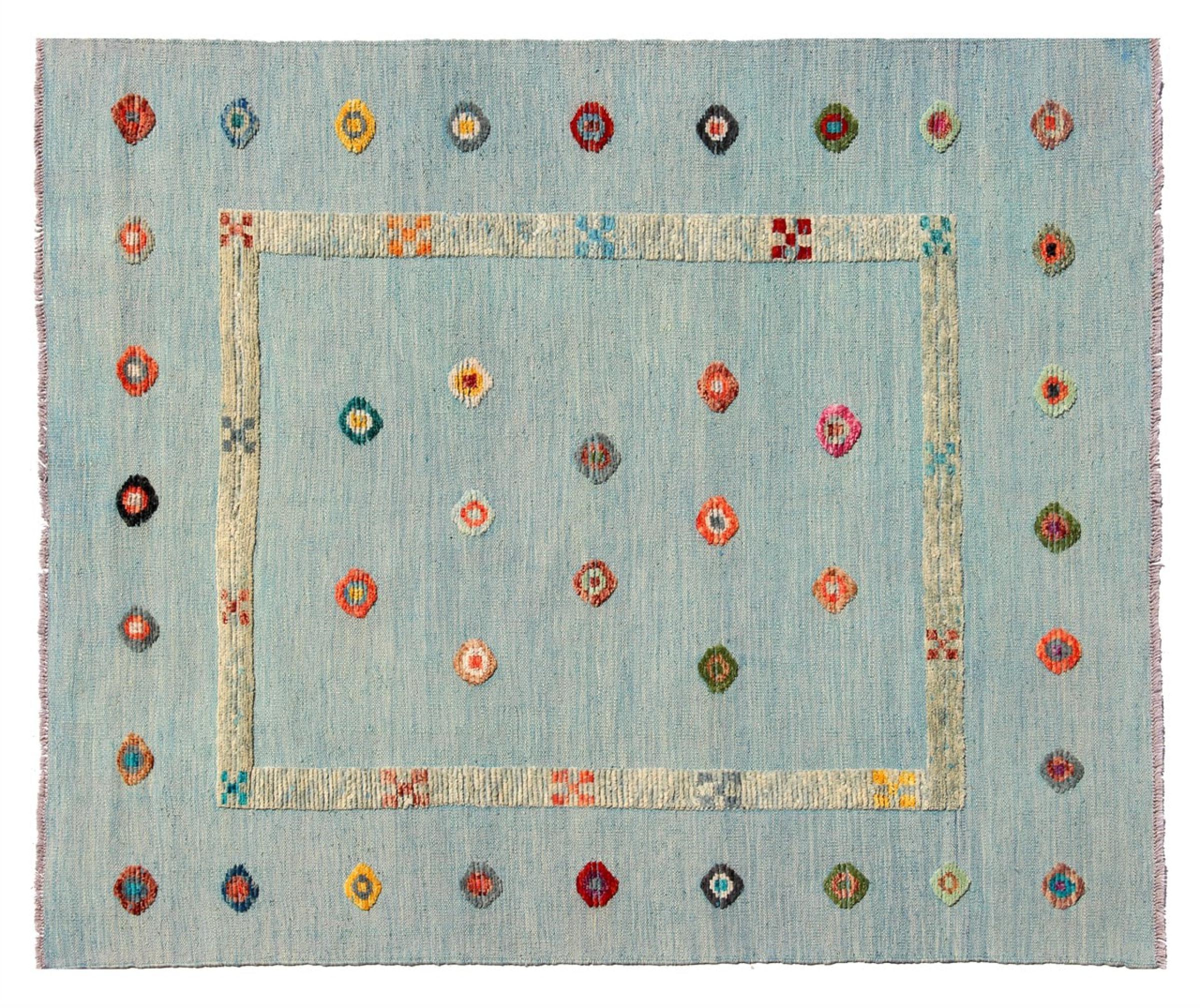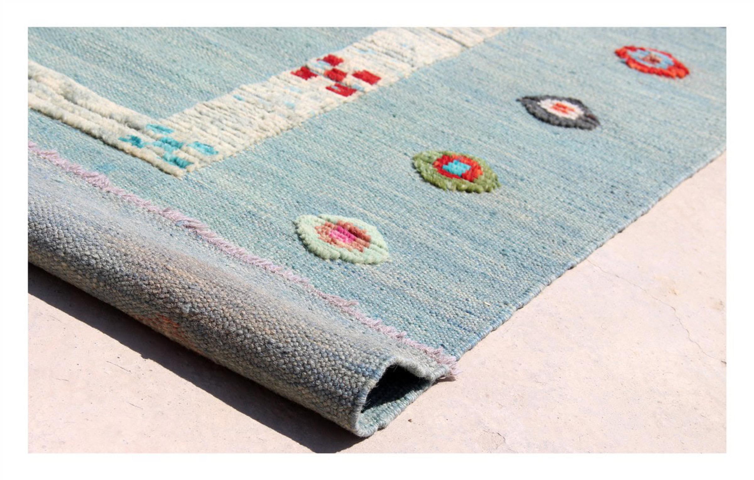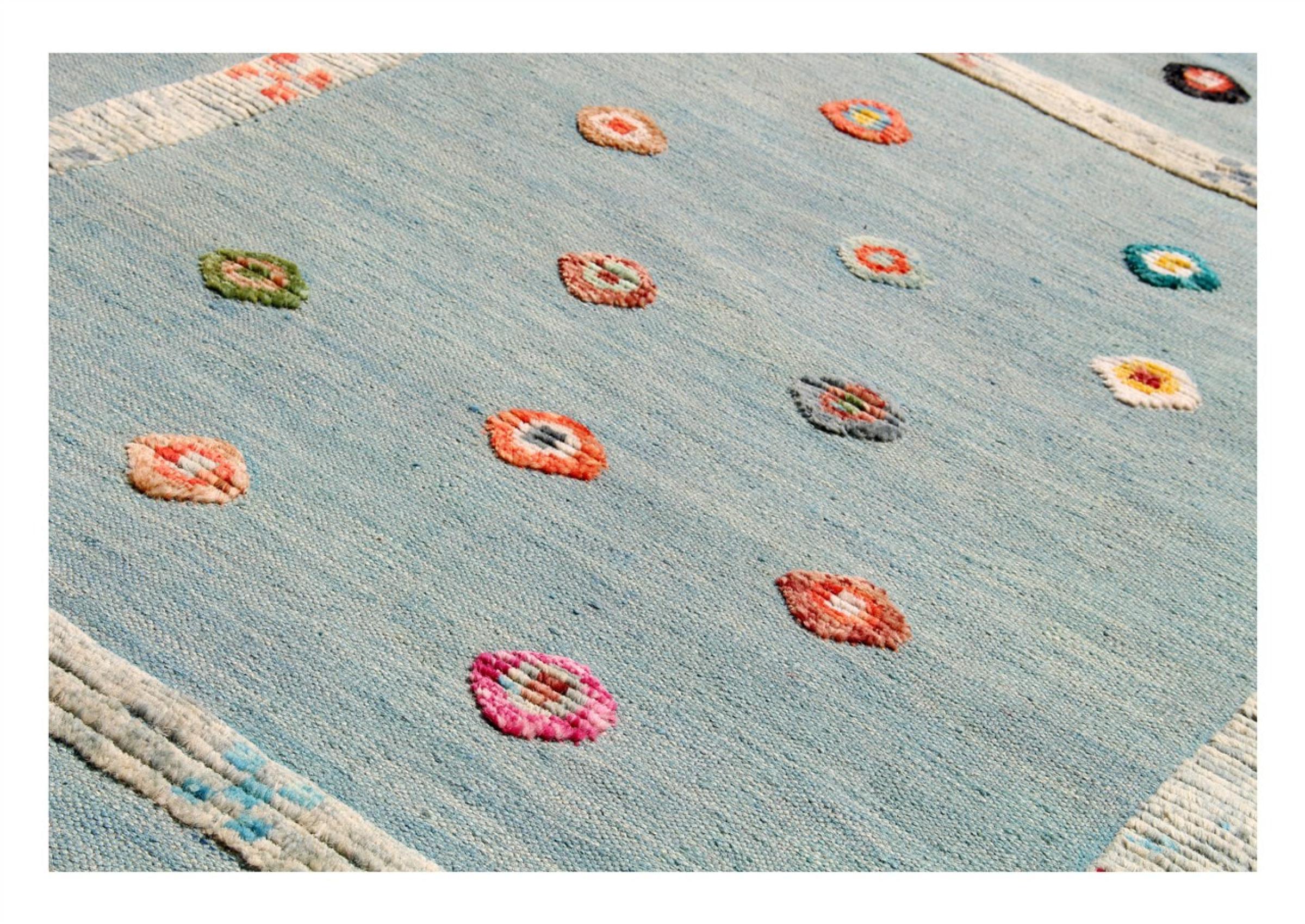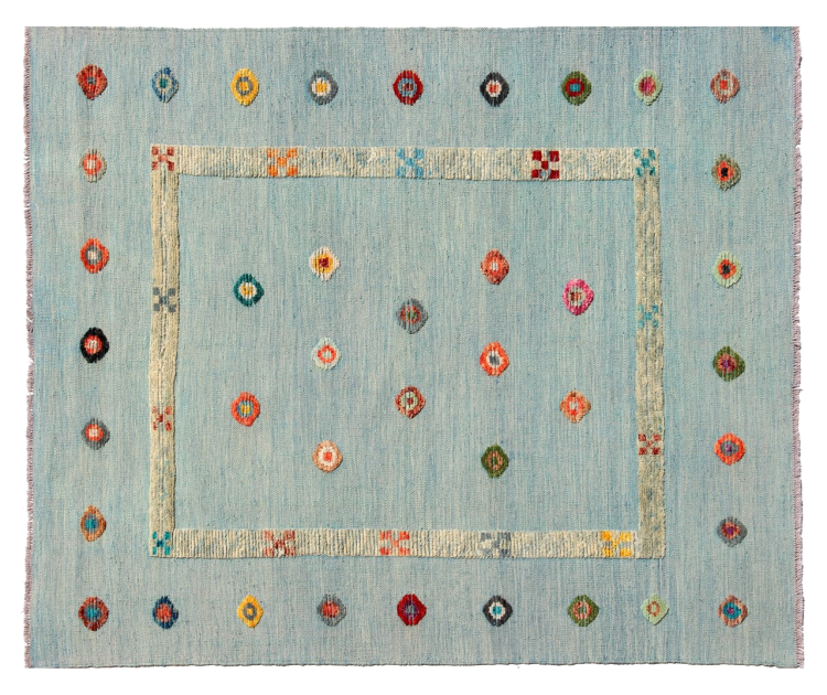 Esta alfombra fue hecha a mano en un telar como un tejido plano. Tejido plano es el término utilizado para describir las alfombras que no tienen pelo. Como el nombre promete, estas alfombras están tejidas y no anudadas. Esto resulta en una alfombra plana con una superficie estructurada. Los tejidos planos no son tan suaves y normalmente más delgados que las alfombras anudadas. Al mismo tiempo, su fabricación es mucho menos compleja y por lo general se pueden disponer por ambos lados (frontal y posterior). Sus patrones suelen ser geométricos, lo cual está determinado por el tejido.