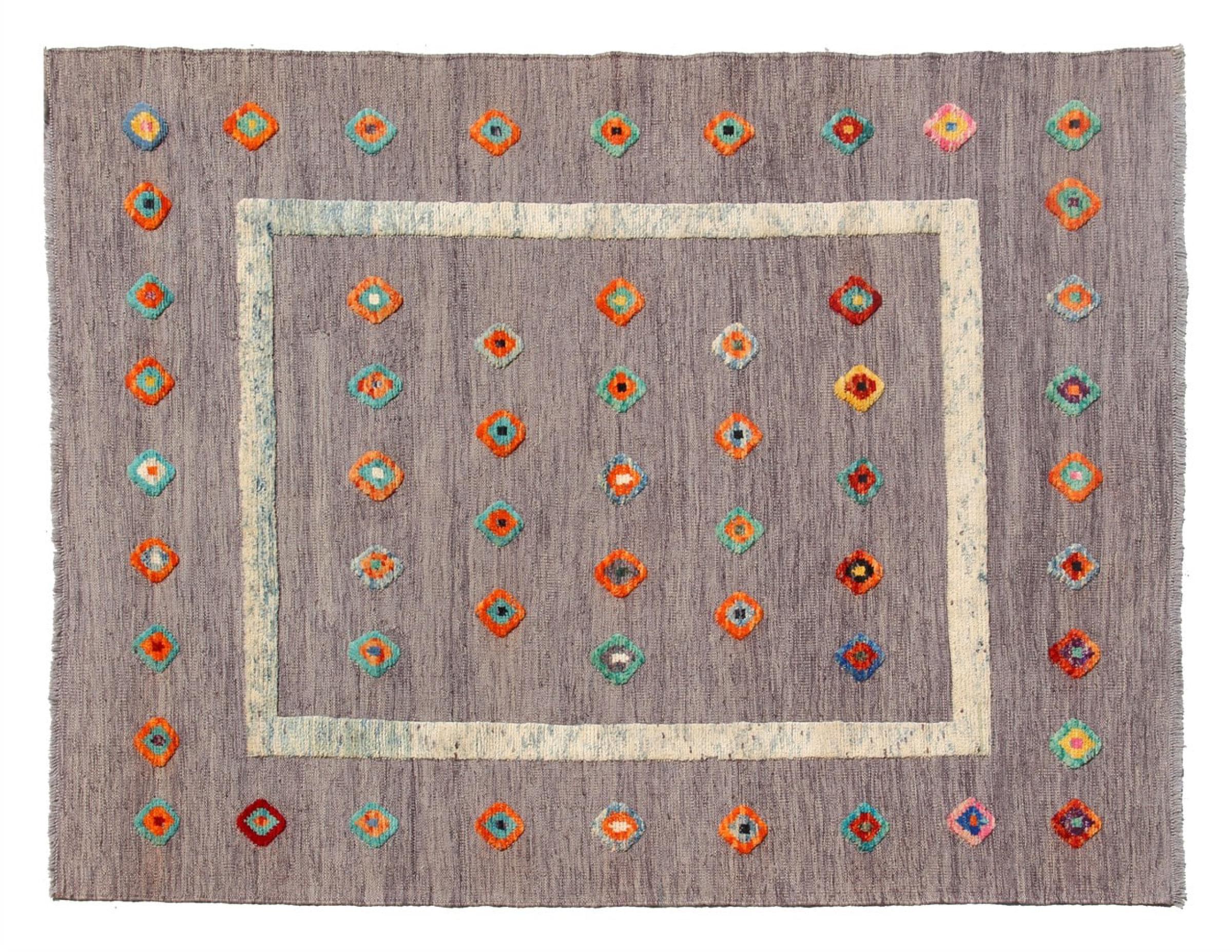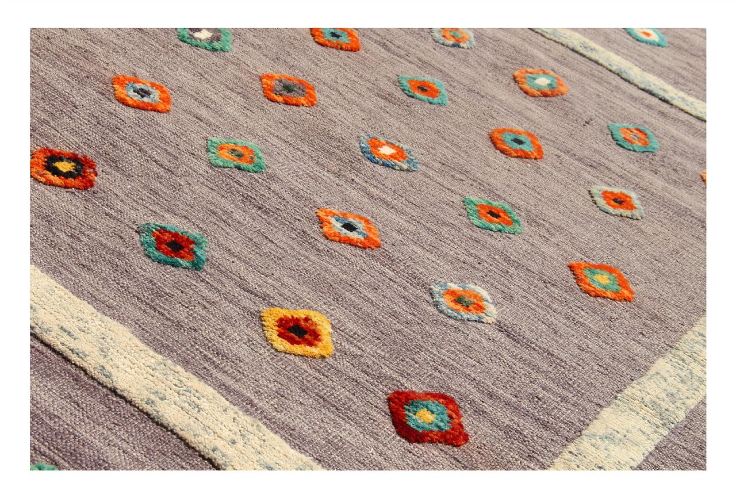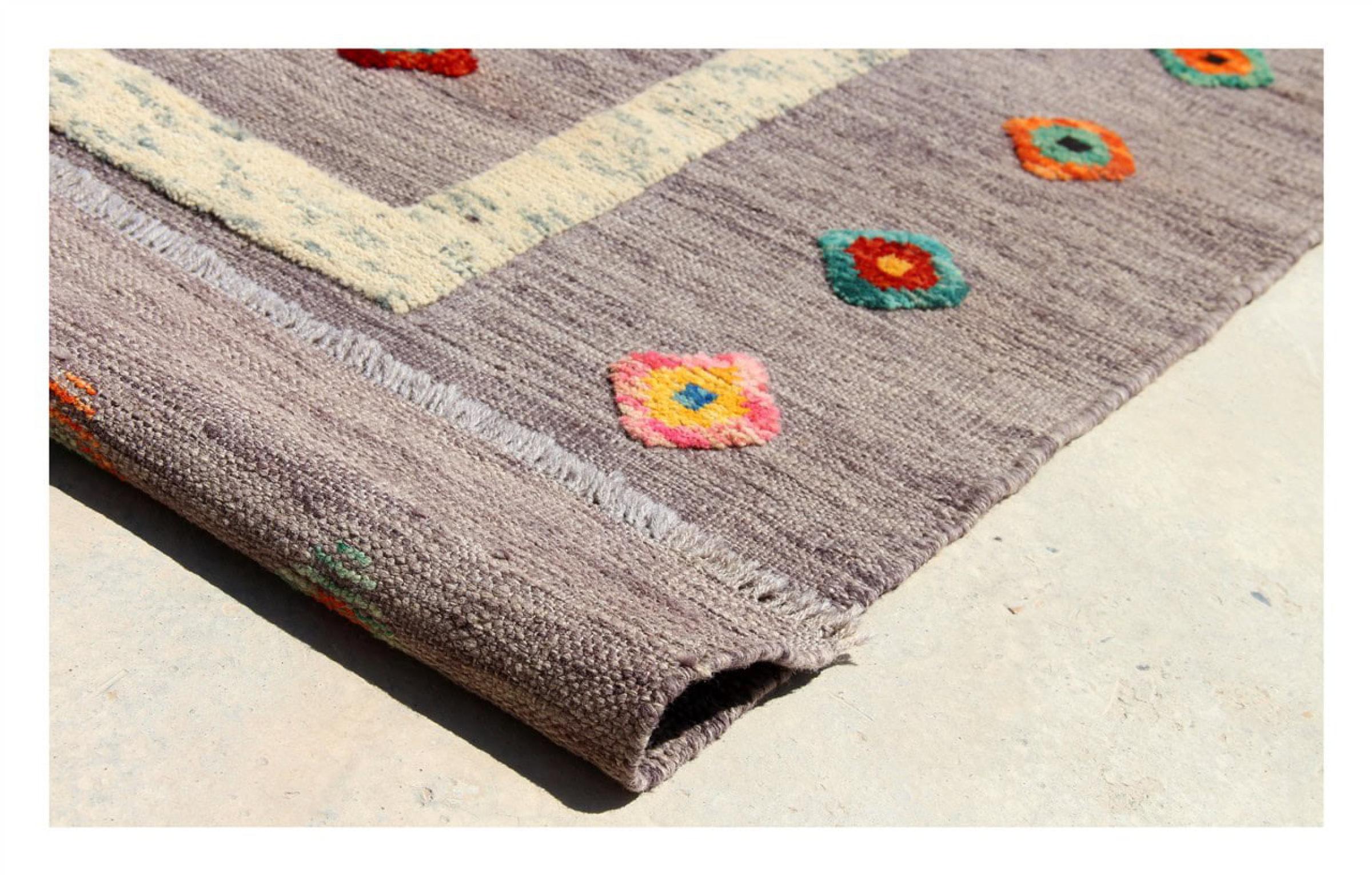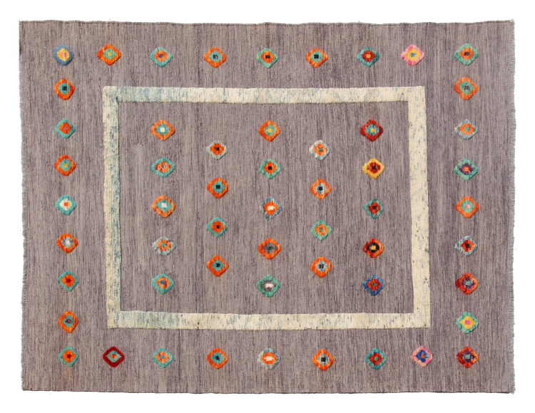 Esta alfombra fue hecha a mano en un telar como un tejido plano. Tejido plano es el término utilizado para describir las alfombras que no tienen pelo. Como el nombre promete, estas alfombras están tejidas y no anudadas. Esto resulta en una alfombra plana con una superficie estructurada. Los tejidos planos no son tan suaves y normalmente más delgados que las alfombras anudadas. Al mismo tiempo, su fabricación es mucho menos compleja y por lo general se pueden disponer por ambos lados (frontal y posterior). Sus patrones suelen ser geométricos, lo cual está determinado por el tejido.