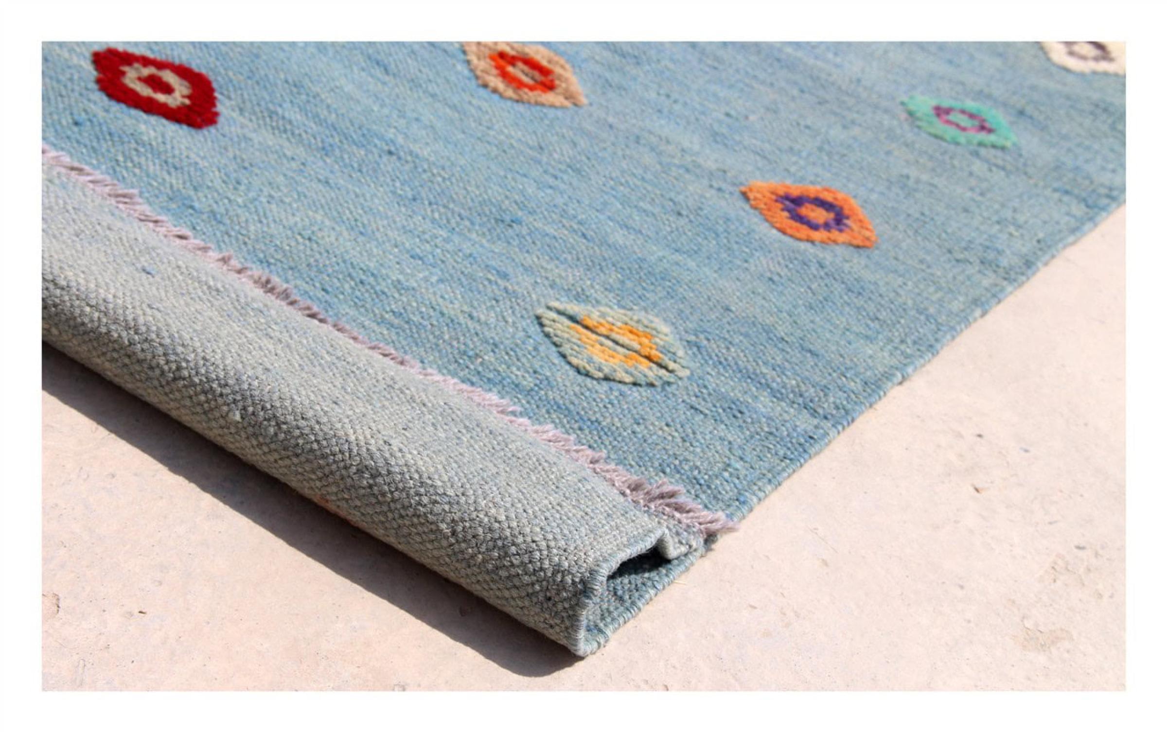 Estas alfombras kilim muestran una diferencia decisiva con las alfombras anudadas a mano - son tejidas a mano. Por lo tanto, no tienen un montón alto de lana y son a menudo más planos y más ásperos que las alfombras de lana anudada. Su fabricación es menos elaborada y por eso suelen ser mucho más baratas. Como ventaja, las alfombras de kilim son también mucho más ligeras y pueden ser colocadas por delante y por detrás. Los kilims tejidos a mano provienen originalmente de la antigua Persia y ahora también se fabrican a menudo en el Afganistán. Tienen patrones bastante simples y directos, que se deben a su técnica de tejido.
