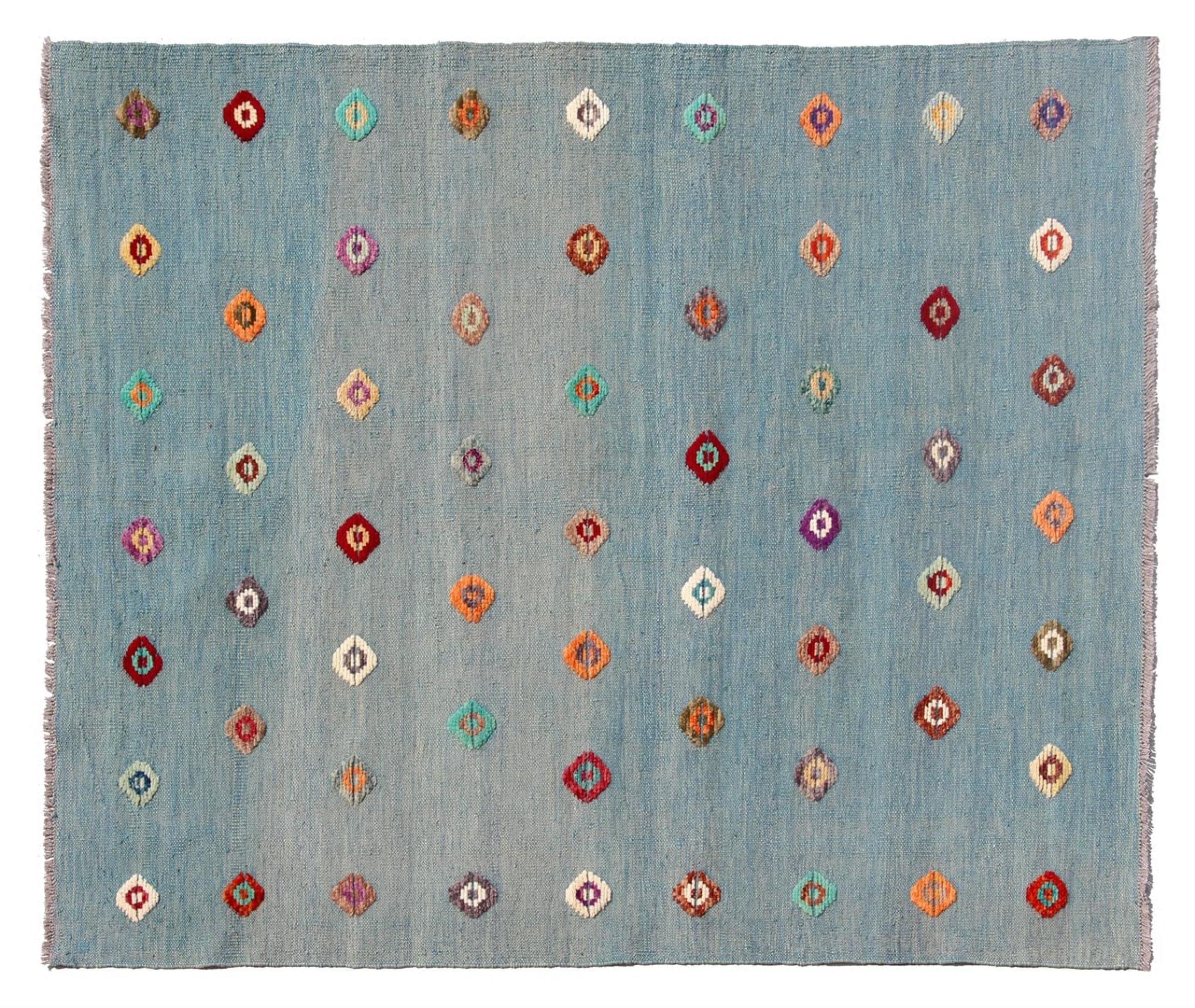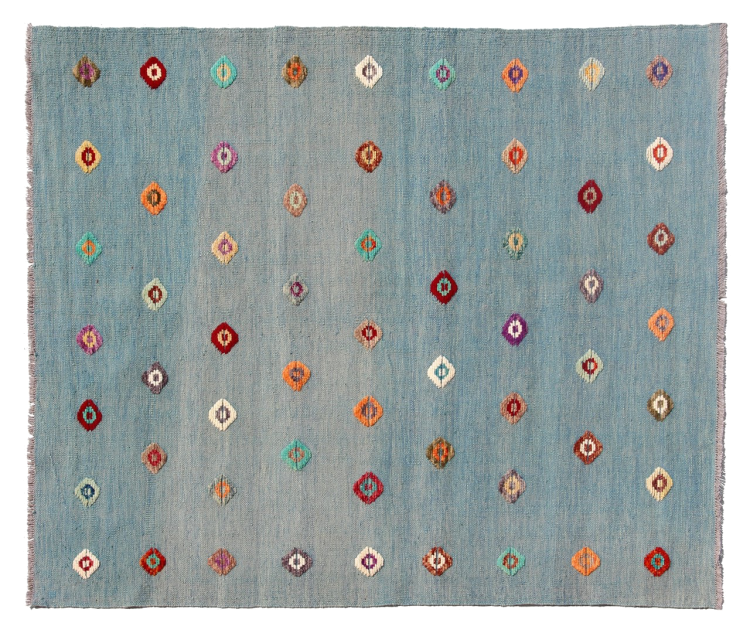 Esta alfombra fue hecha a mano en un telar como un tejido plano. Tejido plano es el término utilizado para describir las alfombras que no tienen pelo. Como el nombre promete, estas alfombras están tejidas y no anudadas. Esto resulta en una alfombra plana con una superficie estructurada. Los tejidos planos no son tan suaves y normalmente más delgados que las alfombras anudadas. Al mismo tiempo, su fabricación es mucho menos compleja y por lo general se pueden disponer por ambos lados (frontal y posterior). Sus patrones suelen ser geométricos, lo cual está determinado por el tejido.