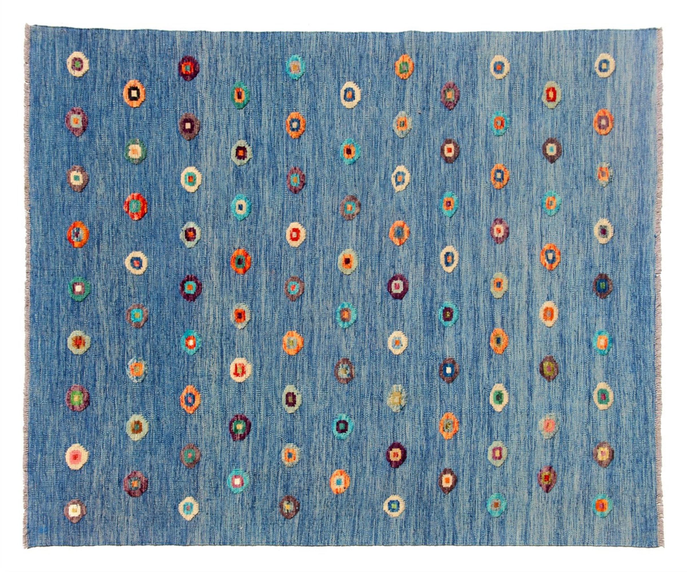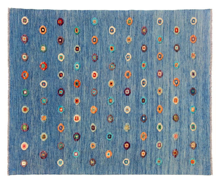 Esta alfombra fue hecha a mano en un telar como un tejido plano. Tejido plano es el término utilizado para describir las alfombras que no tienen pelo. Como el nombre promete, estas alfombras están tejidas y no anudadas. Esto resulta en una alfombra plana con una superficie estructurada. Los tejidos planos no son tan suaves y normalmente más delgados que las alfombras anudadas. Al mismo tiempo, su fabricación es mucho menos compleja y por lo general se pueden disponer por ambos lados (frontal y posterior). Sus patrones suelen ser geométricos, lo cual está determinado por el tejido.