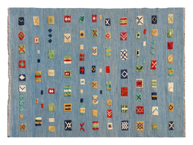 Estas alfombras kilim muestran una diferencia decisiva con las alfombras anudadas a mano - son tejidas a mano. Por lo tanto, no tienen un montón alto de lana y son a menudo más planos y más ásperos que las alfombras de lana anudada. Su fabricación es menos elaborada y por eso suelen ser mucho más baratas. Como ventaja, las alfombras de kilim son también mucho más ligeras y pueden ser colocadas por delante y por detrás. Los kilims tejidos a mano provienen originalmente de la antigua Persia y ahora también se fabrican a menudo en el Afganistán. Tienen patrones bastante simples y directos, que se deben a su técnica de tejido.