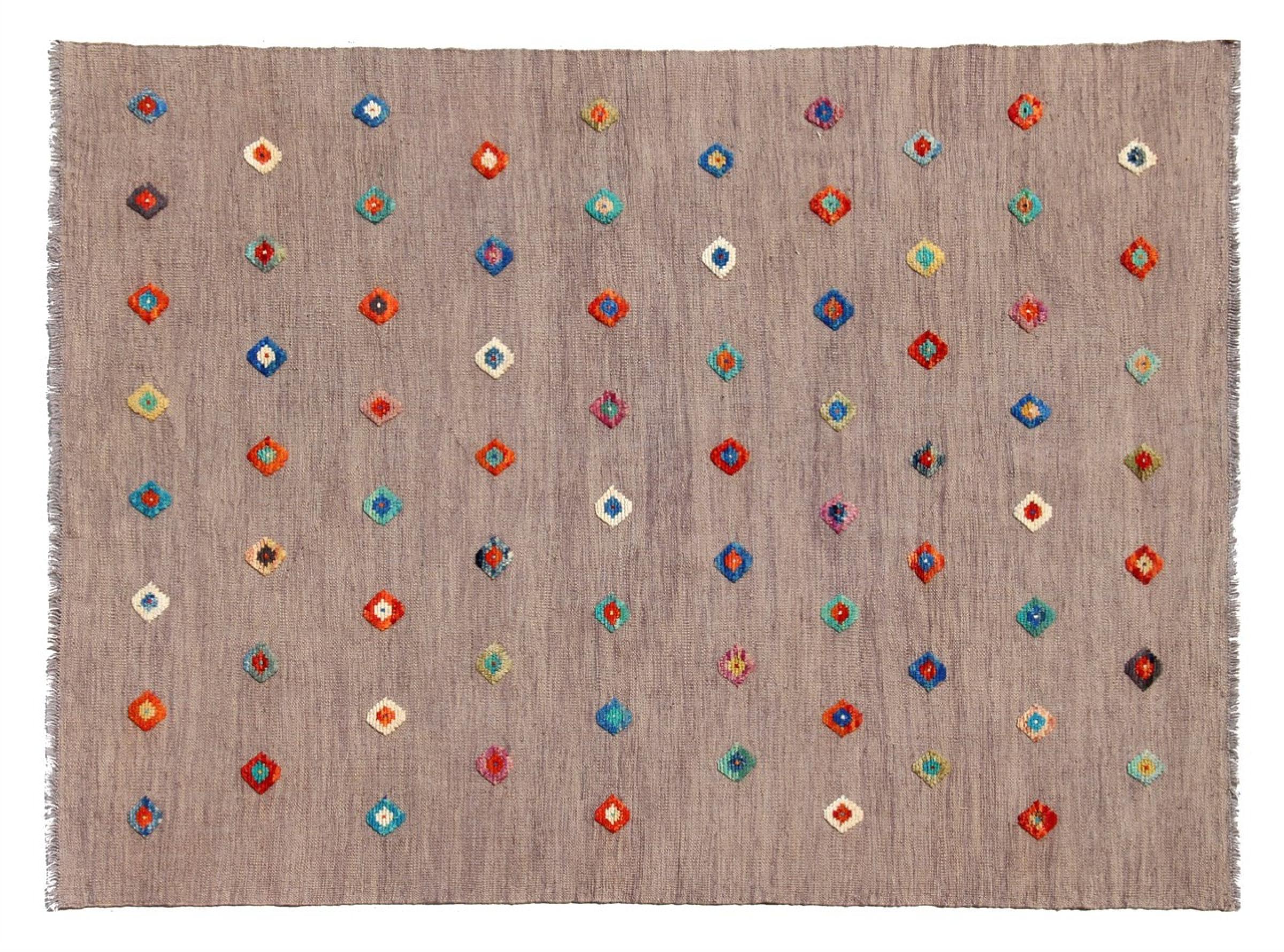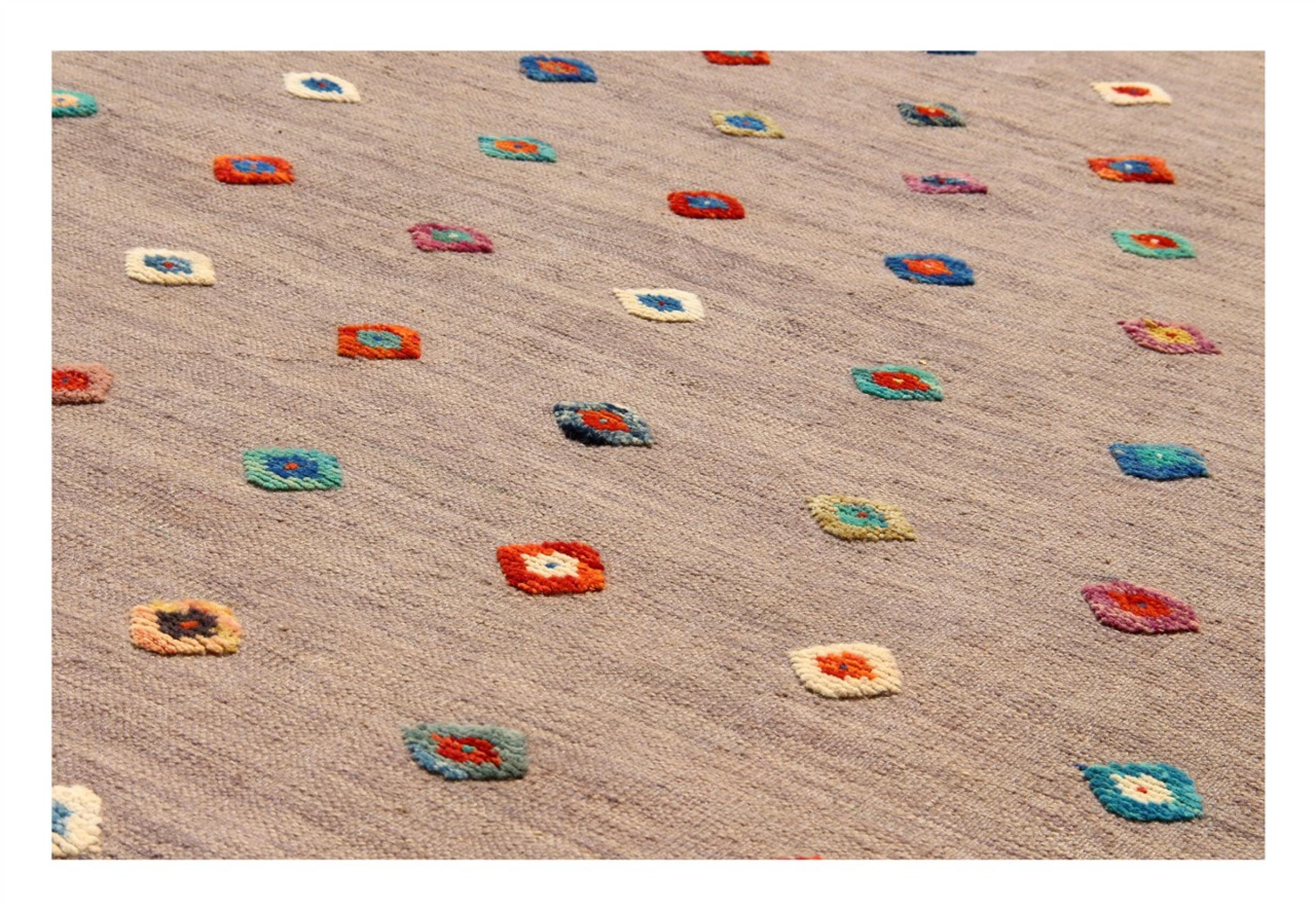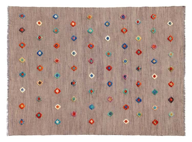 Esta alfombra fue hecha a mano en un telar como un tejido plano. Tejido plano es el término utilizado para describir las alfombras que no tienen pelo. Como el nombre promete, estas alfombras están tejidas y no anudadas. Esto resulta en una alfombra plana con una superficie estructurada. Los tejidos planos no son tan suaves y normalmente más delgados que las alfombras anudadas. Al mismo tiempo, su fabricación es mucho menos compleja y por lo general se pueden disponer por ambos lados (frontal y posterior). Sus patrones suelen ser geométricos, lo cual está determinado por el tejido.