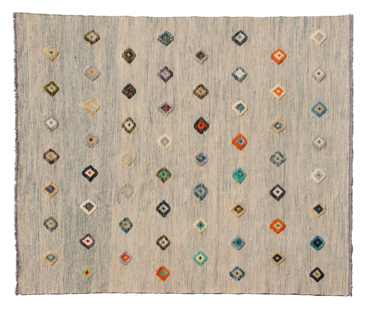 Esta alfombra fue hecha a mano en un telar como un tejido plano. Tejido plano es el término utilizado para describir las alfombras que no tienen pelo. Como el nombre promete, estas alfombras están tejidas y no anudadas. Esto resulta en una alfombra plana con una superficie estructurada. Los tejidos planos no son tan suaves y normalmente más delgados que las alfombras anudadas. Al mismo tiempo, su fabricación es mucho menos compleja y por lo general se pueden disponer por ambos lados (frontal y posterior). Sus patrones suelen ser geométricos, lo cual está determinado por el tejido.