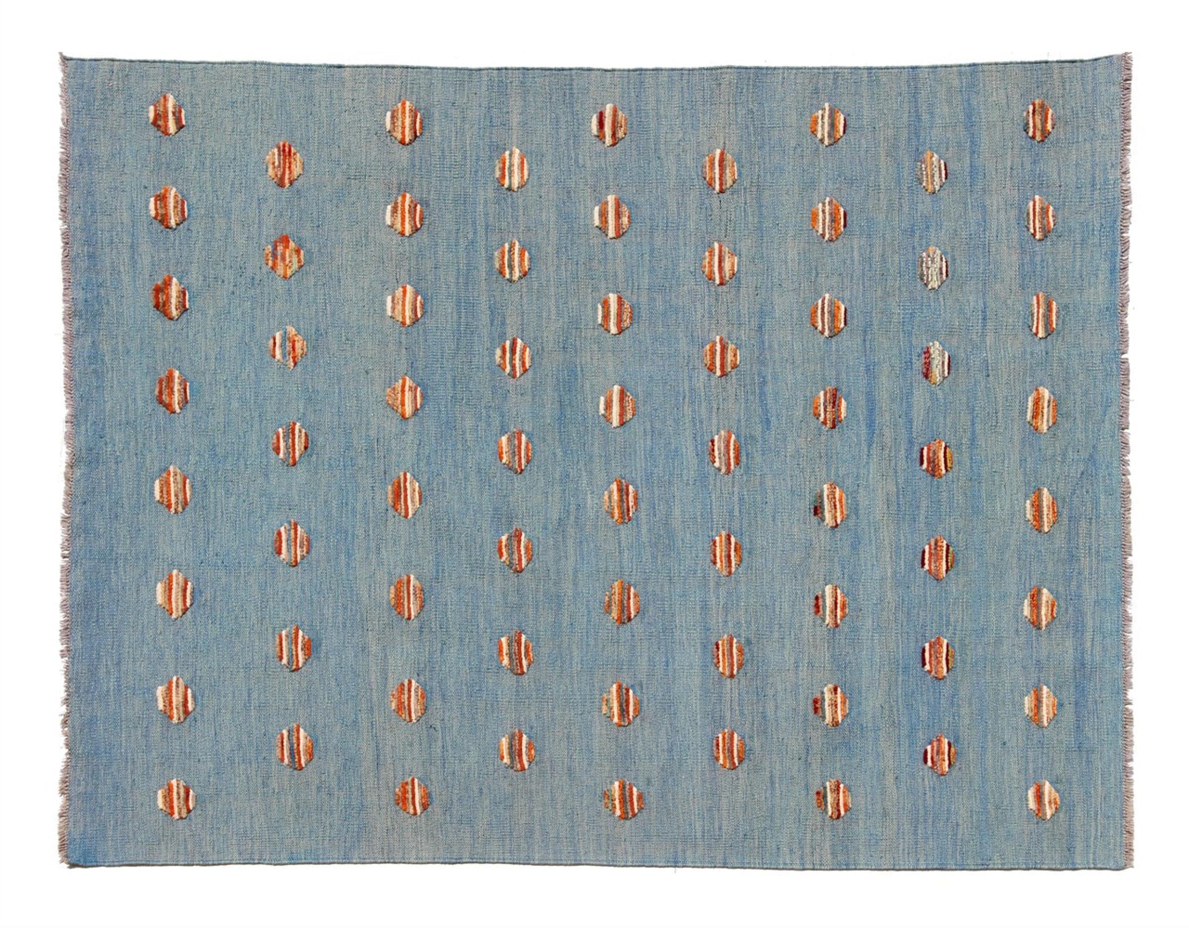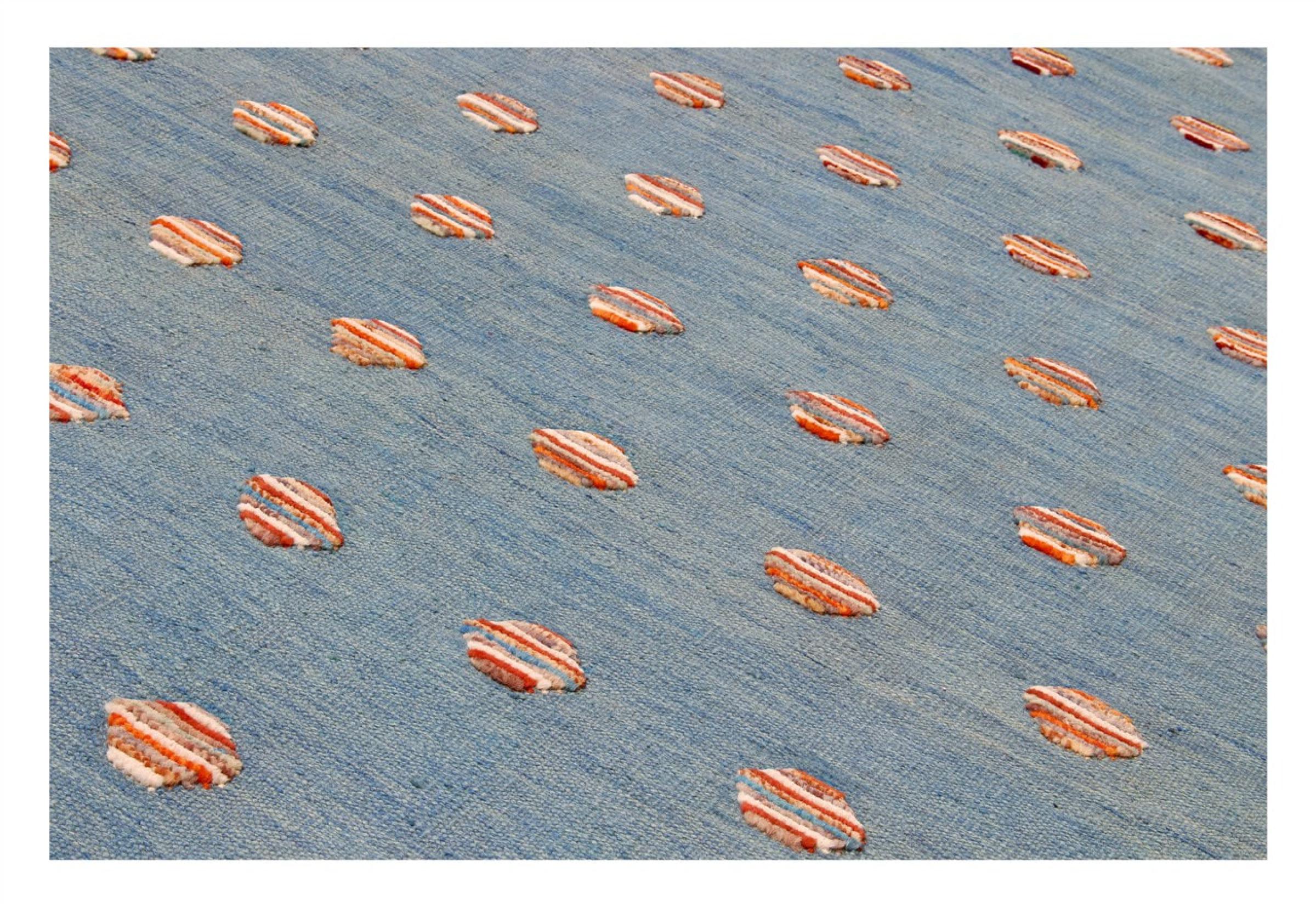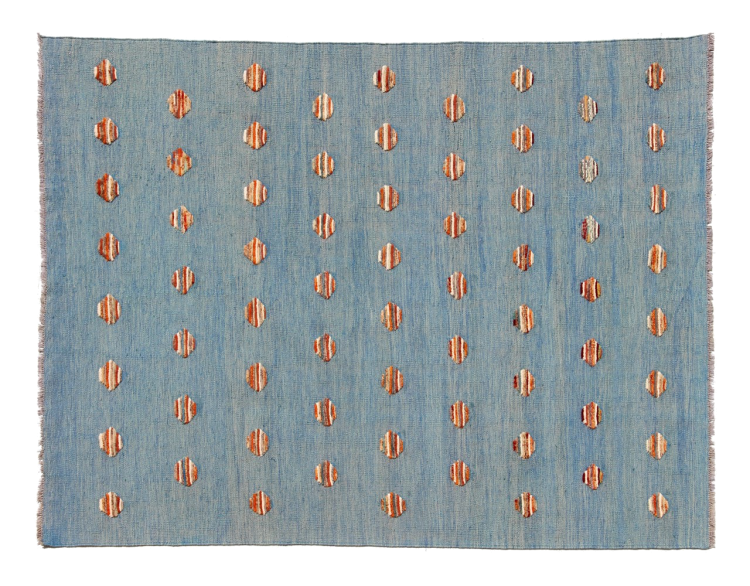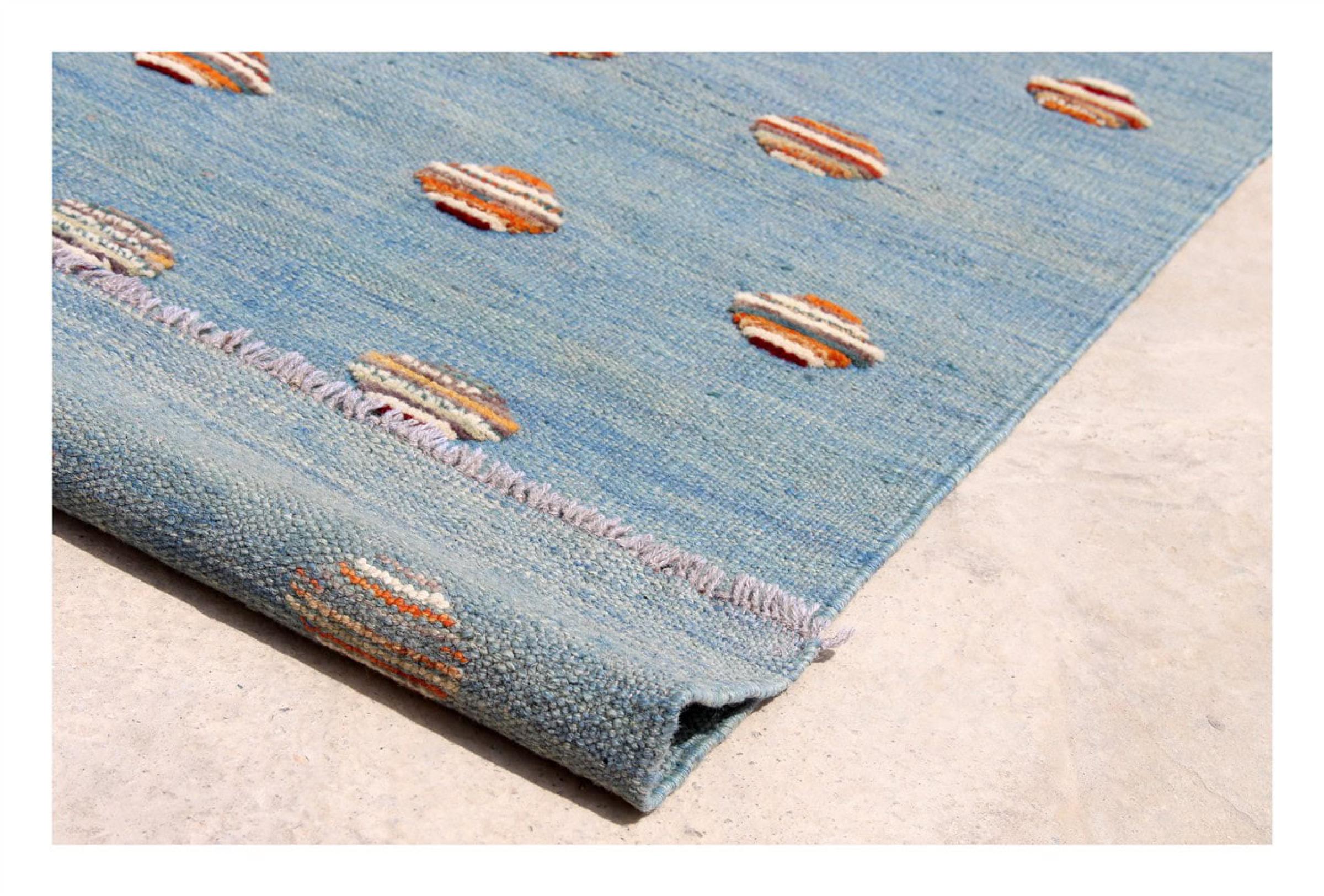 Esta alfombra fue hecha a mano en un telar como un tejido plano. Tejido plano es el término utilizado para describir las alfombras que no tienen pelo. Como el nombre promete, estas alfombras están tejidas y no anudadas. Esto resulta en una alfombra plana con una superficie estructurada. Los tejidos planos no son tan suaves y normalmente más delgados que las alfombras anudadas. Al mismo tiempo, su fabricación es mucho menos compleja y por lo general se pueden disponer por ambos lados (frontal y posterior). Sus patrones suelen ser geométricos, lo cual está determinado por el tejido.