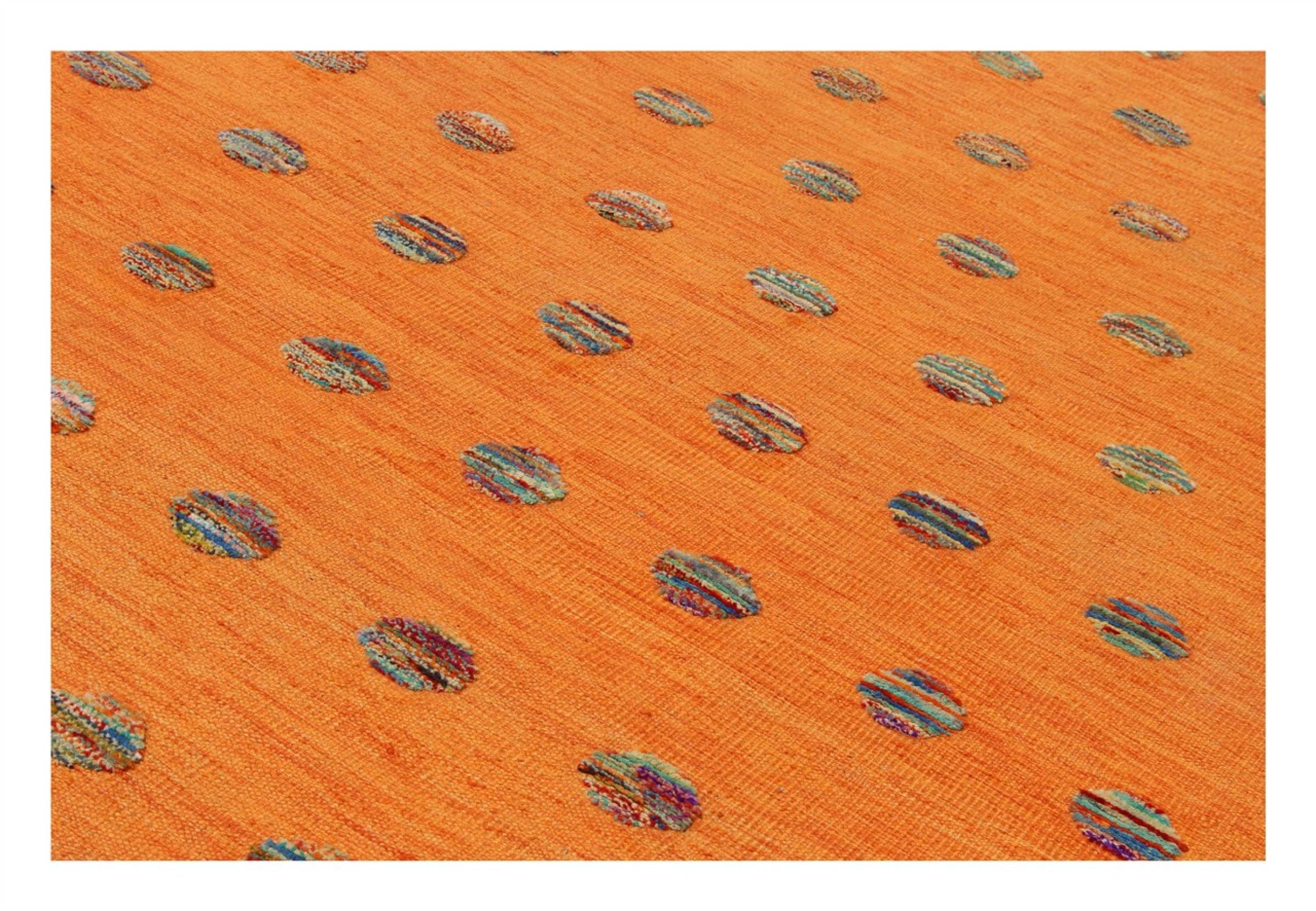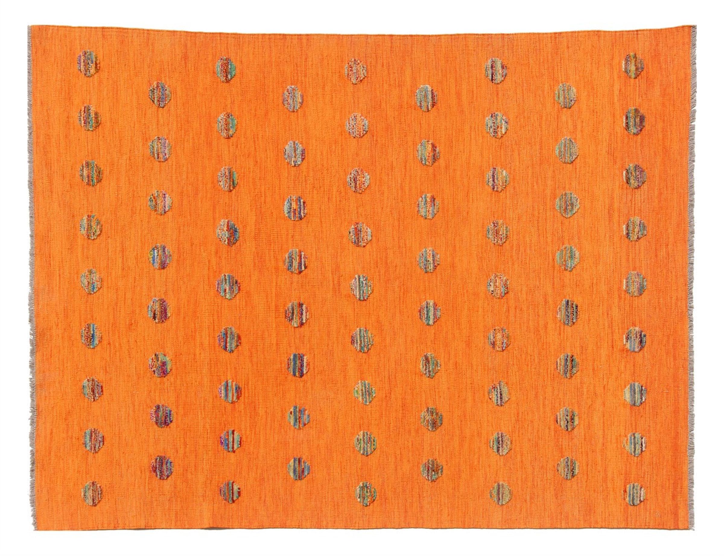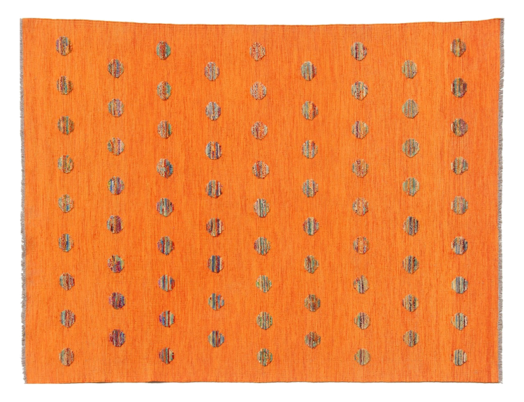 Esta alfombra fue hecha a mano en un telar como un tejido plano. Tejido plano es el término utilizado para describir las alfombras que no tienen pelo. Como el nombre promete, estas alfombras están tejidas y no anudadas. Esto resulta en una alfombra plana con una superficie estructurada. Los tejidos planos no son tan suaves y normalmente más delgados que las alfombras anudadas. Al mismo tiempo, su fabricación es mucho menos compleja y por lo general se pueden disponer por ambos lados (frontal y posterior). Sus patrones suelen ser geométricos, lo cual está determinado por el tejido.