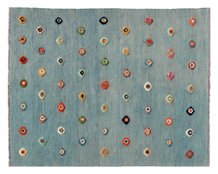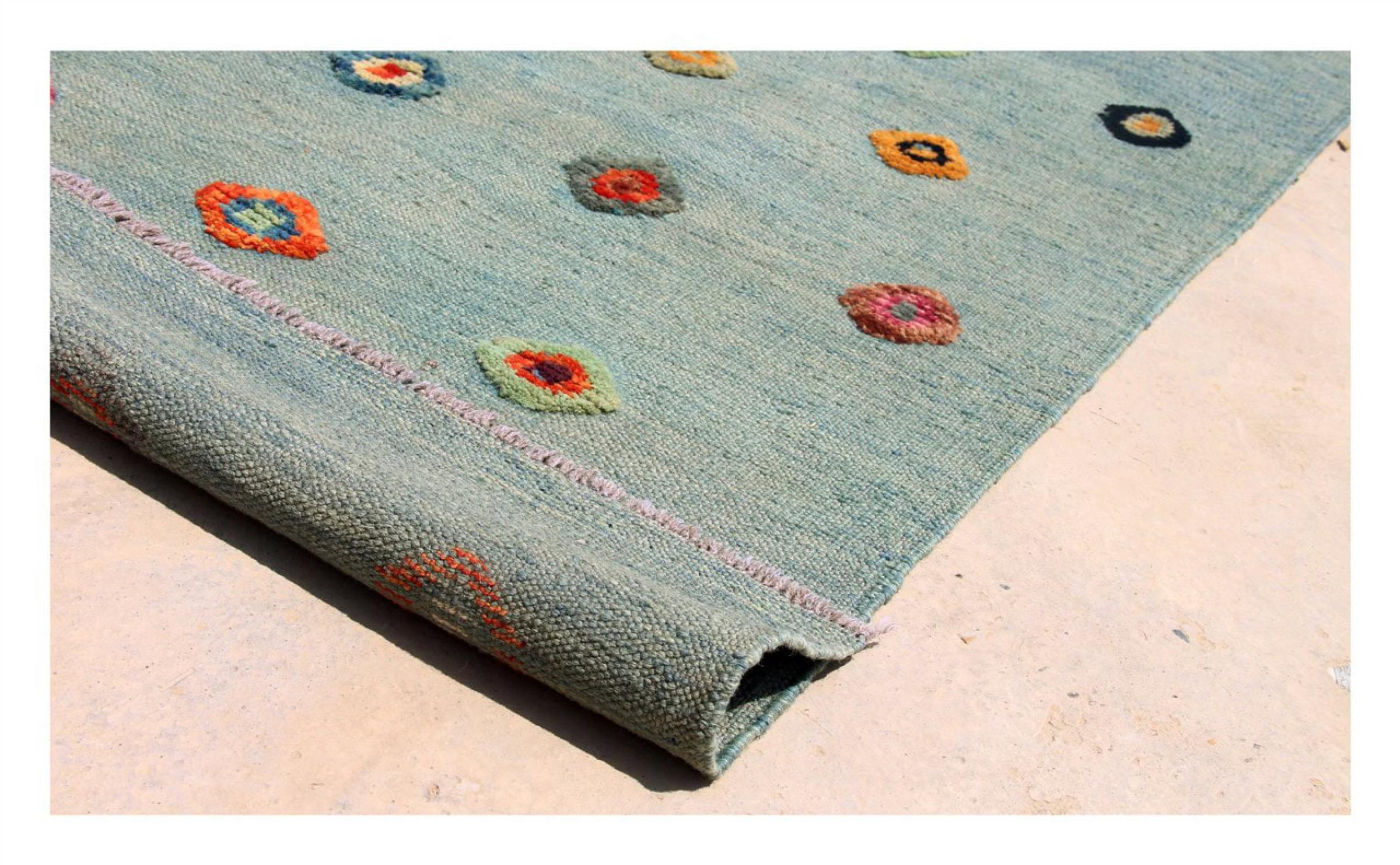 Esta alfombra fue hecha a mano en un telar como un tejido plano. Tejido plano es el término utilizado para describir las alfombras que no tienen pelo. Como el nombre promete, estas alfombras están tejidas y no anudadas. Esto resulta en una alfombra plana con una superficie estructurada. Los tejidos planos no son tan suaves y normalmente más delgados que las alfombras anudadas. Al mismo tiempo, su fabricación es mucho menos compleja y por lo general se pueden disponer por ambos lados (frontal y posterior). Sus patrones suelen ser geométricos, lo cual está determinado por el tejido.