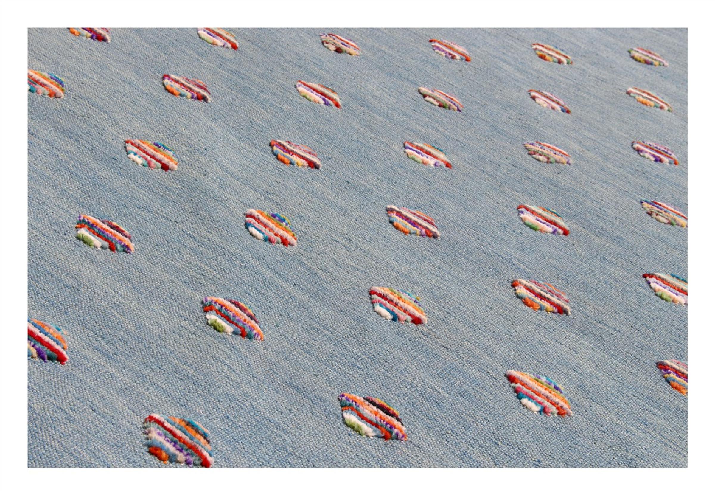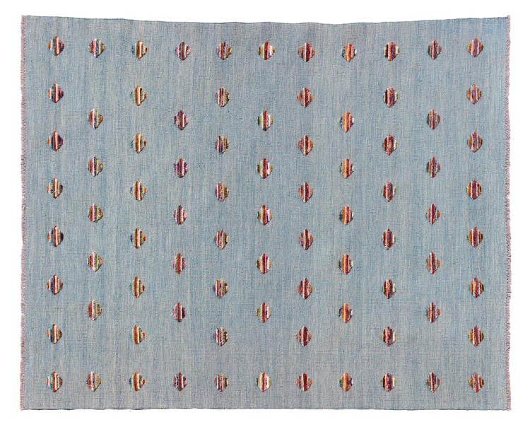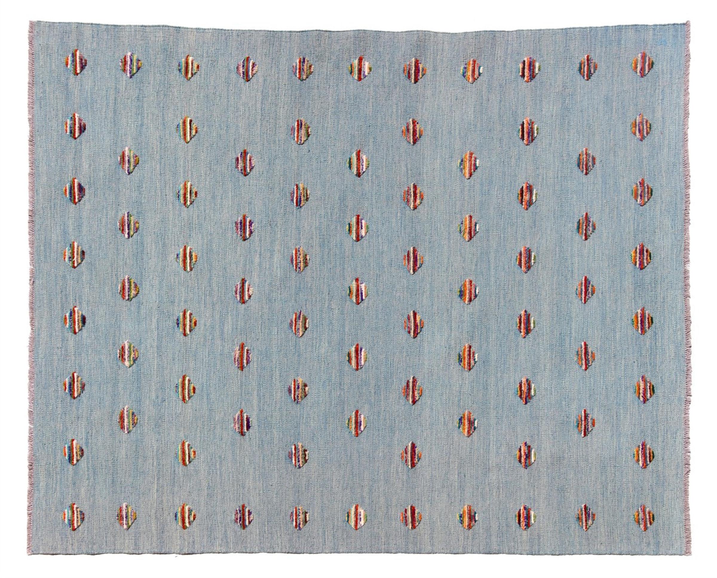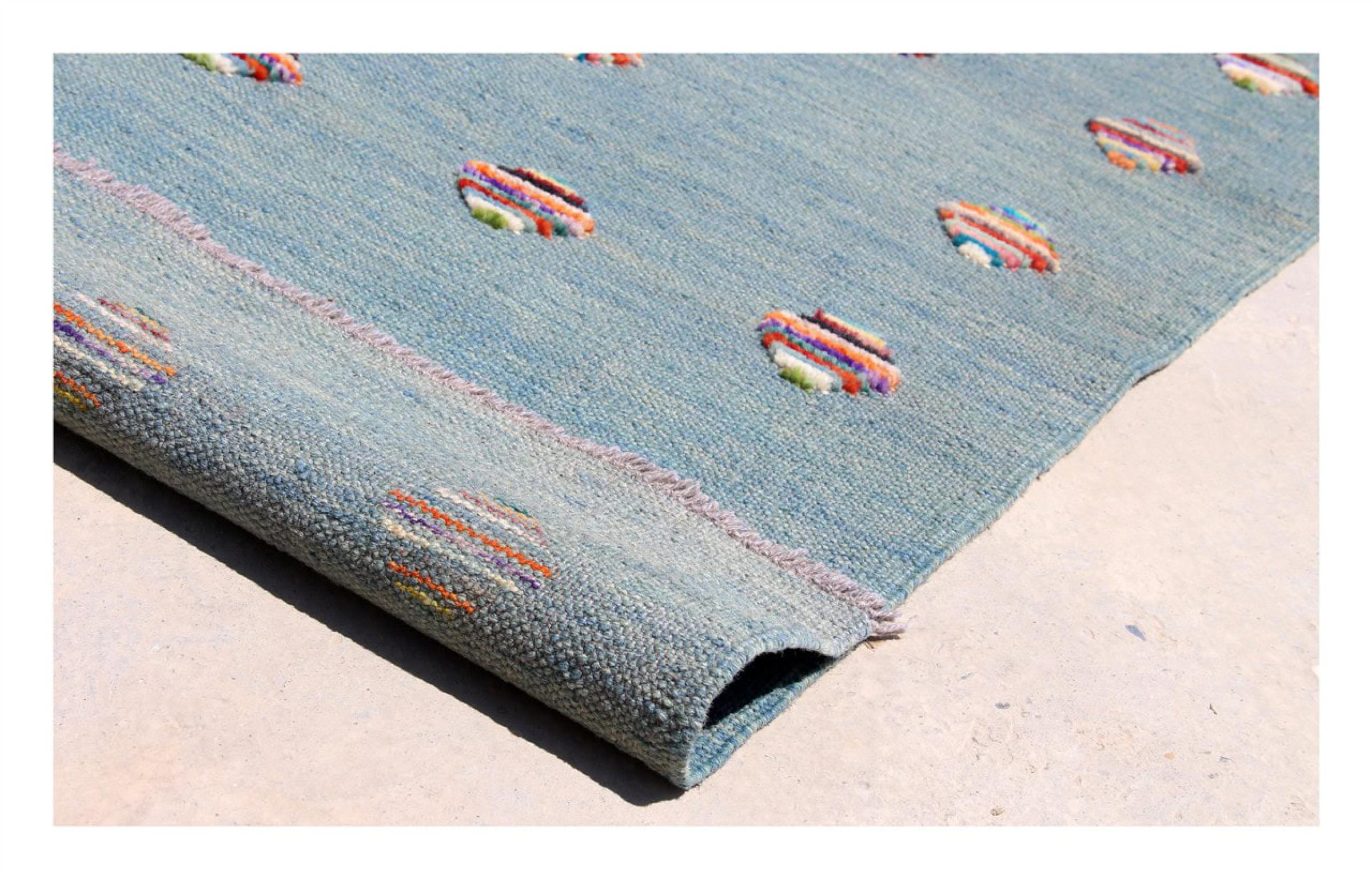 Esta alfombra fue hecha a mano en un telar como un tejido plano. Tejido plano es el término utilizado para describir las alfombras que no tienen pelo. Como el nombre promete, estas alfombras están tejidas y no anudadas. Esto resulta en una alfombra plana con una superficie estructurada. Los tejidos planos no son tan suaves y normalmente más delgados que las alfombras anudadas. Al mismo tiempo, su fabricación es mucho menos compleja y por lo general se pueden disponer por ambos lados (frontal y posterior). Sus patrones suelen ser geométricos, lo cual está determinado por el tejido.