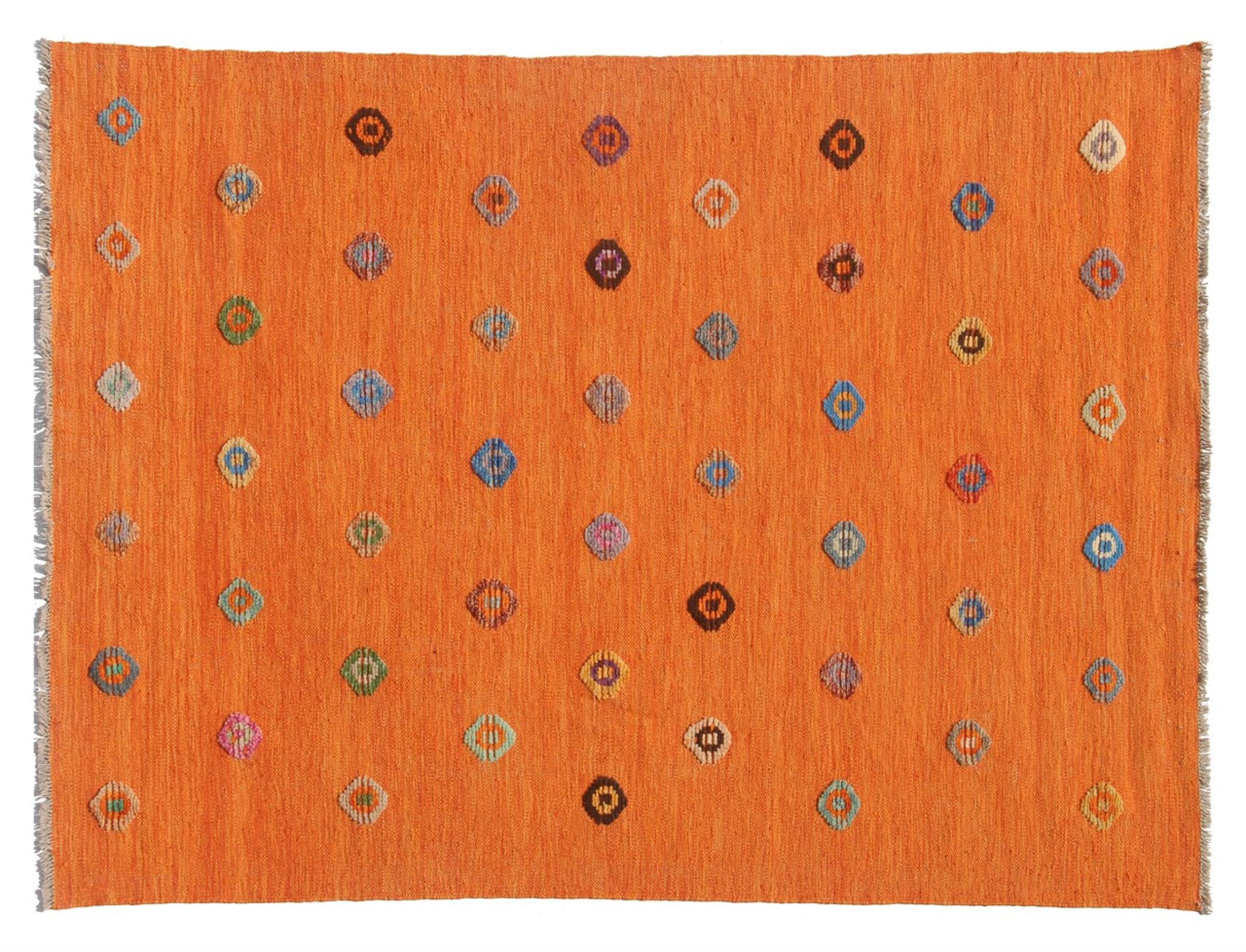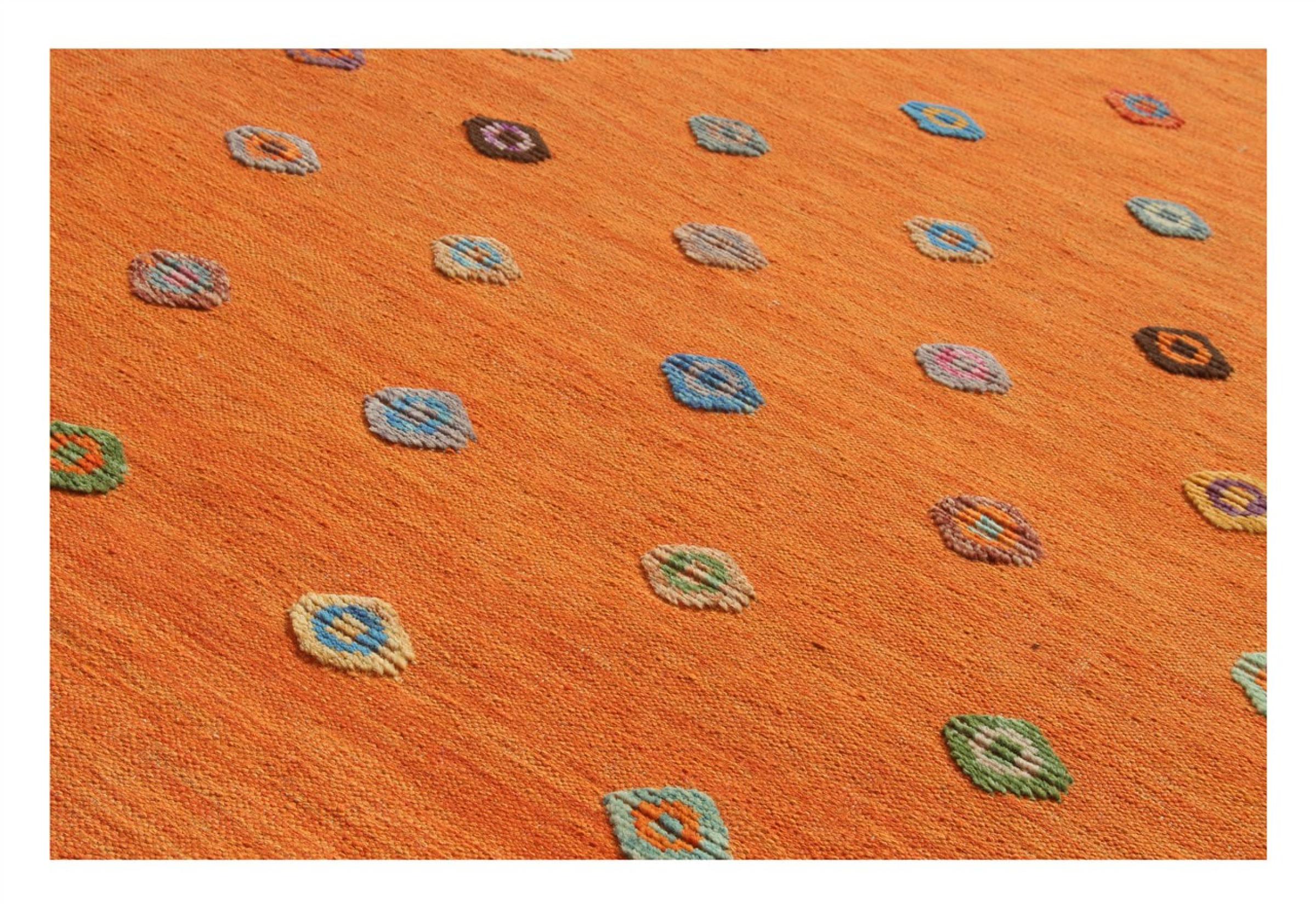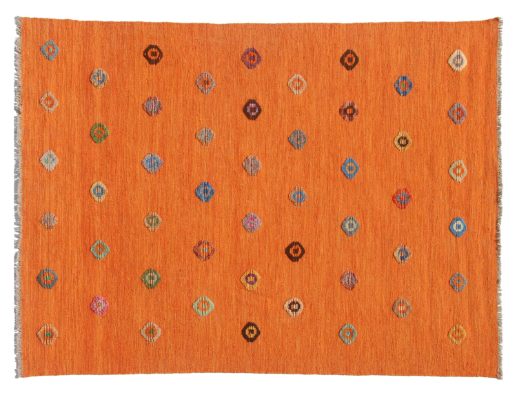 Esta alfombra fue hecha a mano en un telar como un tejido plano. Tejido plano es el término utilizado para describir las alfombras que no tienen pelo. Como el nombre promete, estas alfombras están tejidas y no anudadas. Esto resulta en una alfombra plana con una superficie estructurada. Los tejidos planos no son tan suaves y normalmente más delgados que las alfombras anudadas. Al mismo tiempo, su fabricación es mucho menos compleja y por lo general se pueden disponer por ambos lados (frontal y posterior). Sus patrones suelen ser geométricos, lo cual está determinado por el tejido.