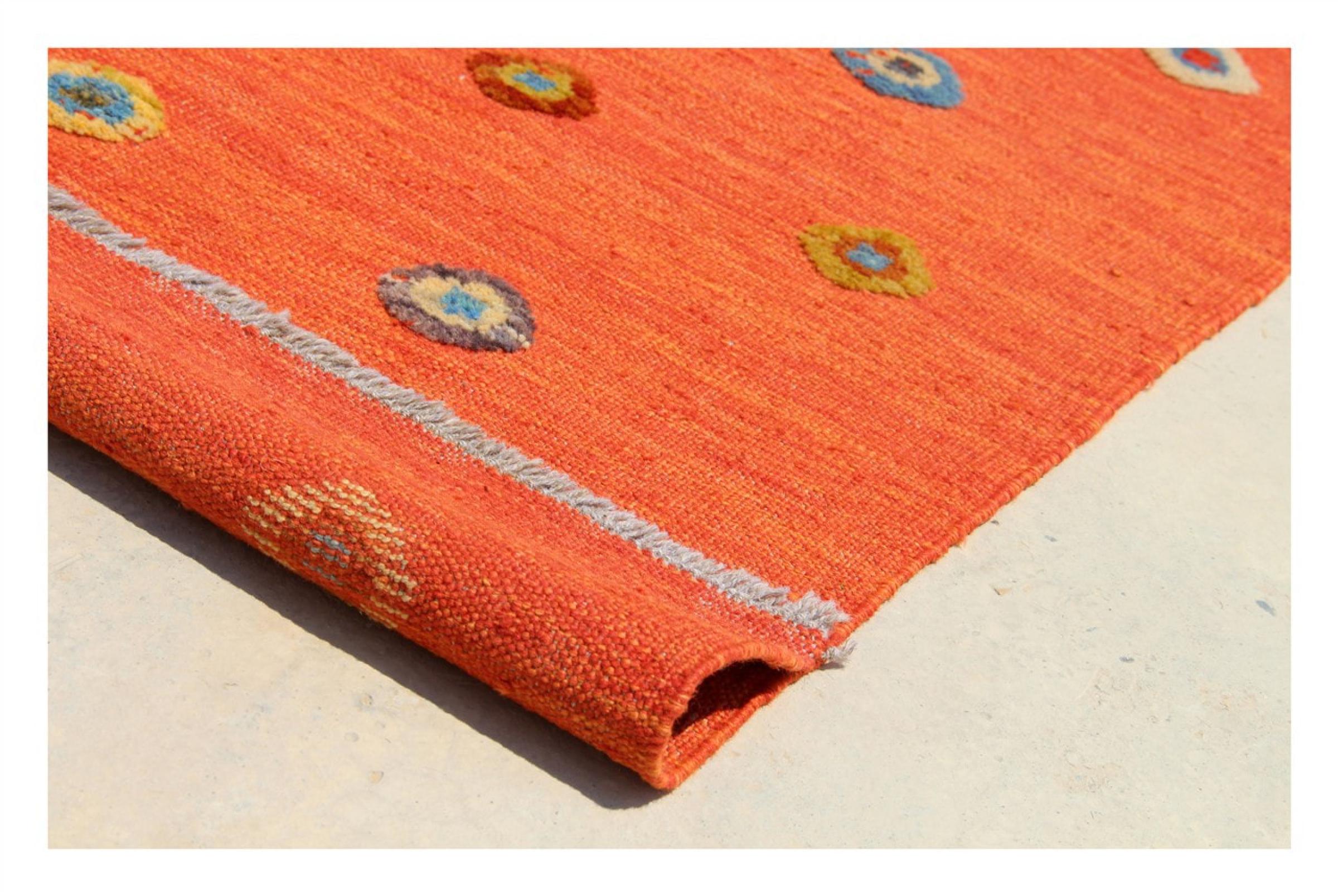 Esta alfombra fue hecha a mano en un telar como un tejido plano. Tejido plano es el término utilizado para describir las alfombras que no tienen pelo. Como el nombre promete, estas alfombras están tejidas y no anudadas. Esto resulta en una alfombra plana con una superficie estructurada. Los tejidos planos no son tan suaves y normalmente más delgados que las alfombras anudadas. Al mismo tiempo, su fabricación es mucho menos compleja y por lo general se pueden disponer por ambos lados (frontal y posterior). Sus patrones suelen ser geométricos, lo cual está determinado por el tejido.